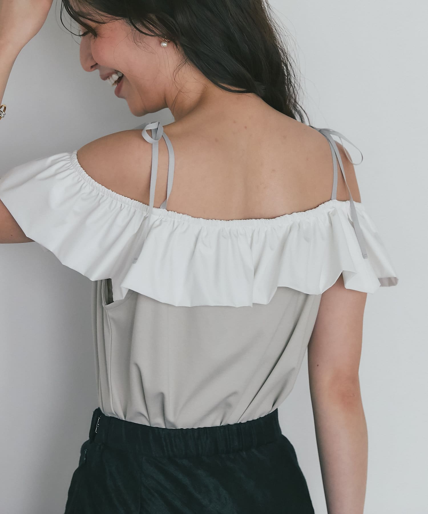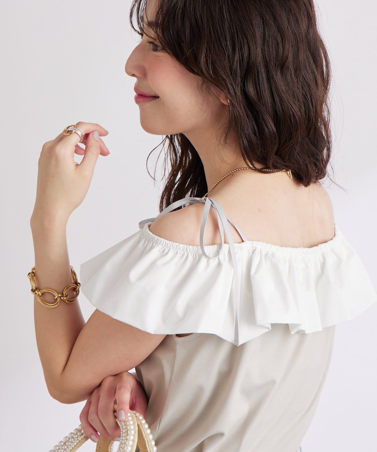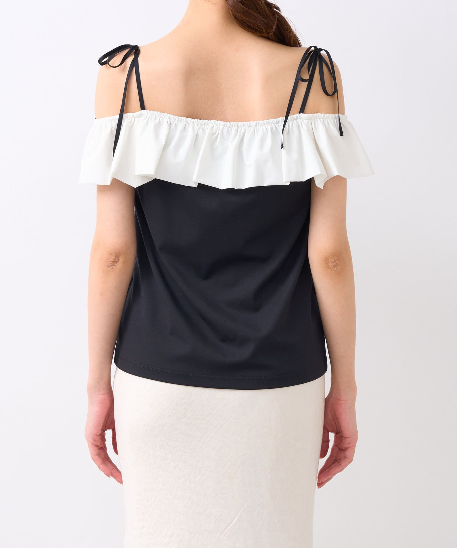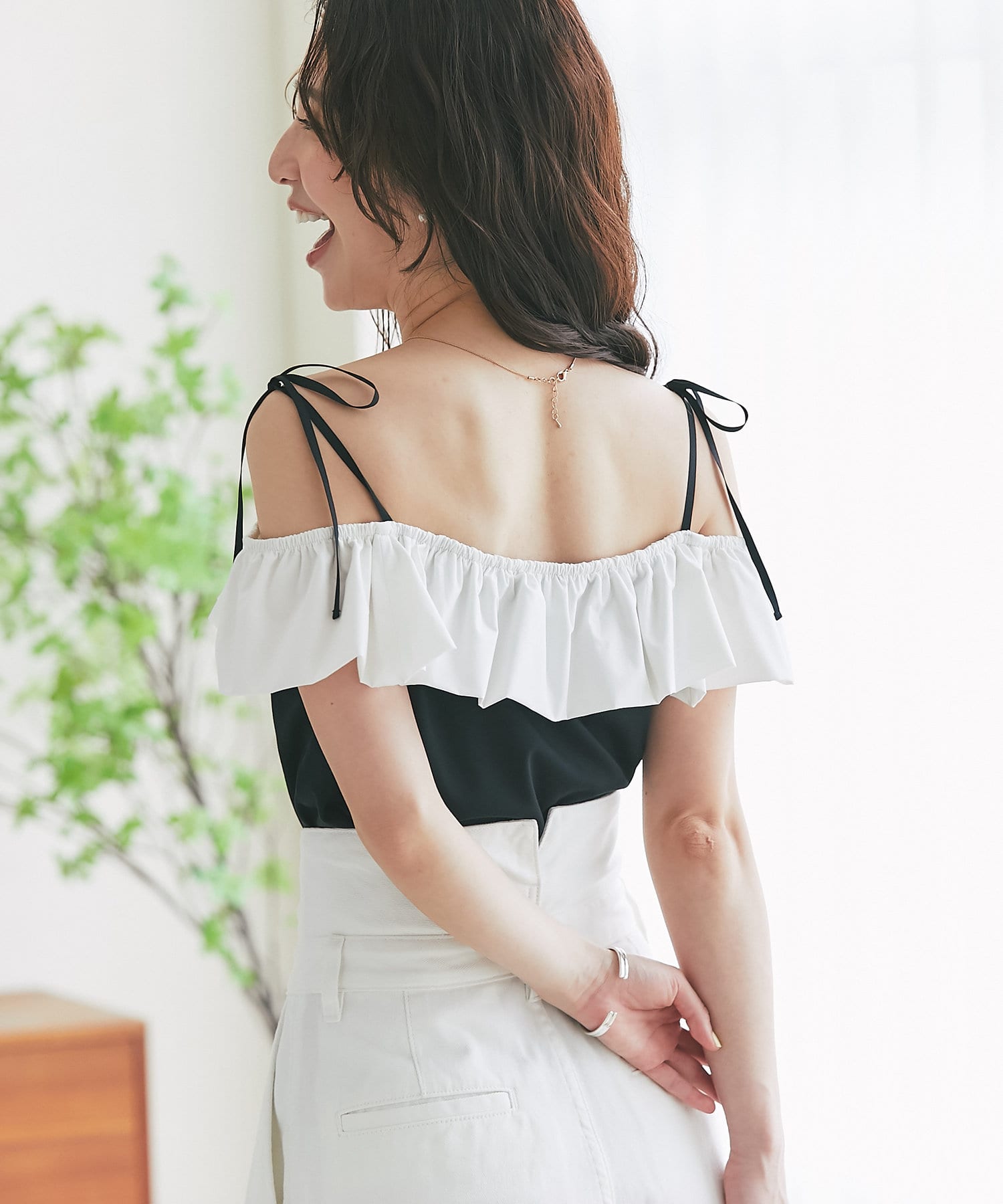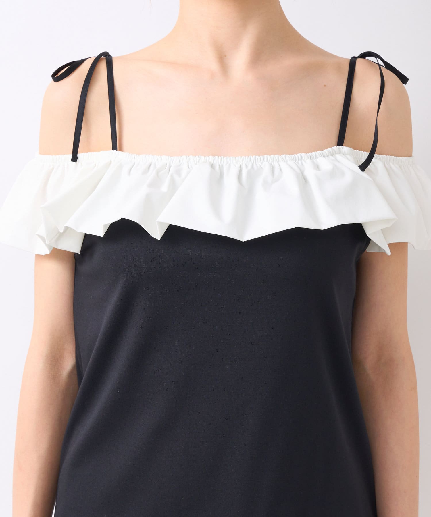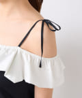 配色、異素材のフリルは目を引くデザインポイントで肩ひもの細いリボンが華奢見え効果も。