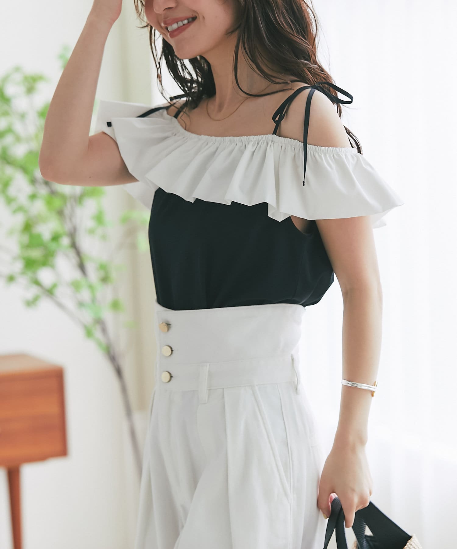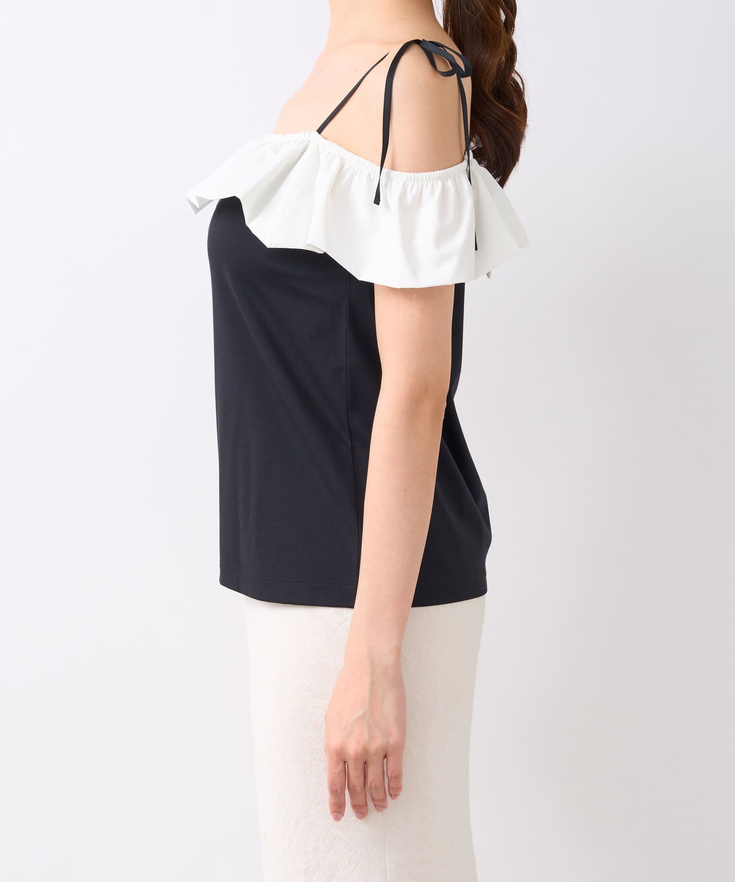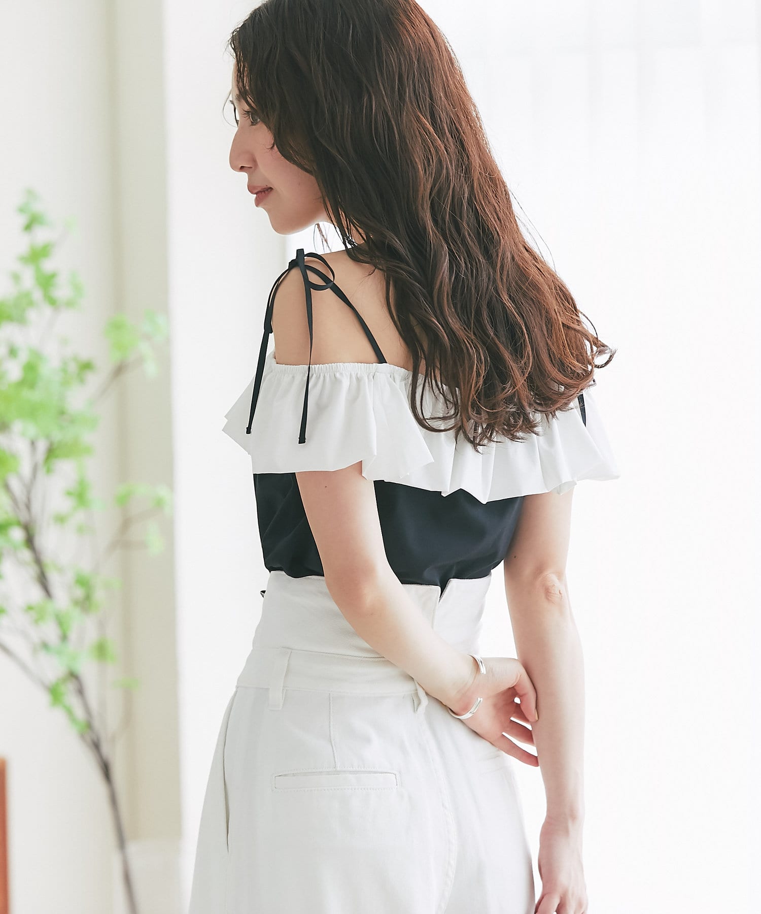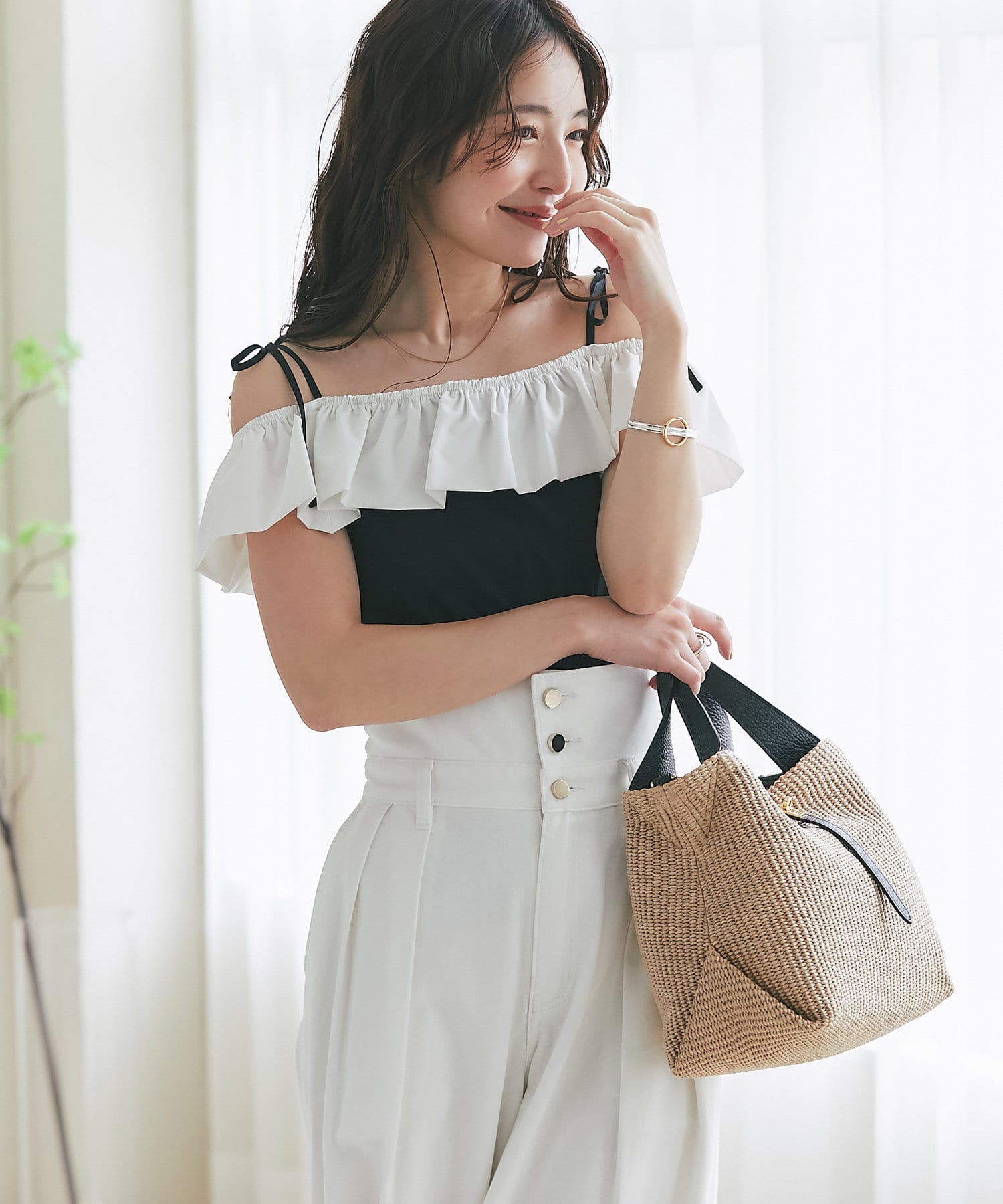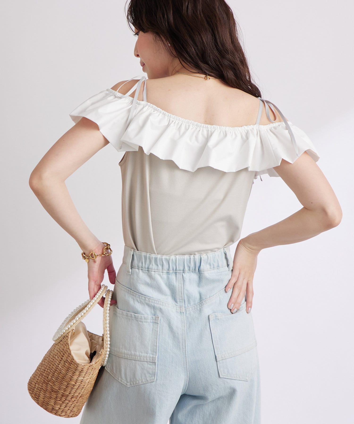 配色、異素材のフリルは目を引くデザインポイントで肩ひもの細いリボンが華奢見え効果も。