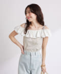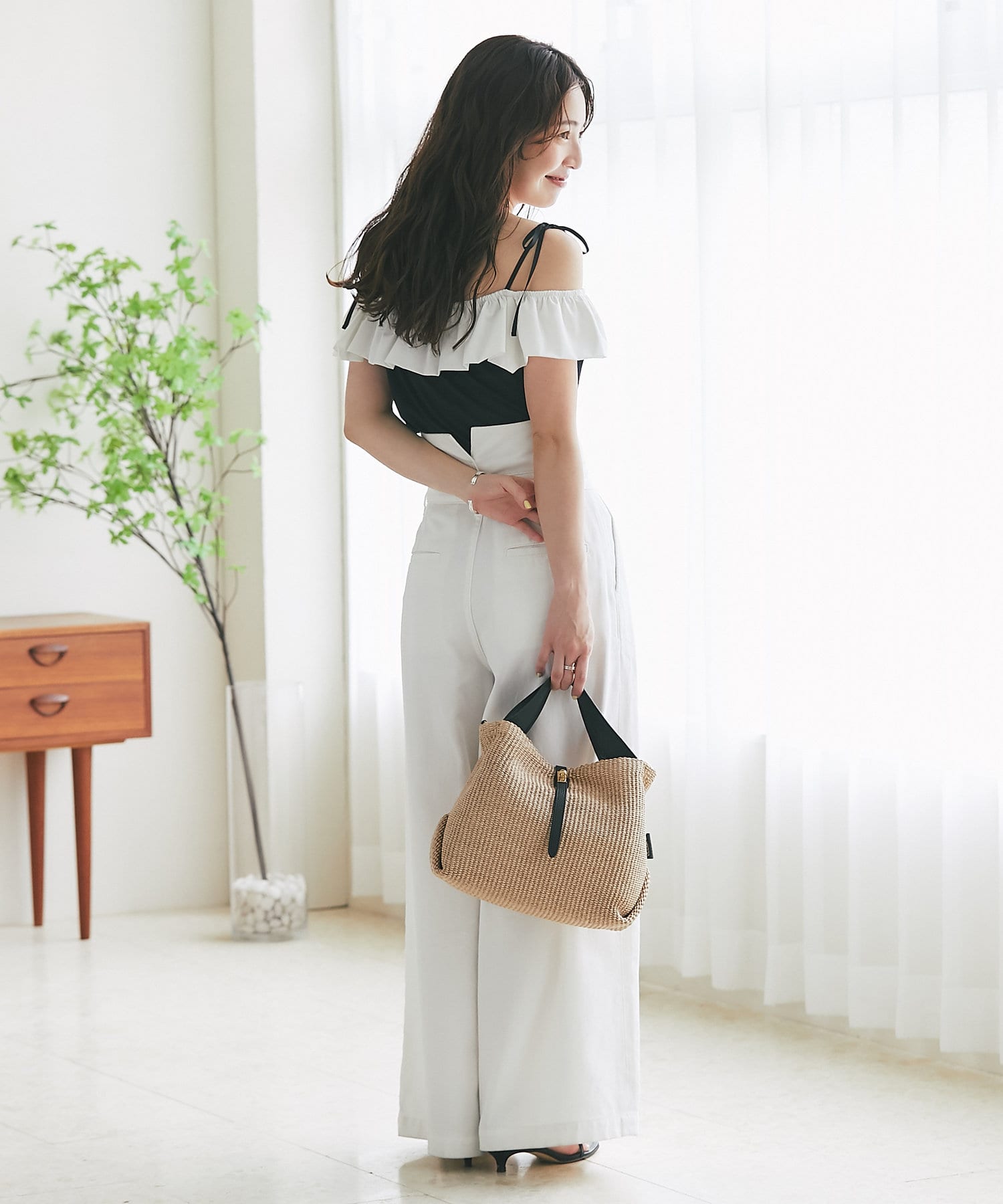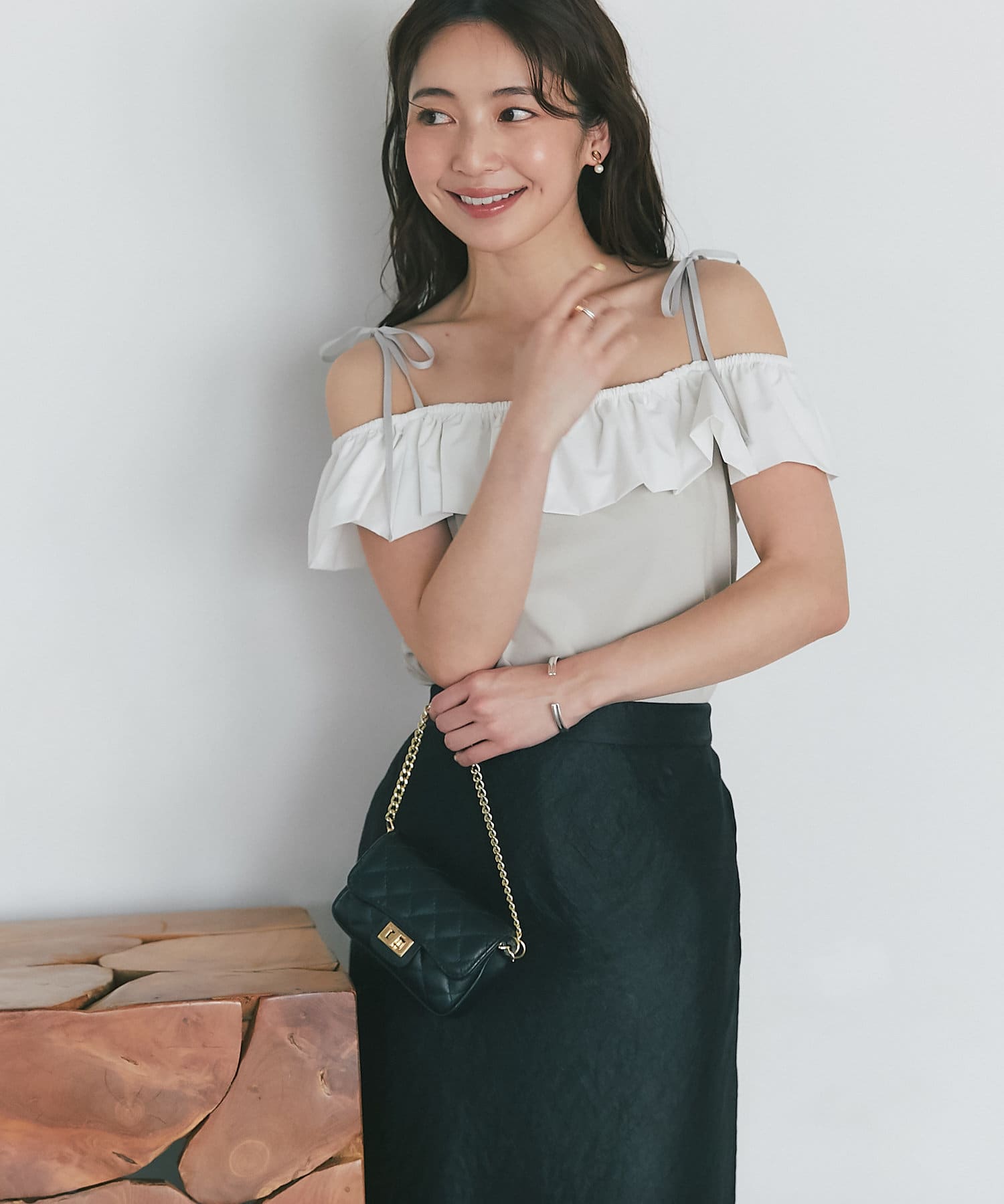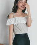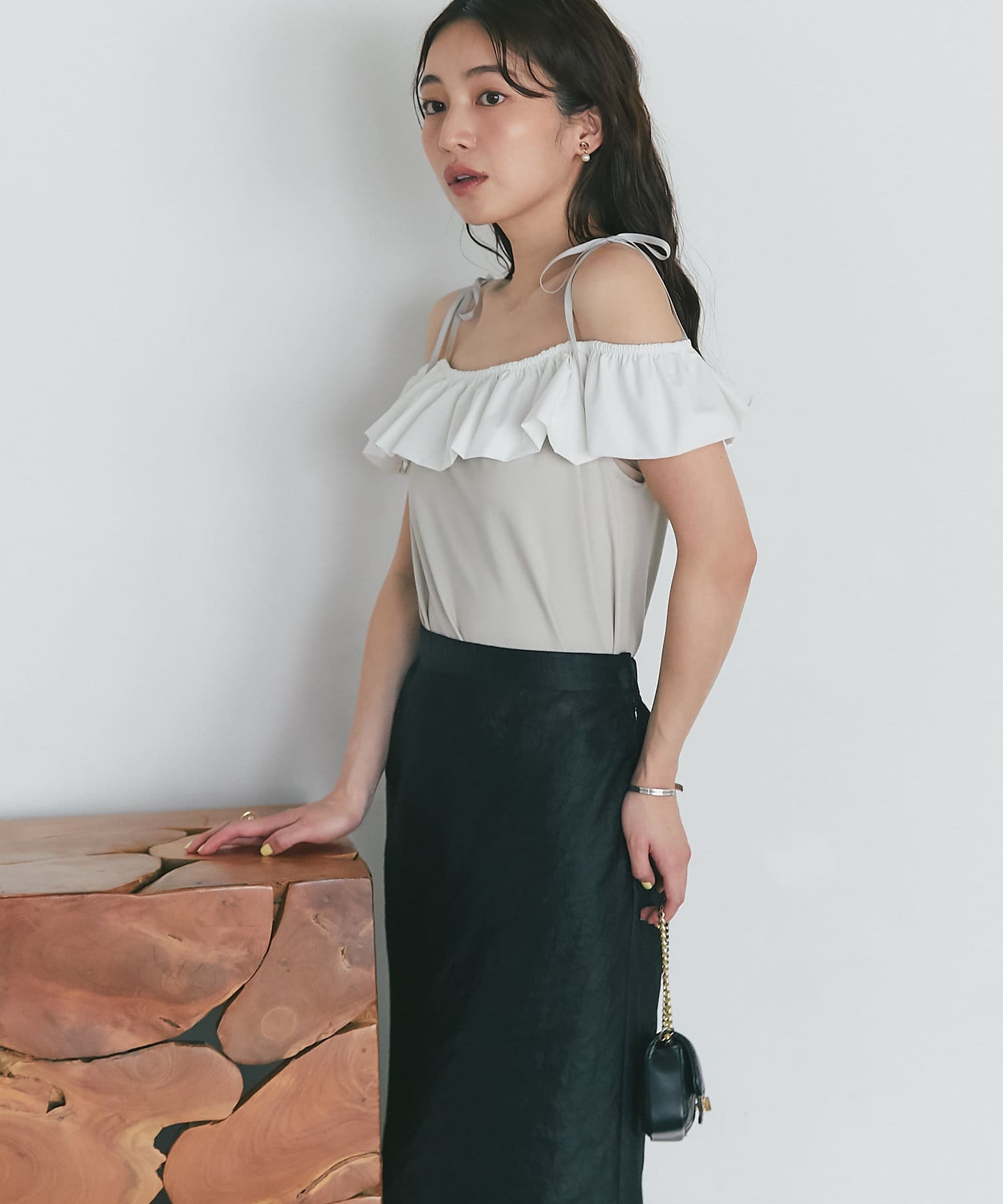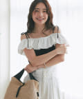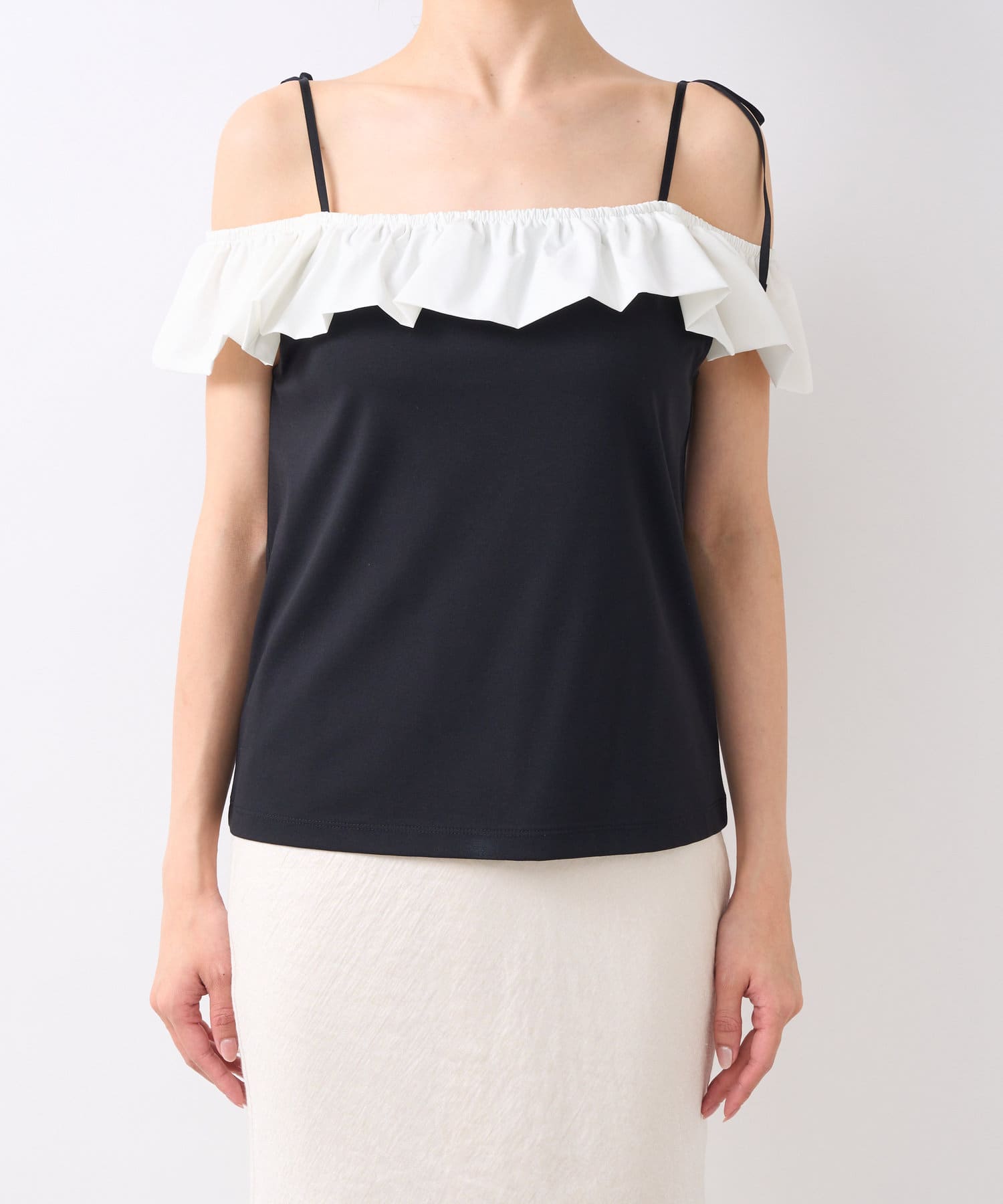 配色、異素材のフリルは目を引くデザインポイントで肩ひもの細いリボンが華奢見え効果も。