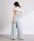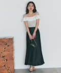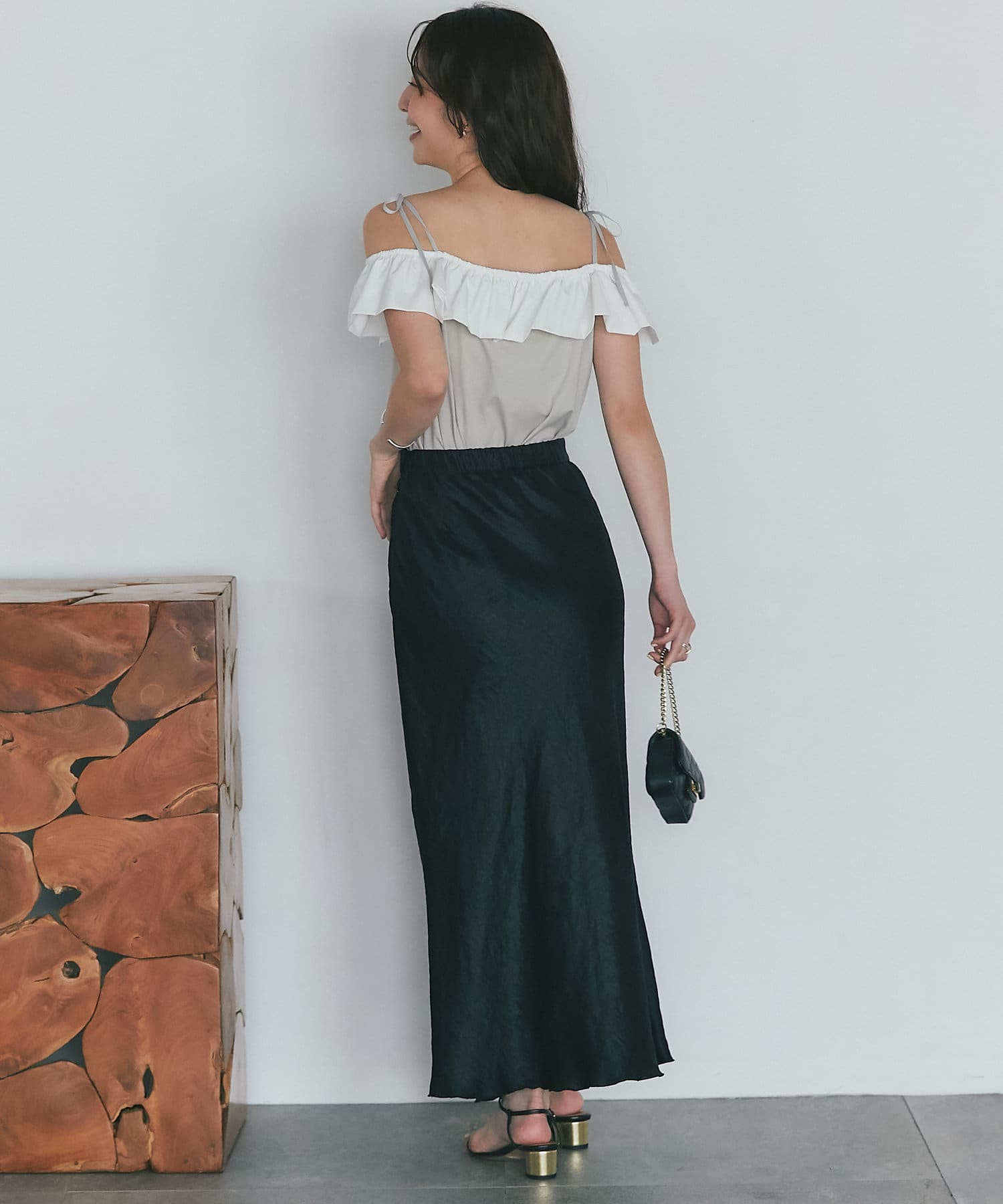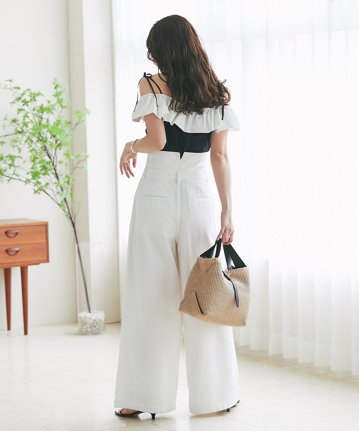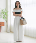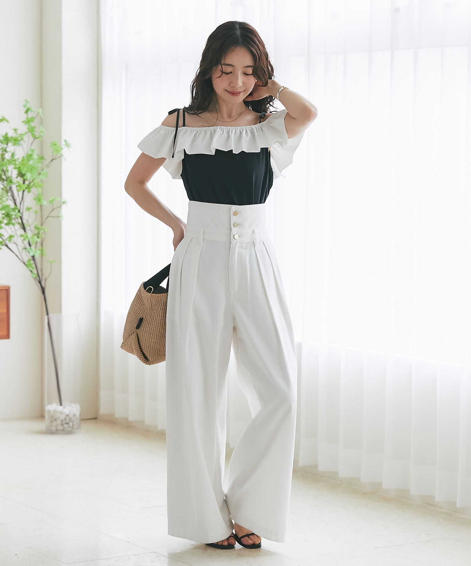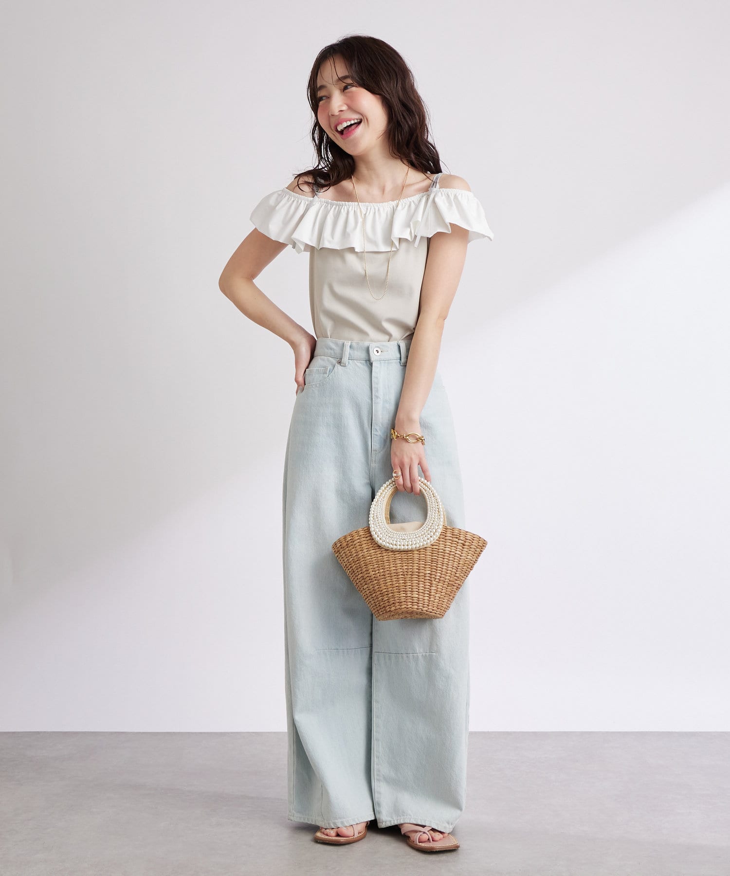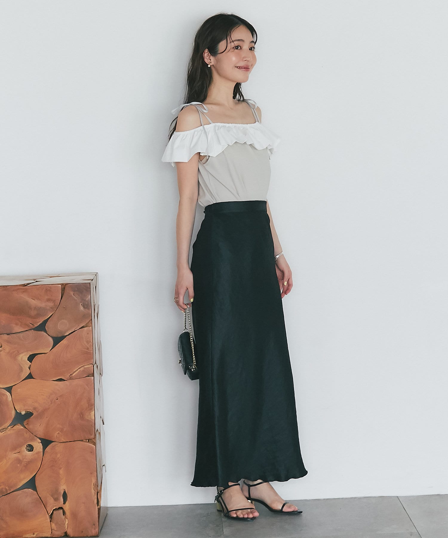 配色、異素材のフリルは目を引くデザインポイントで肩ひもの細いリボンが華奢見え効果も。