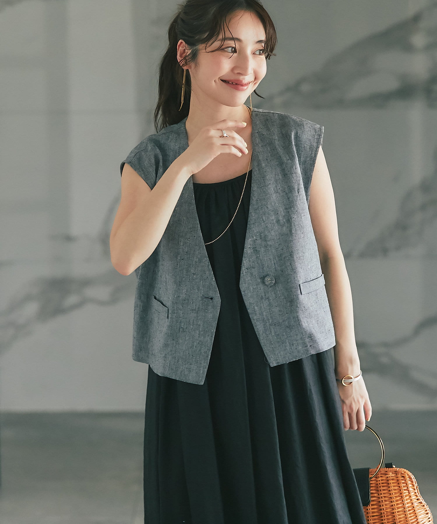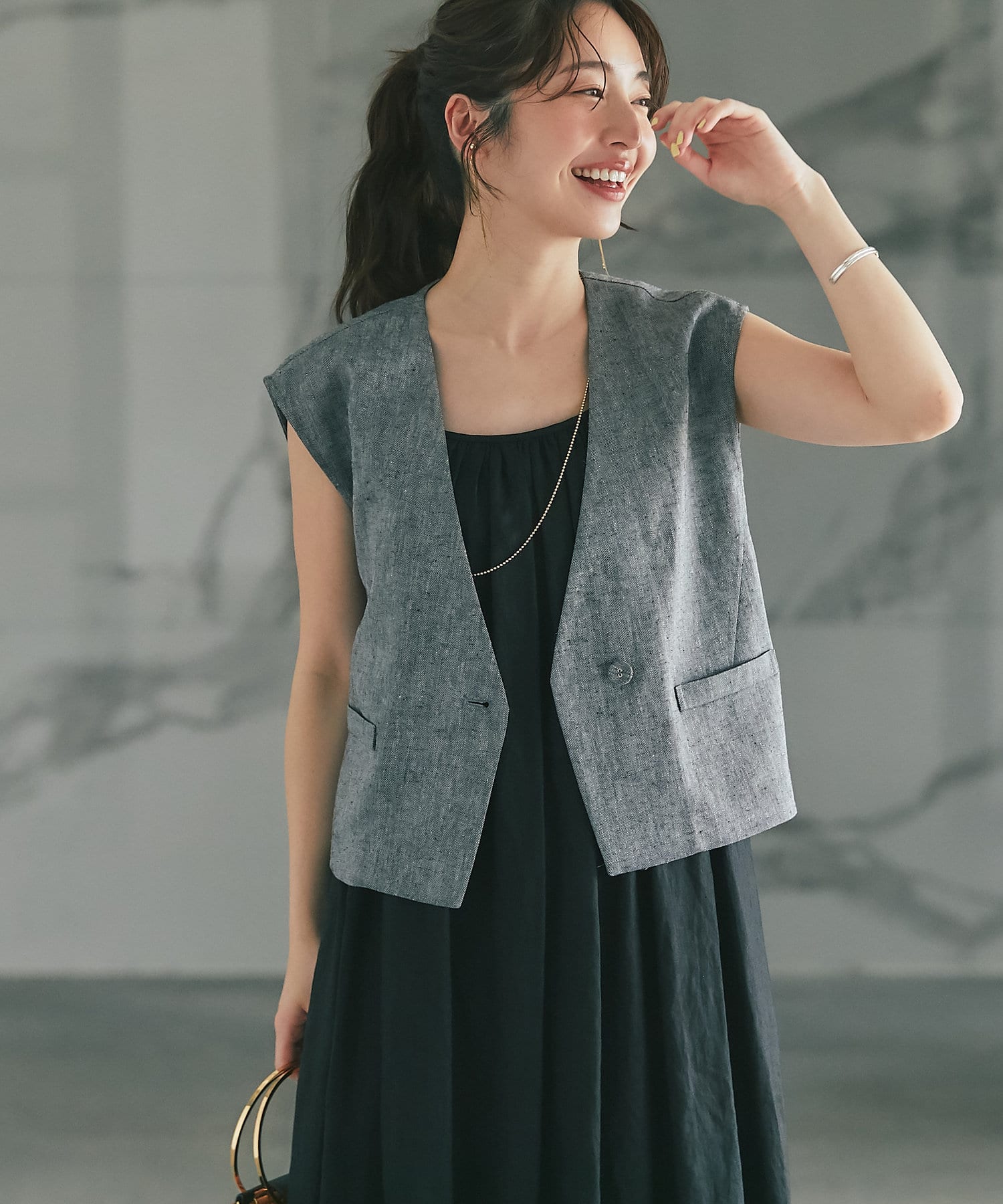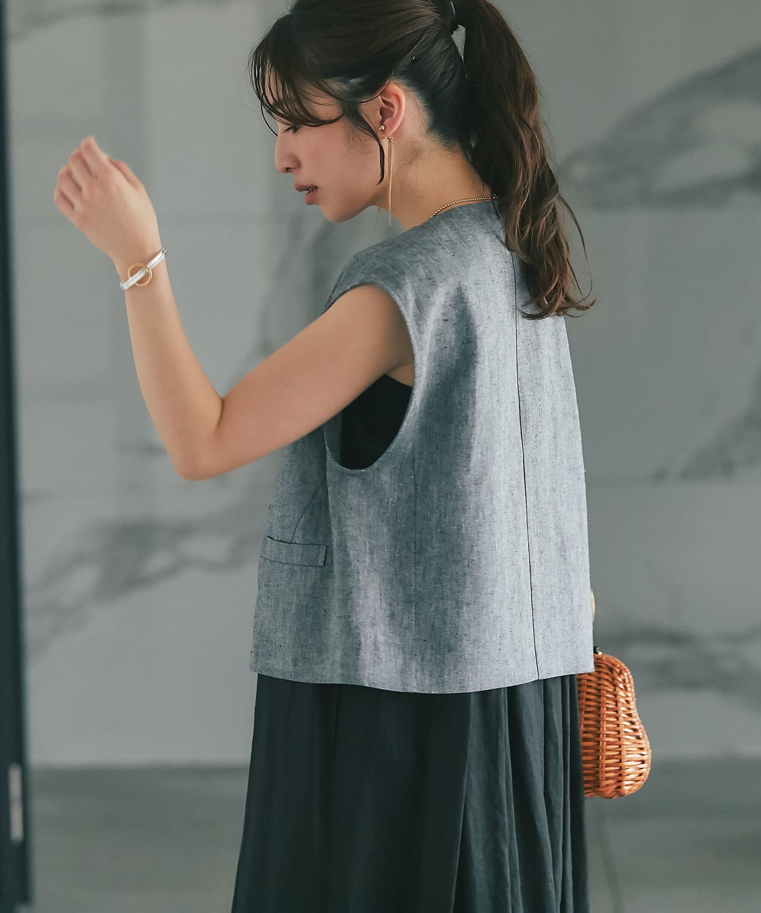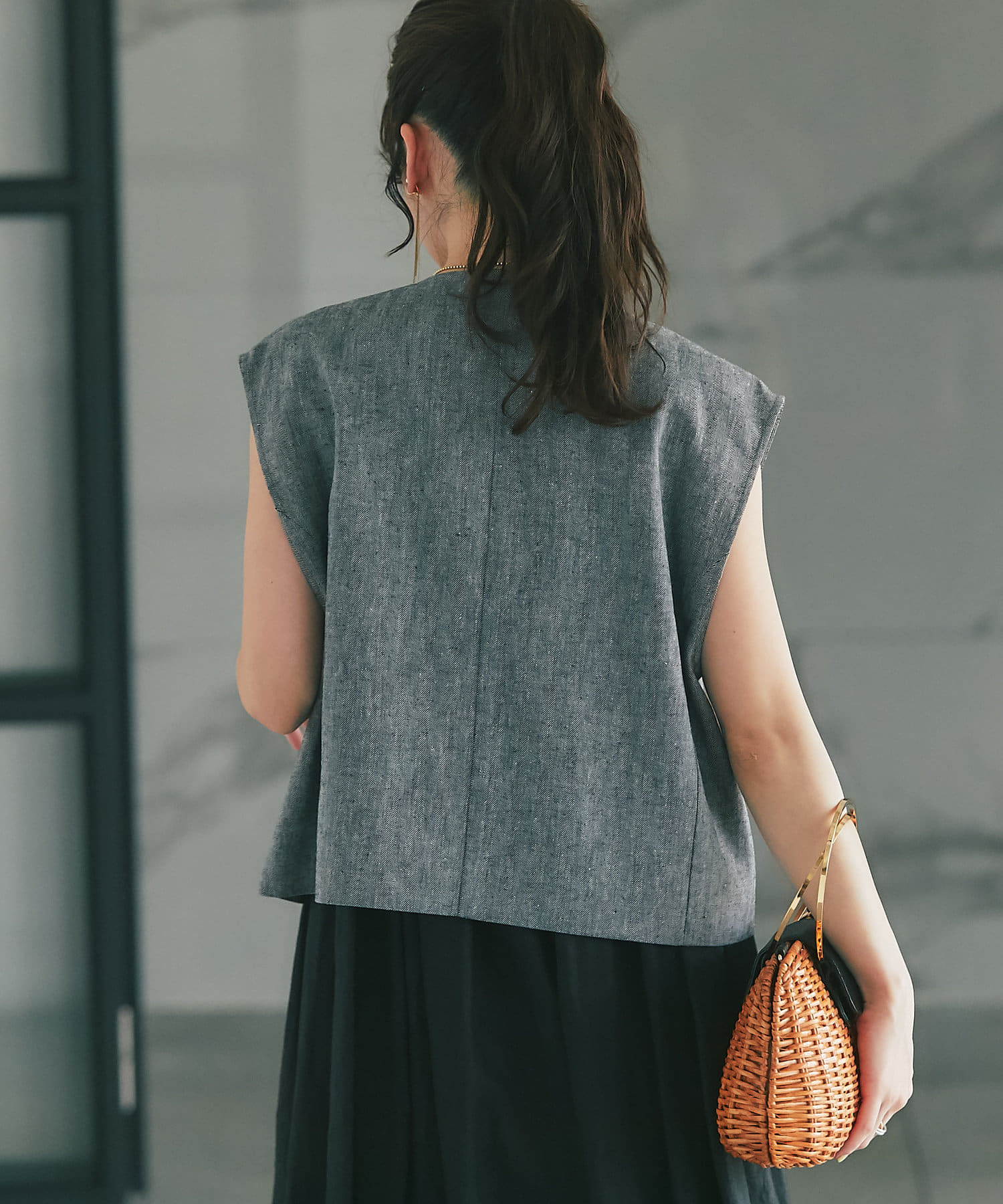 大人のこなれ感を演出するリネン混ノースリーブジャケット