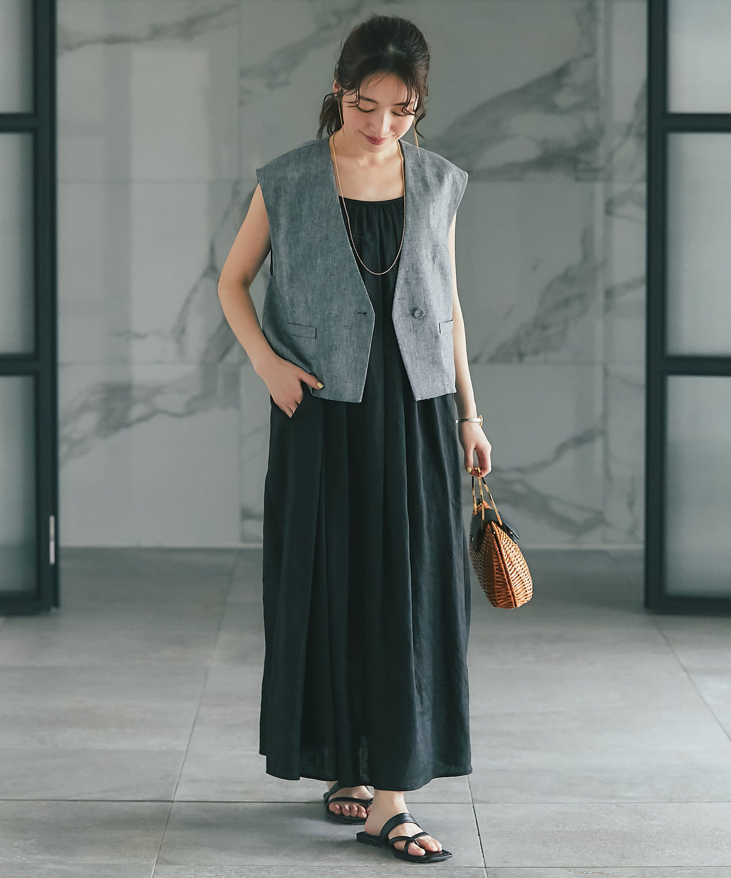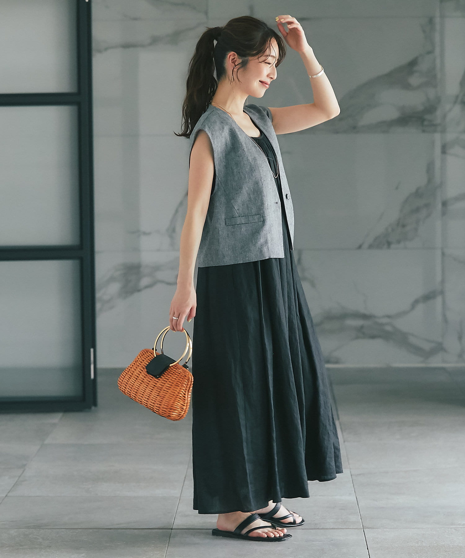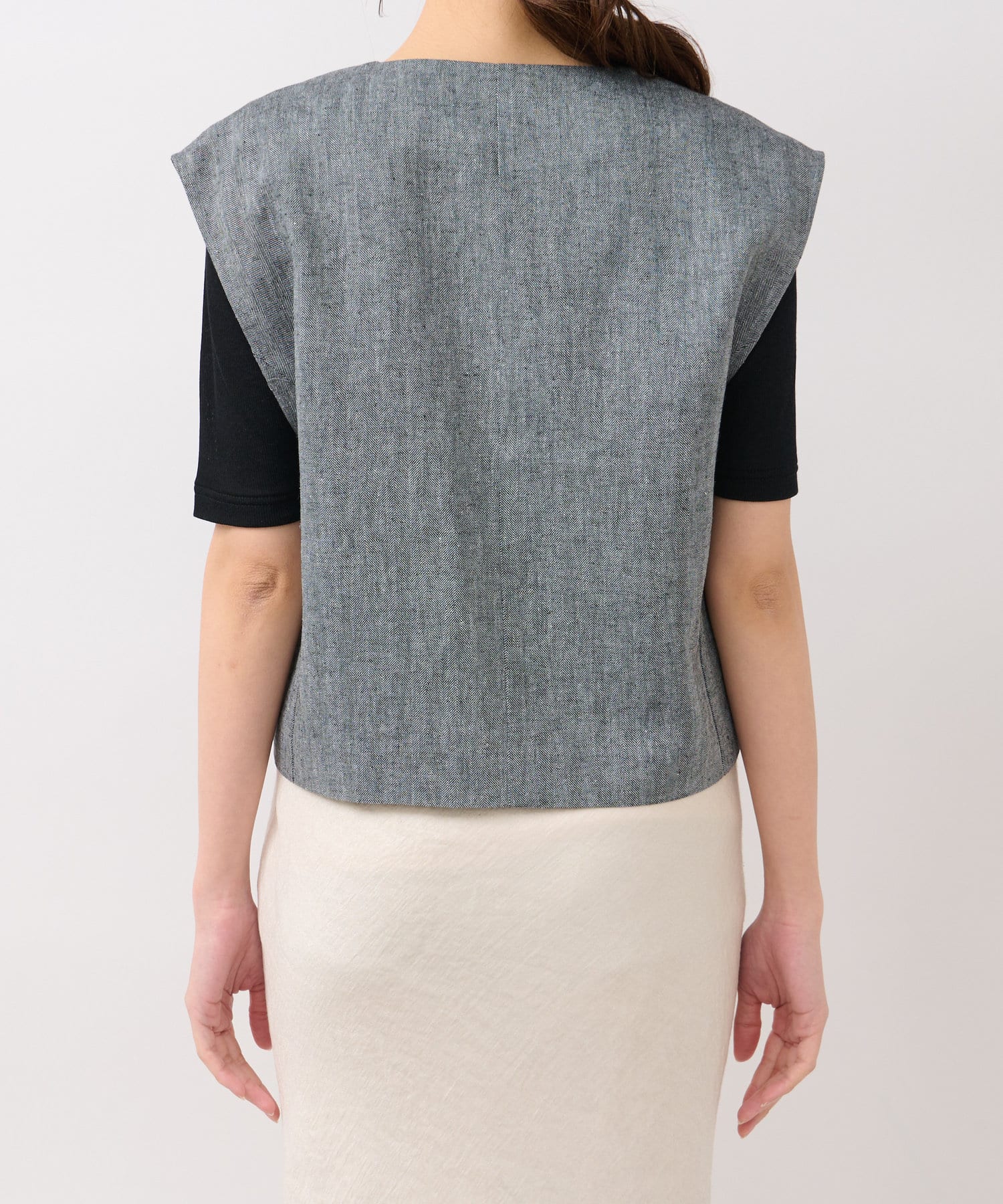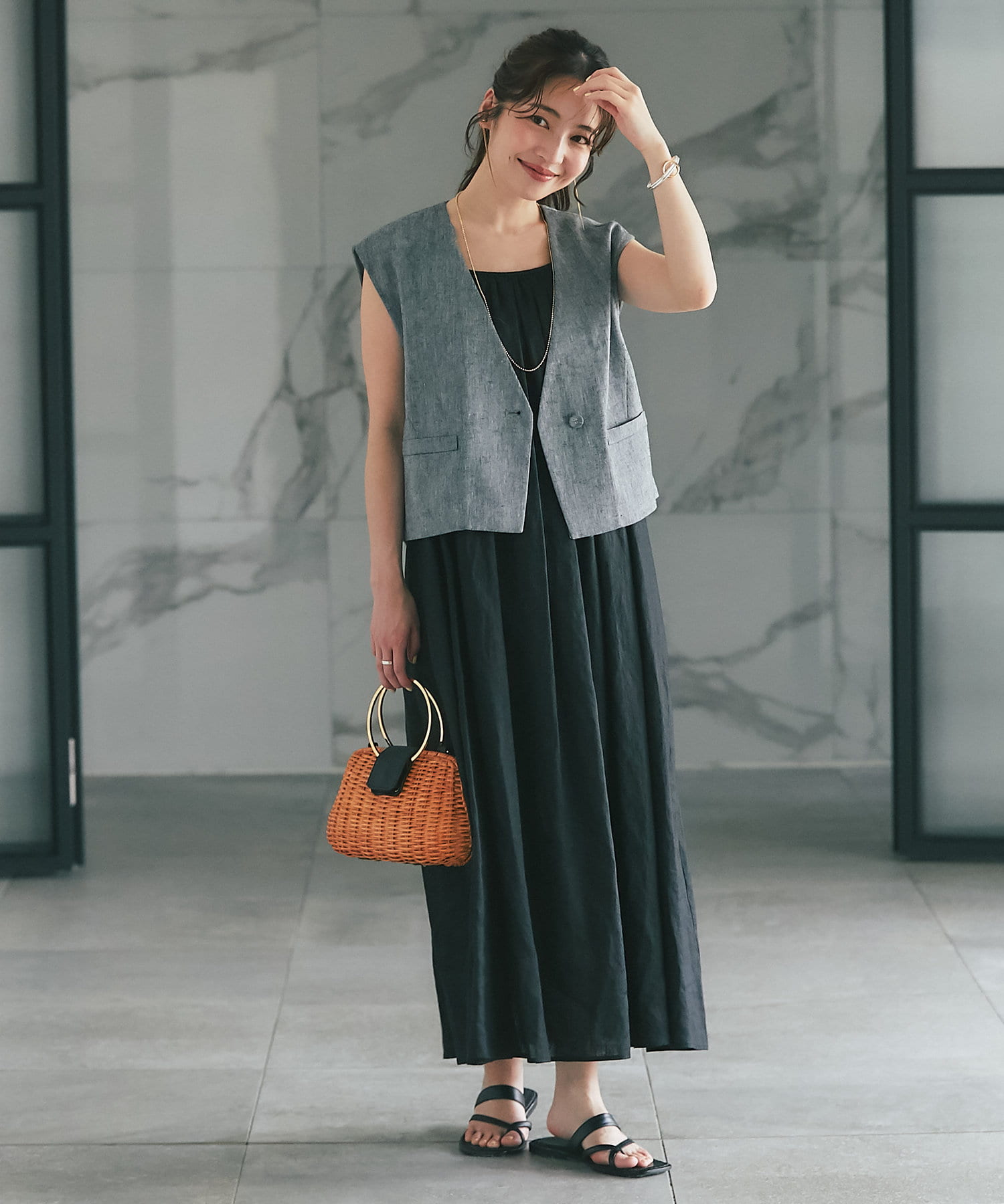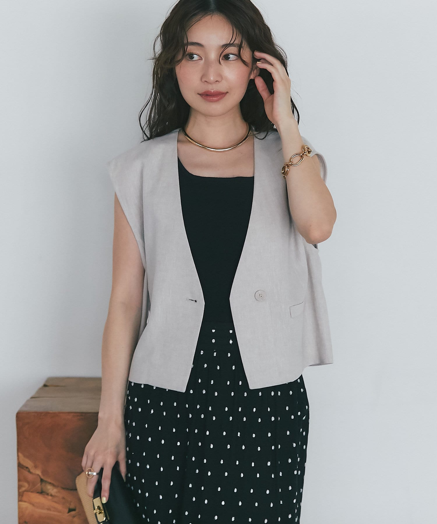 大人のこなれ感を演出するリネン混ノースリーブジャケット