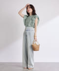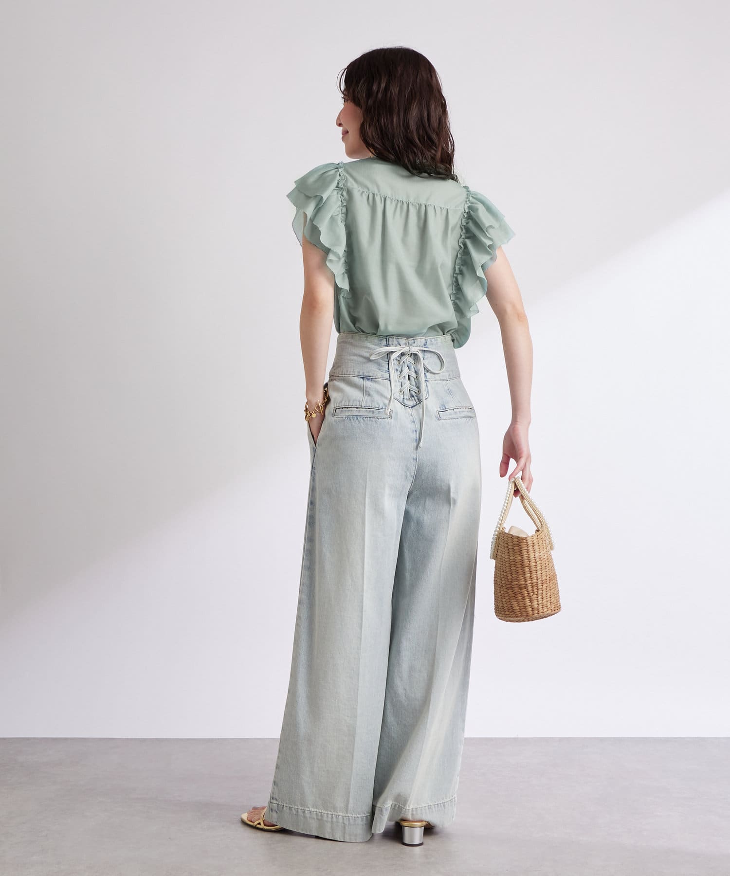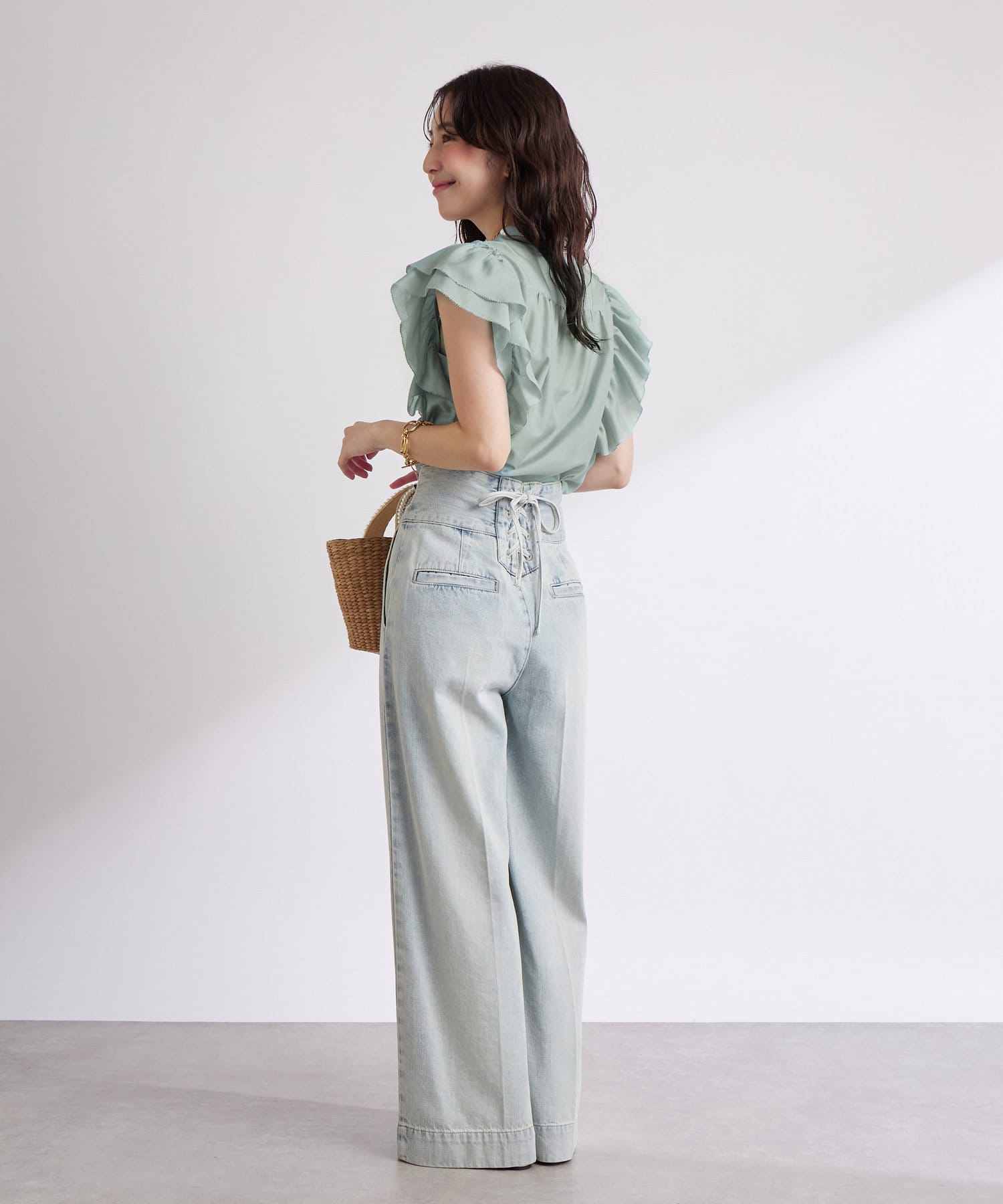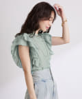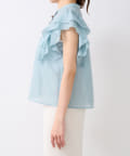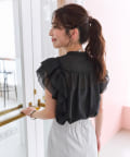 肩を飾るように大きくあしらわれたフリルが、女性らしい華やかな雰囲気を演出。