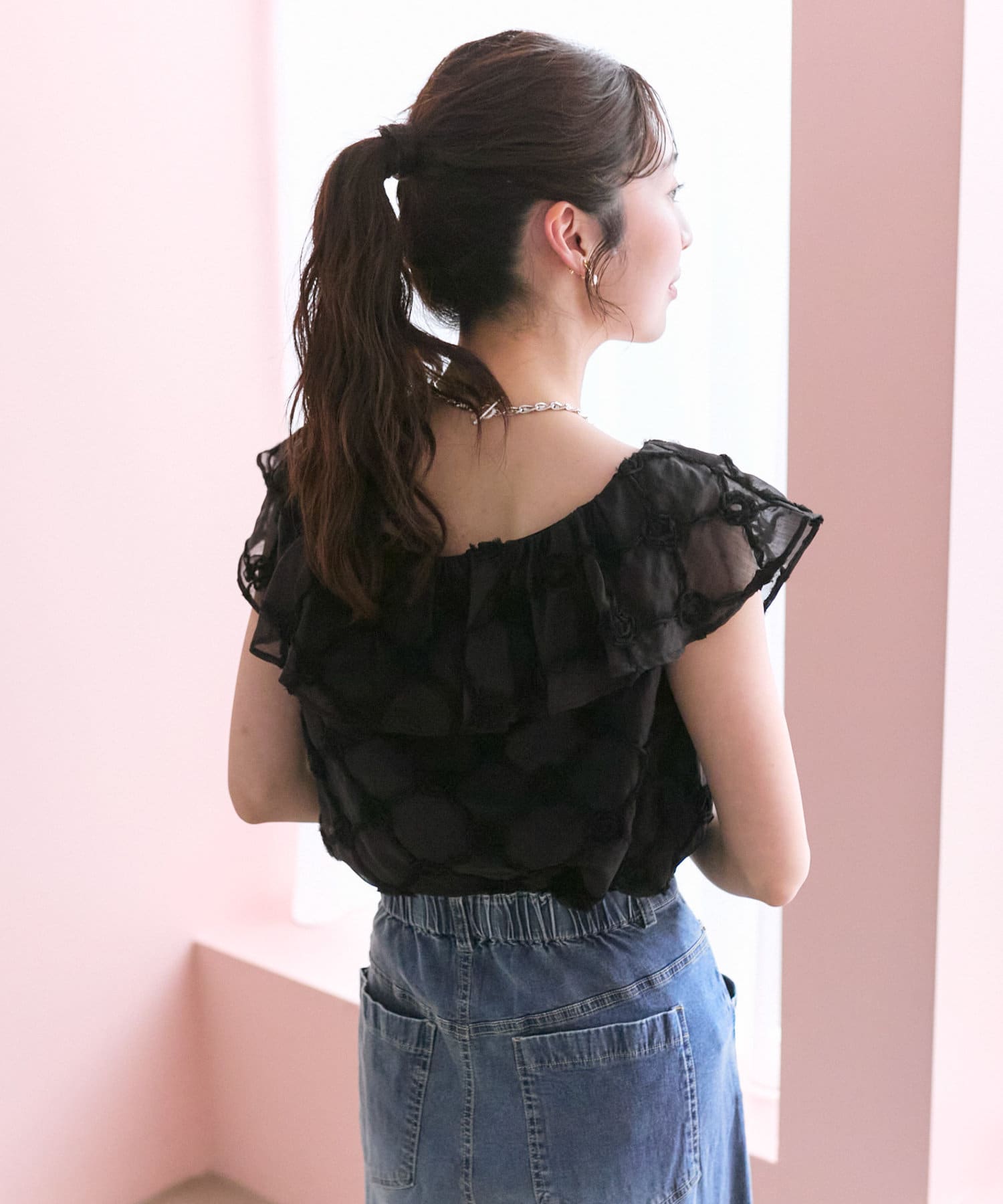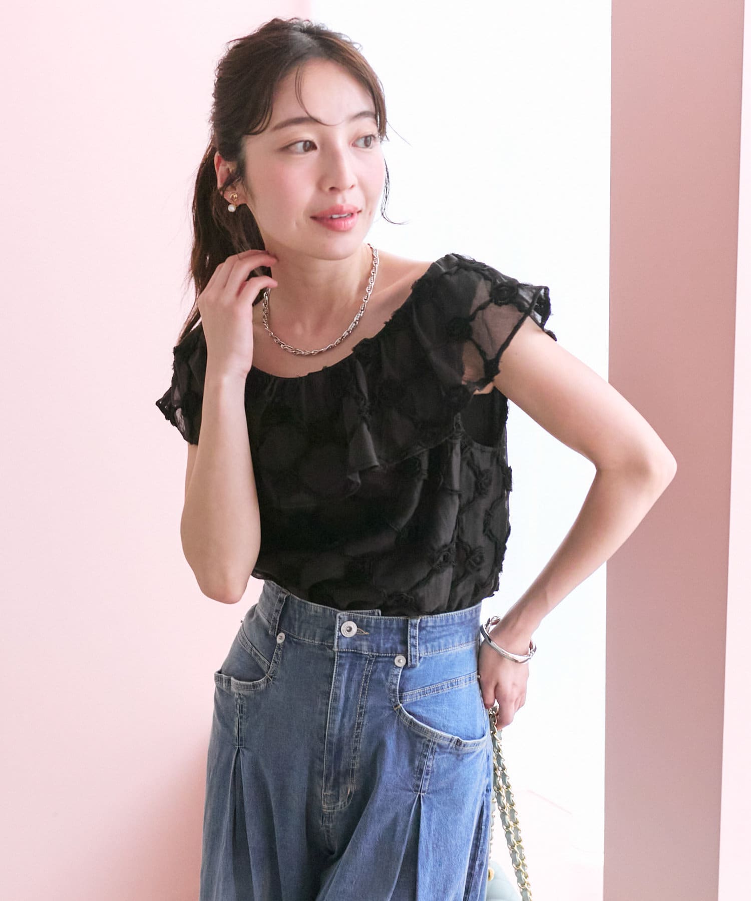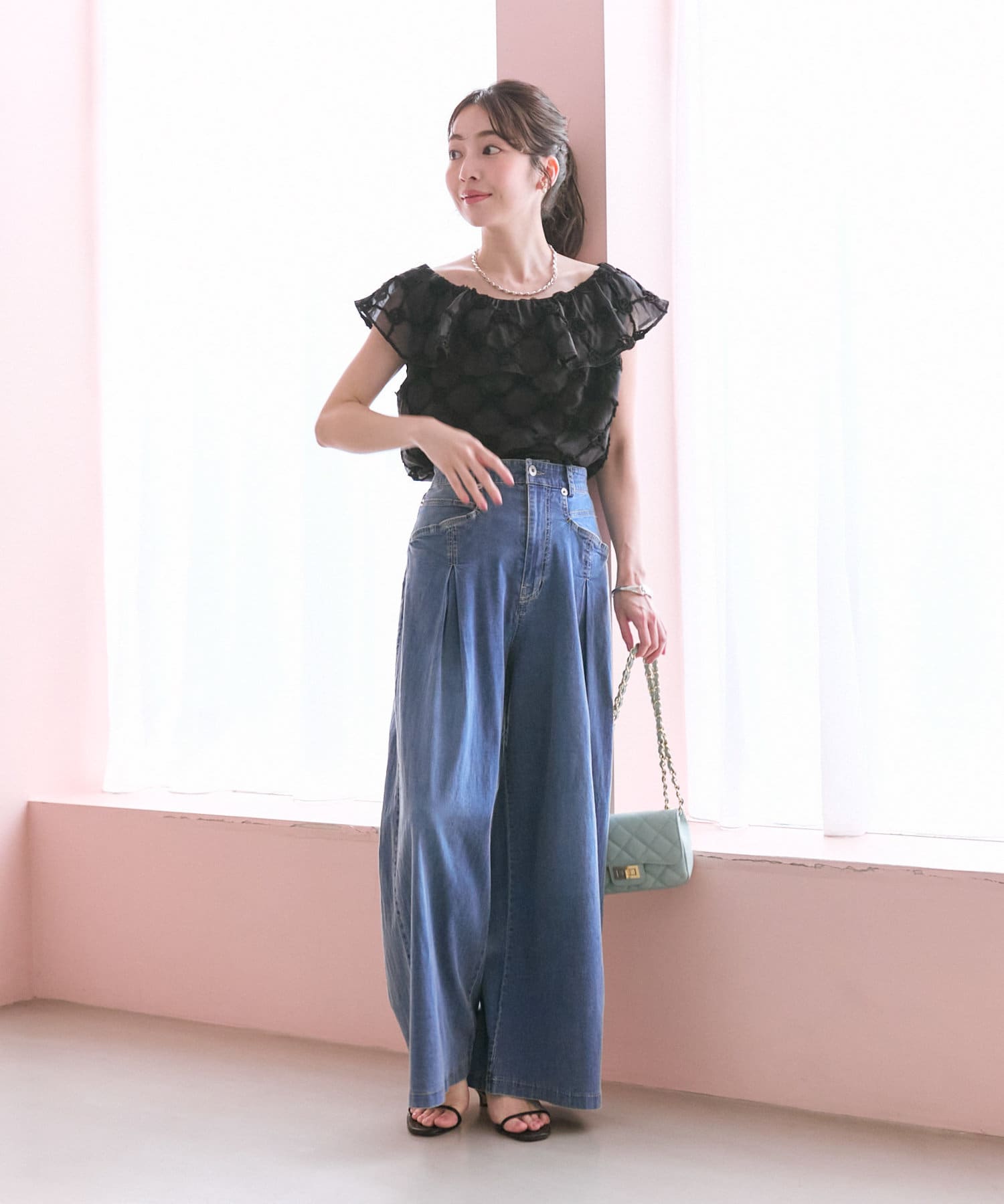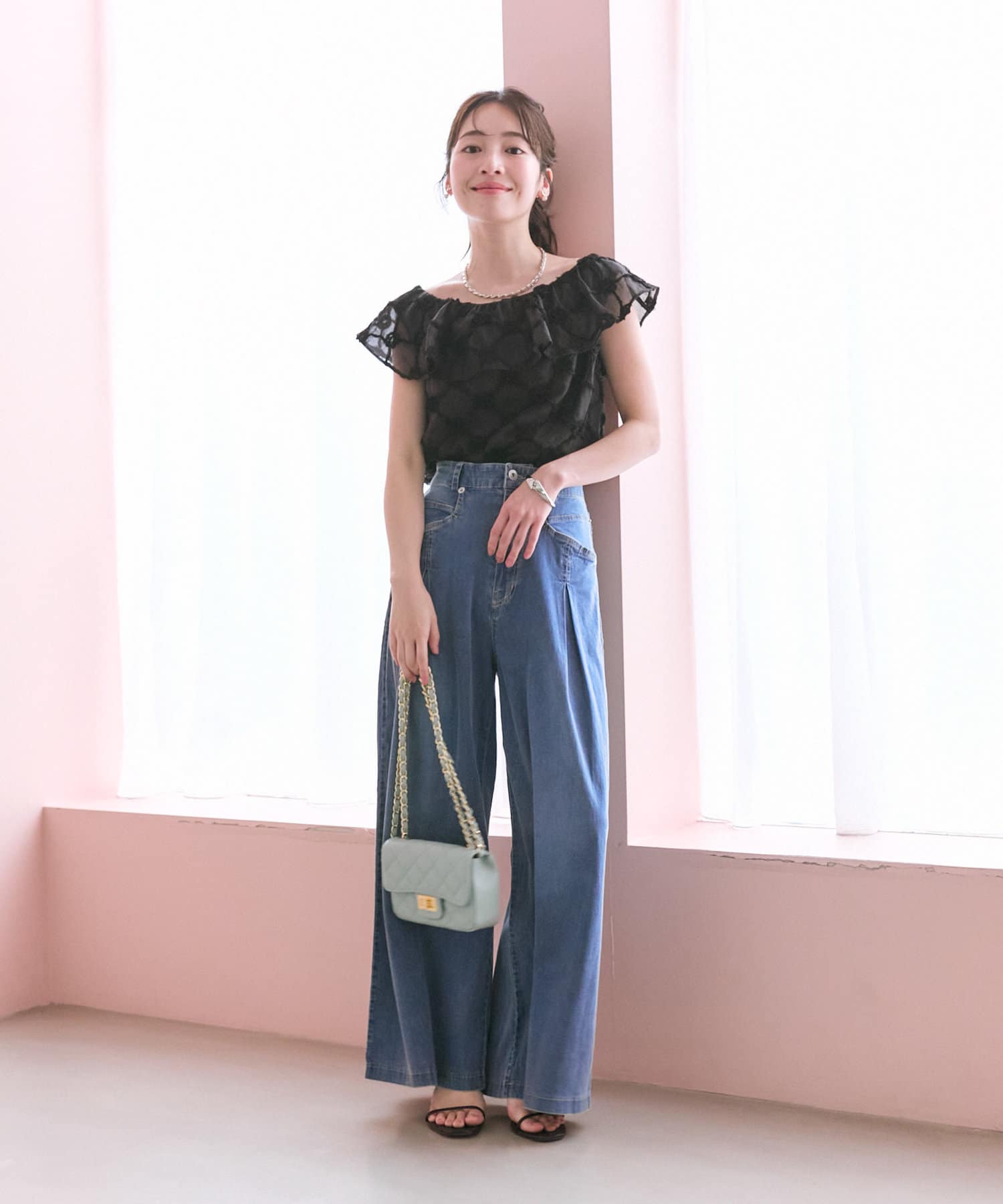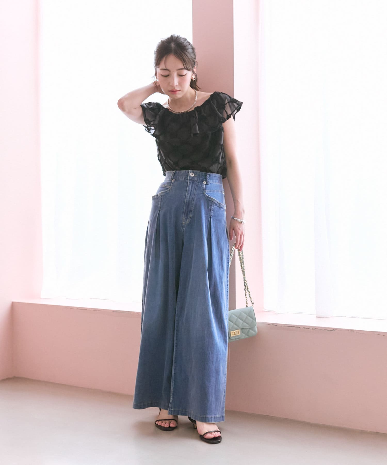 華やかなデザインなのでシンプルなボトムと合わせるだけで決まります。