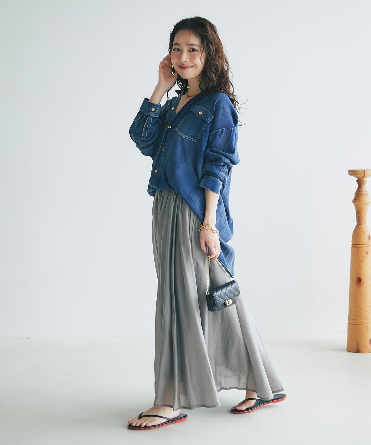 ブラウスやニットと合わせて、フェミニンな雰囲気に仕上げるのもおすすめです。