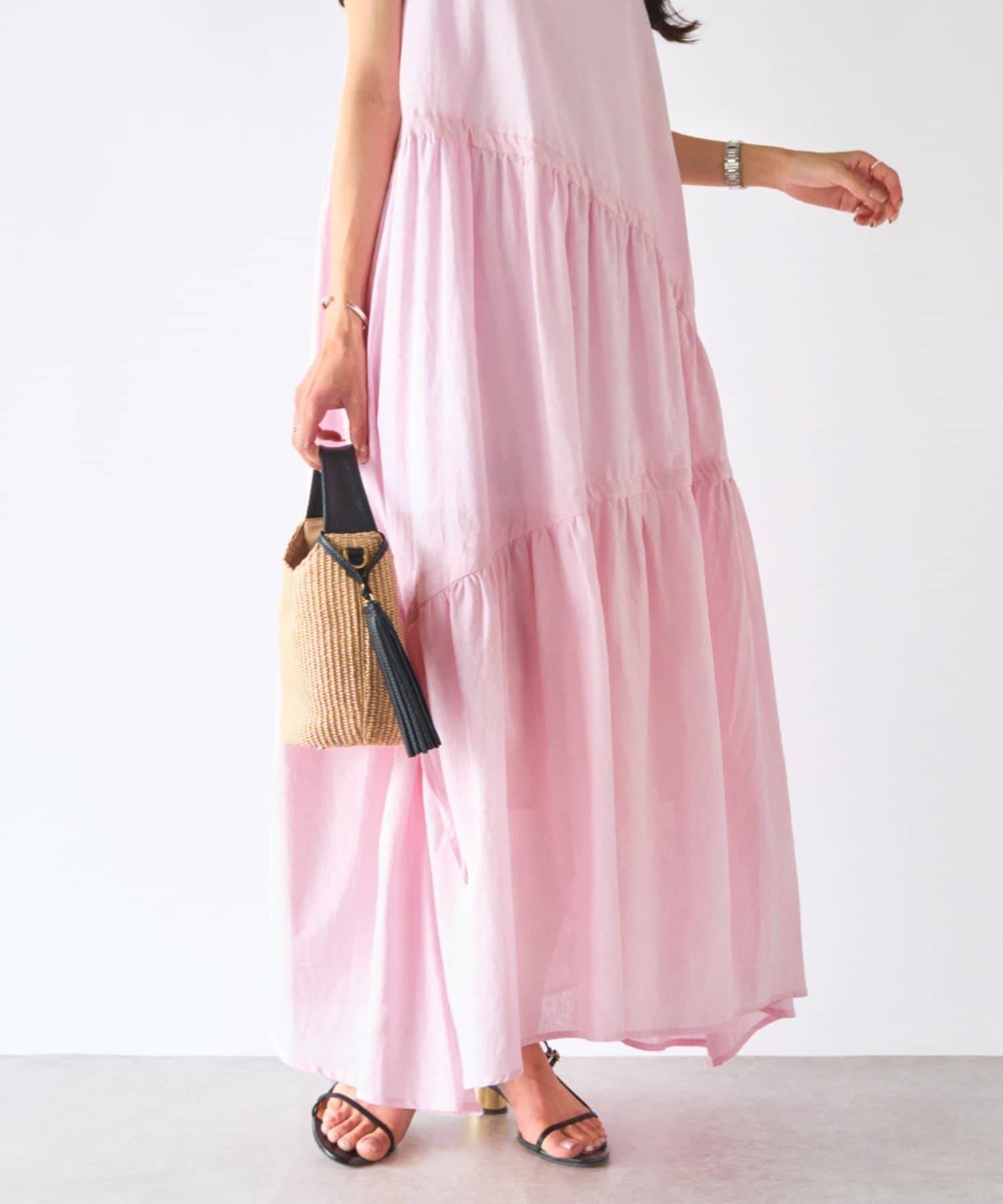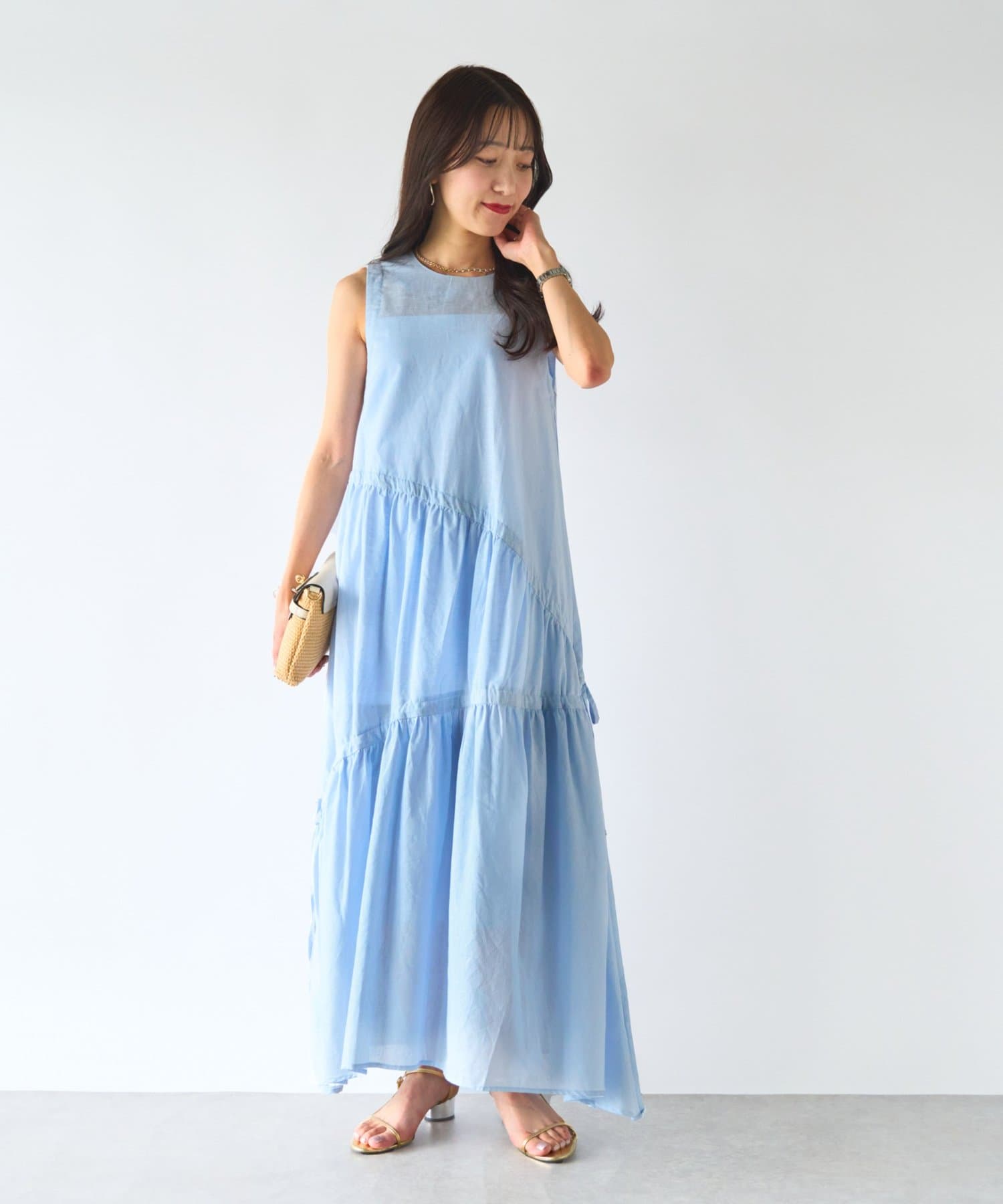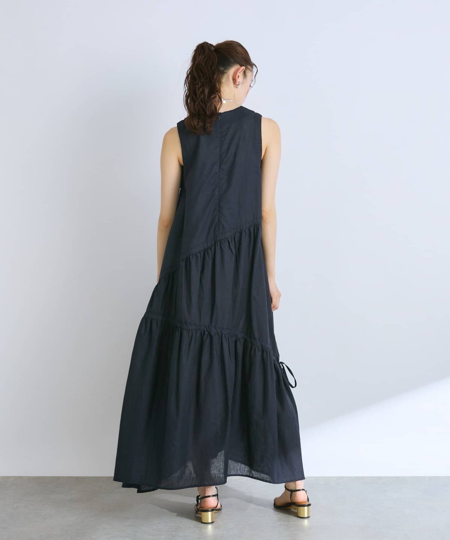 アシンメトリーなティアードが、動くたびに優雅なドレープを生み出し、軽やかな印象を与えます。