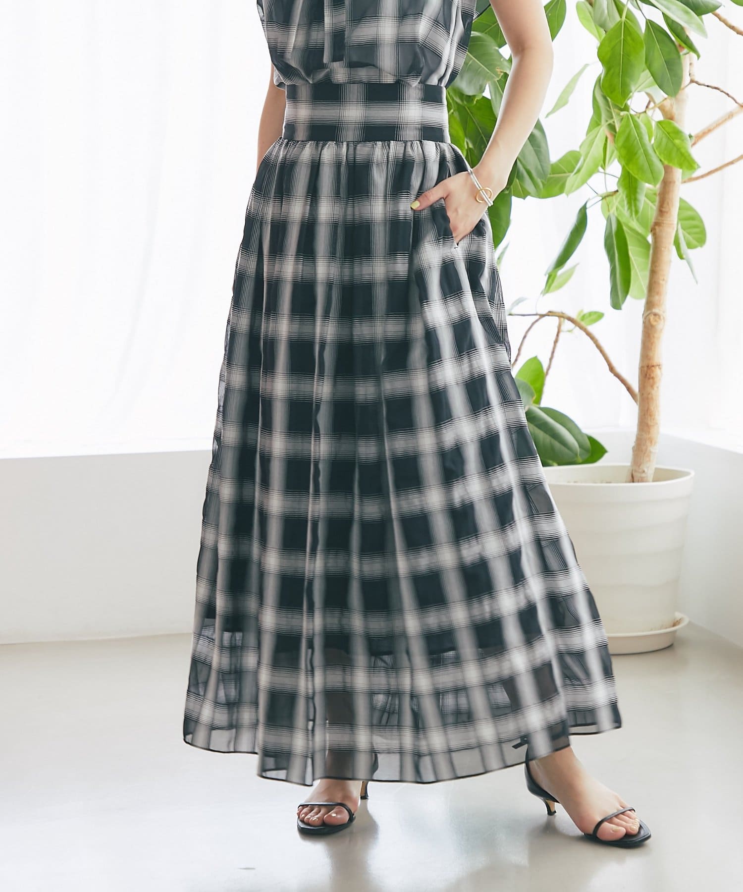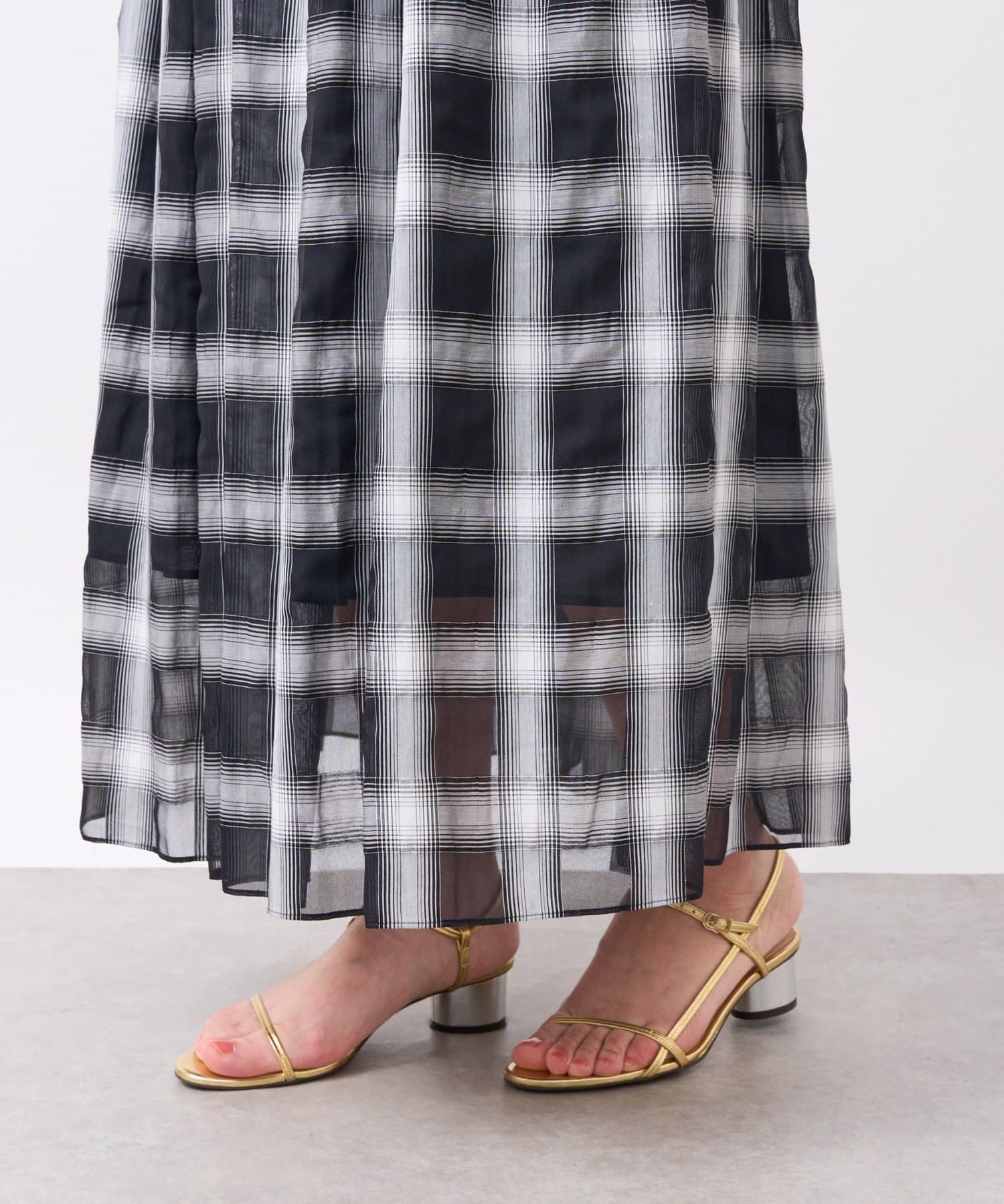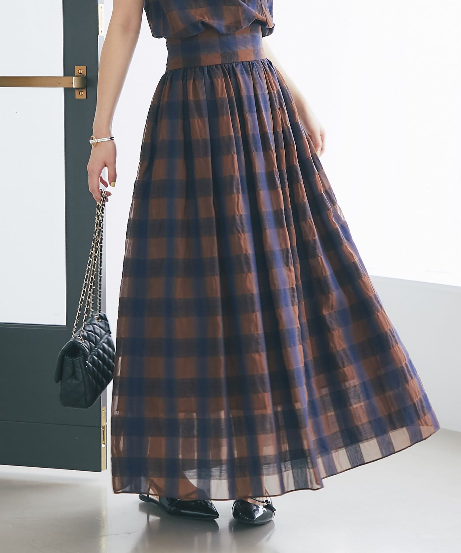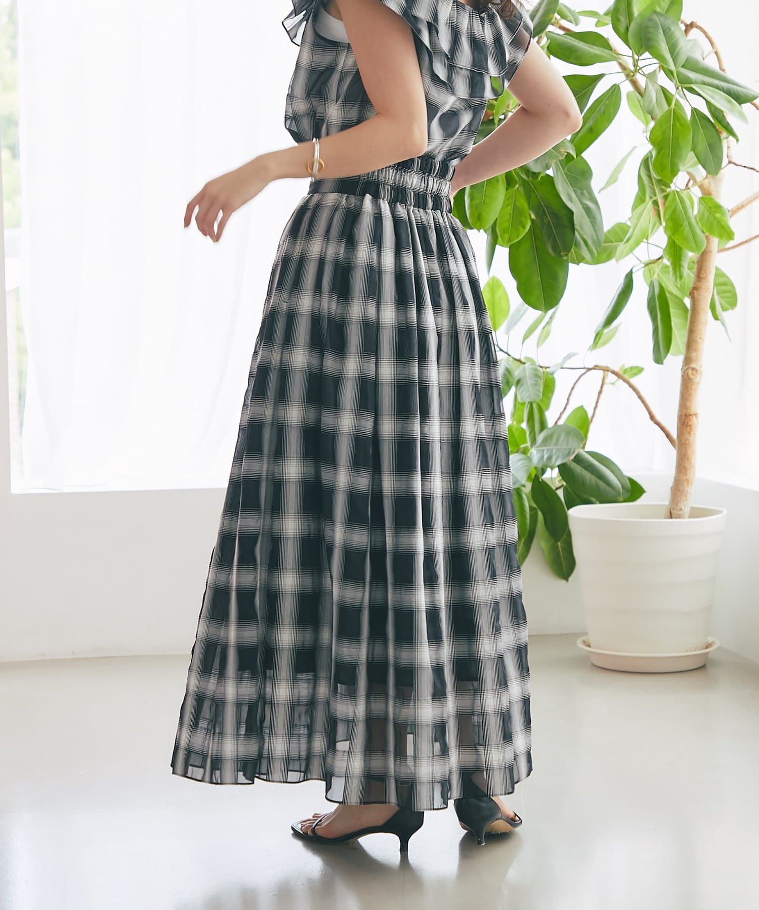 【低身長サイズ・セットアップ可】シアーオンブレーチェックギャザーロングスカート