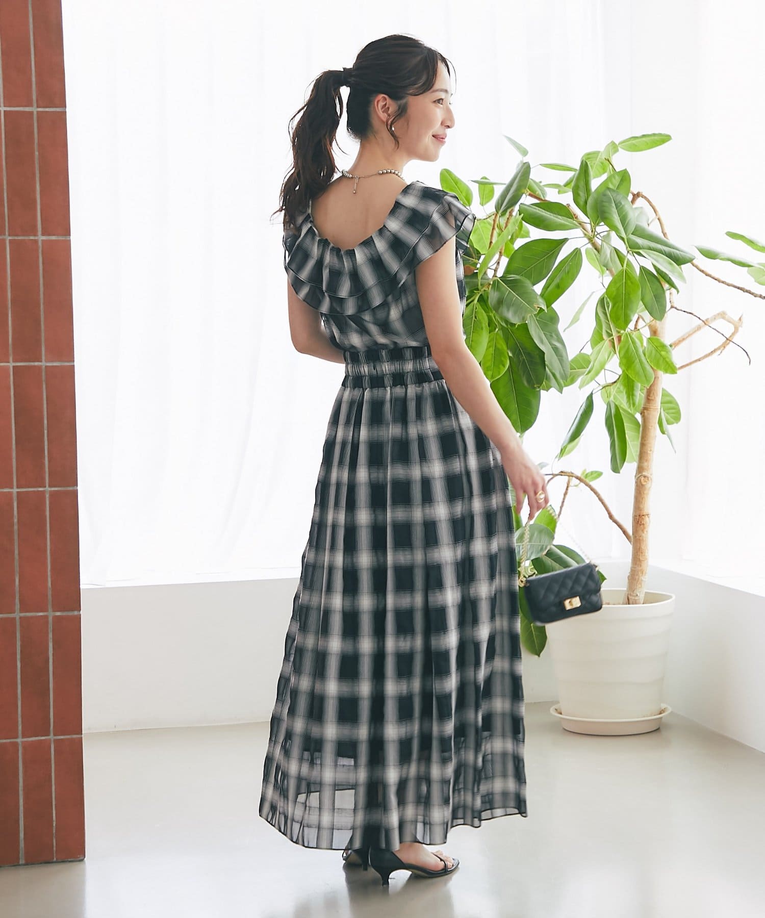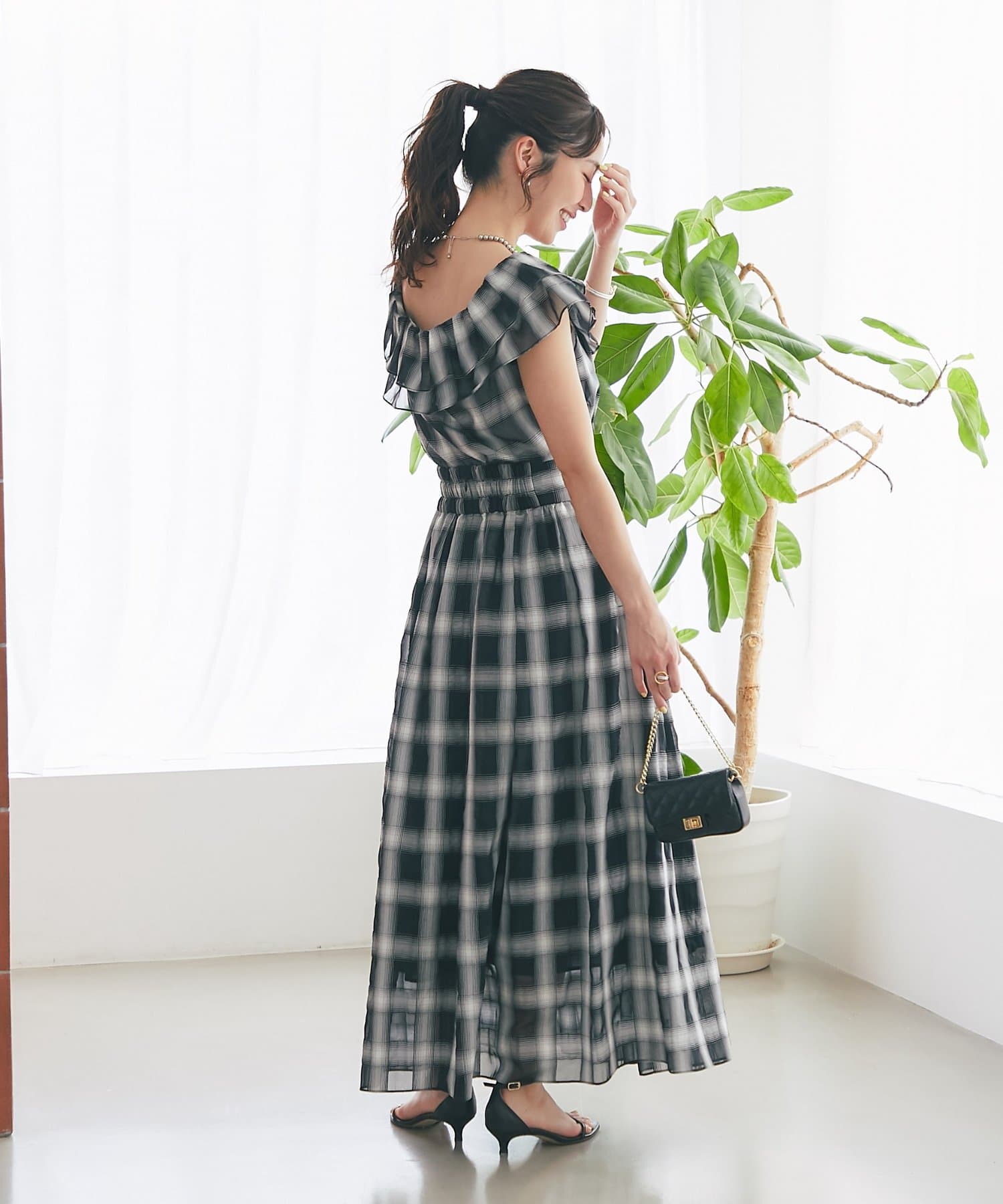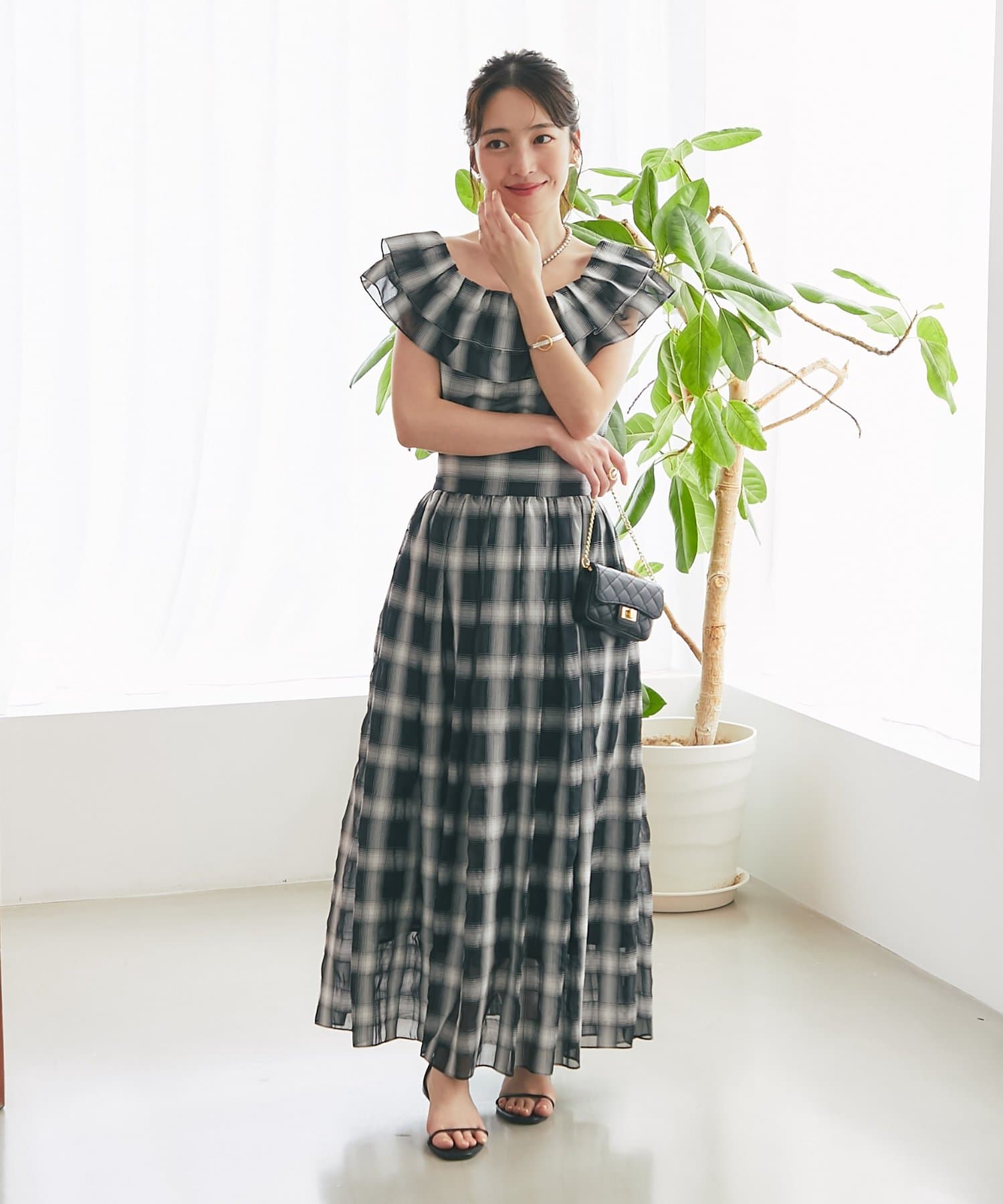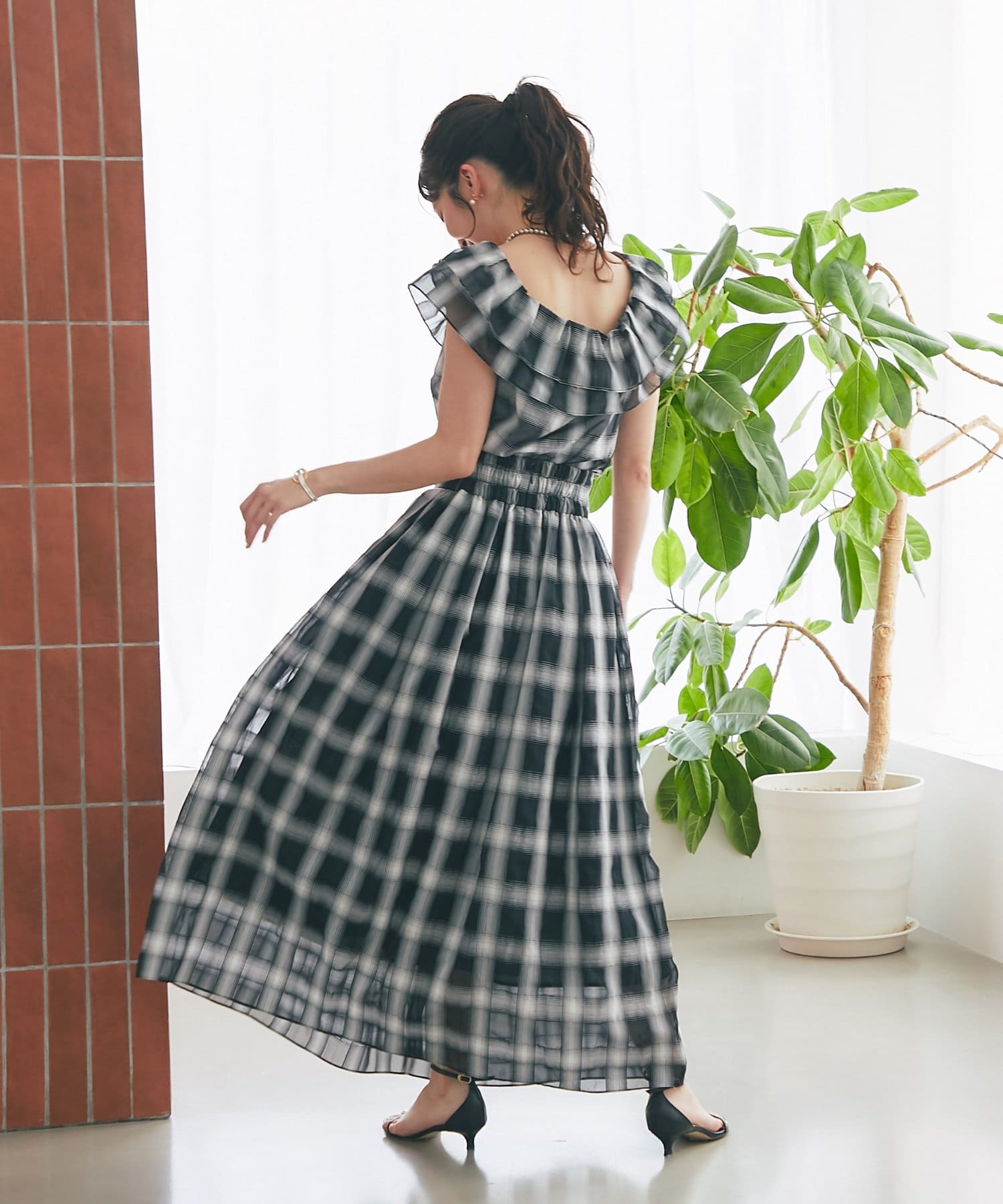 【低身長サイズ・セットアップ可】シアーオンブレーチェックギャザーロングスカート