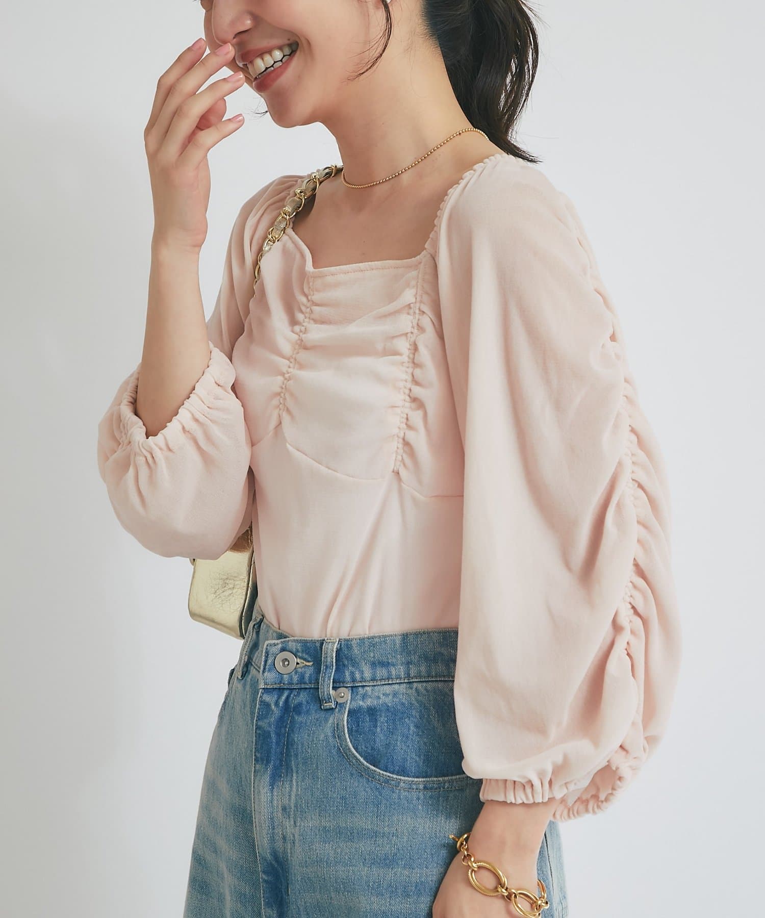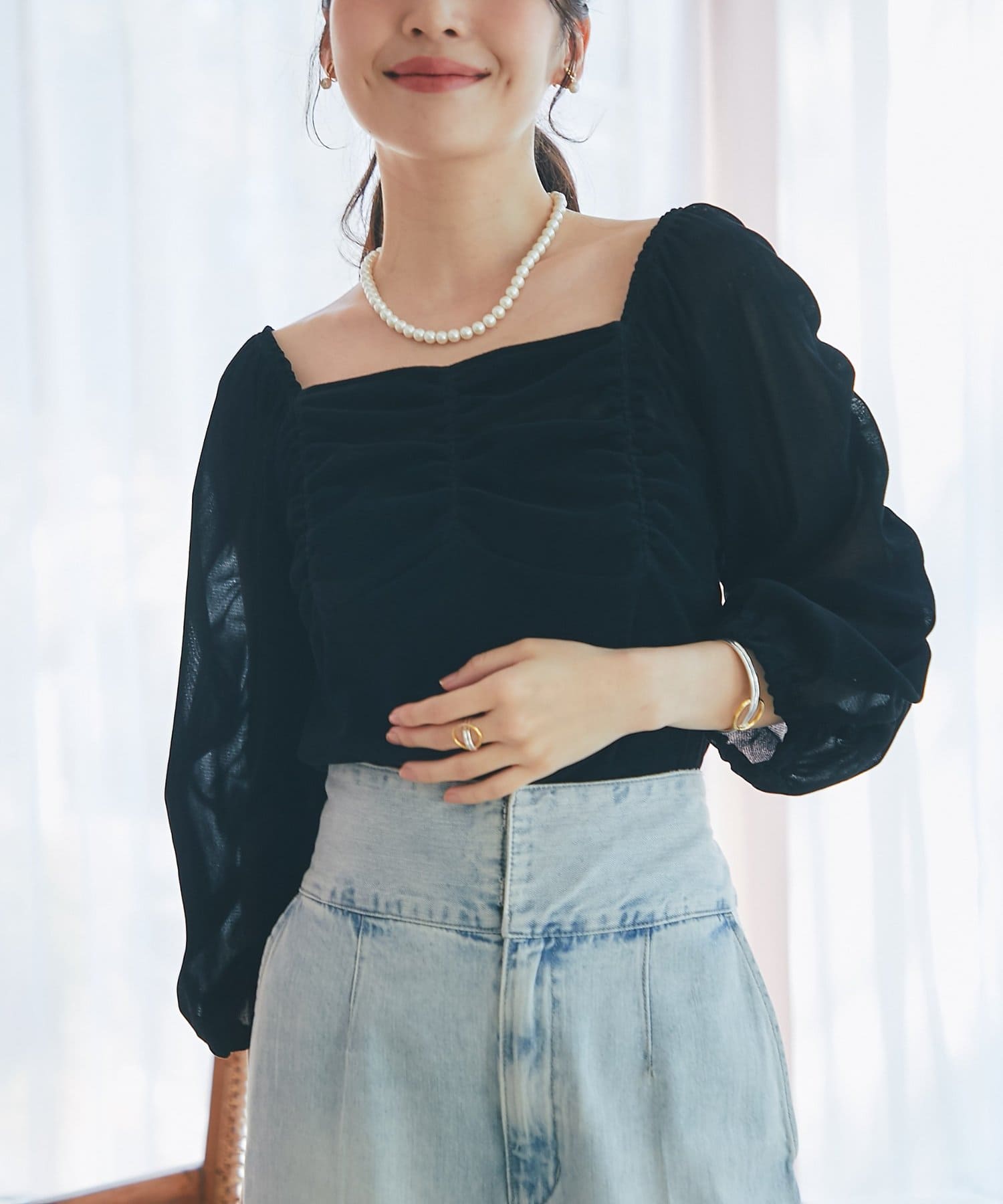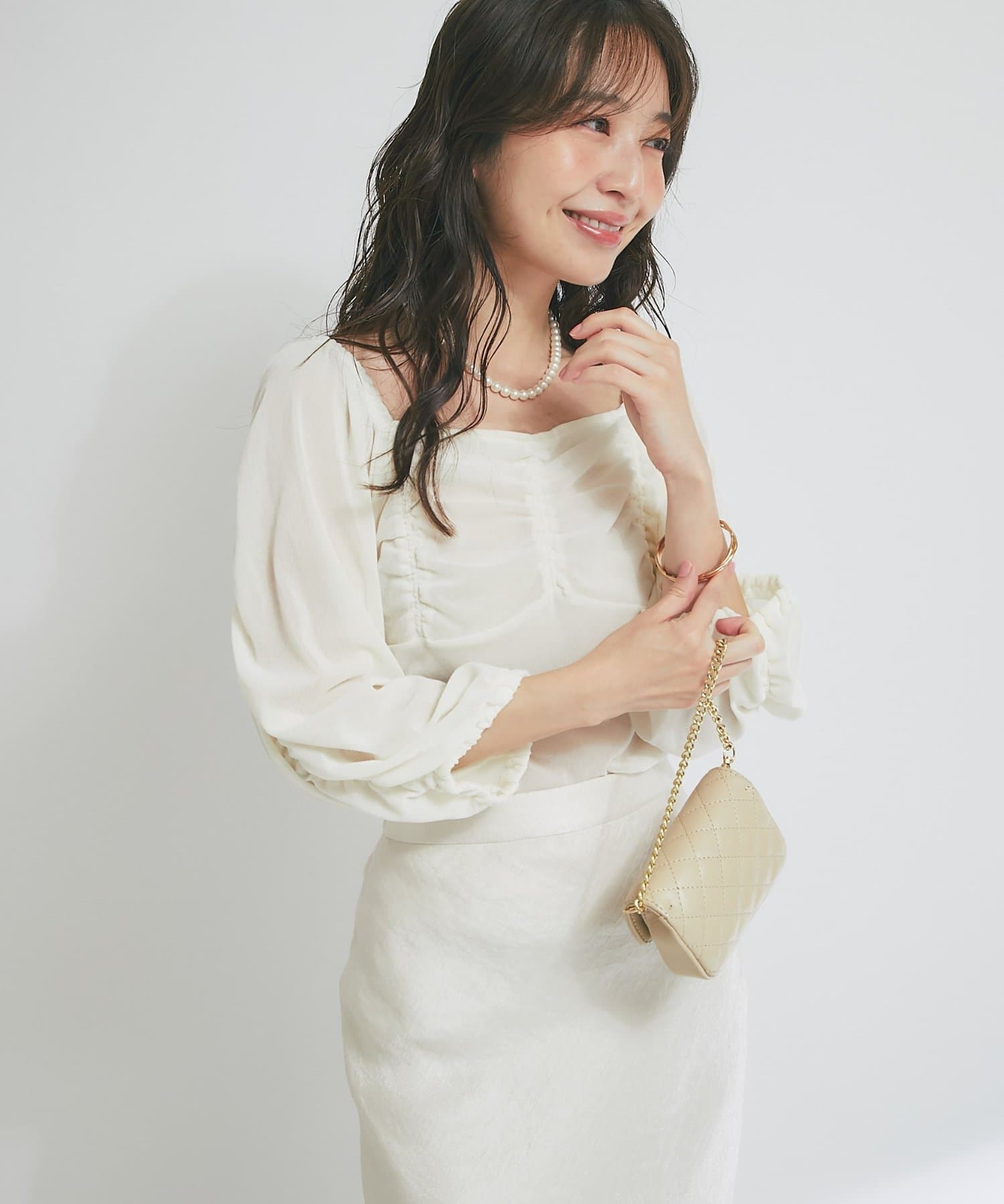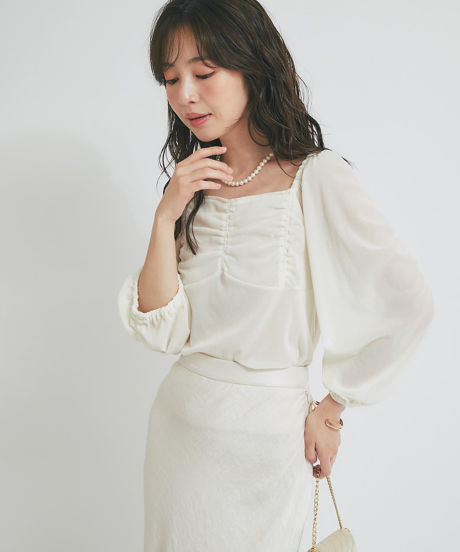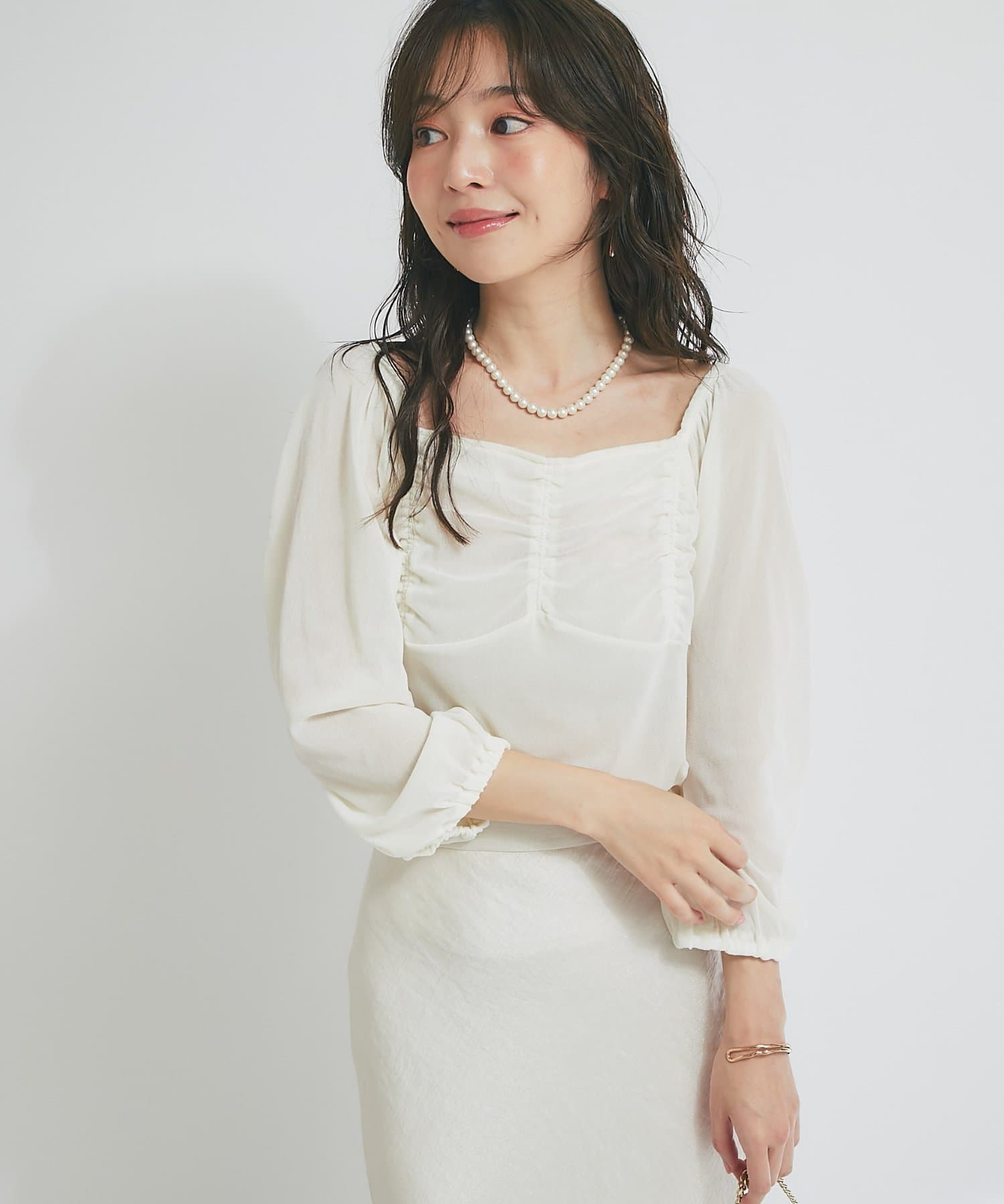 スクエアネックとシャーリングディテールがデコルテを美しく見せ、顔まわりをすっきりとした印象に。