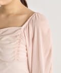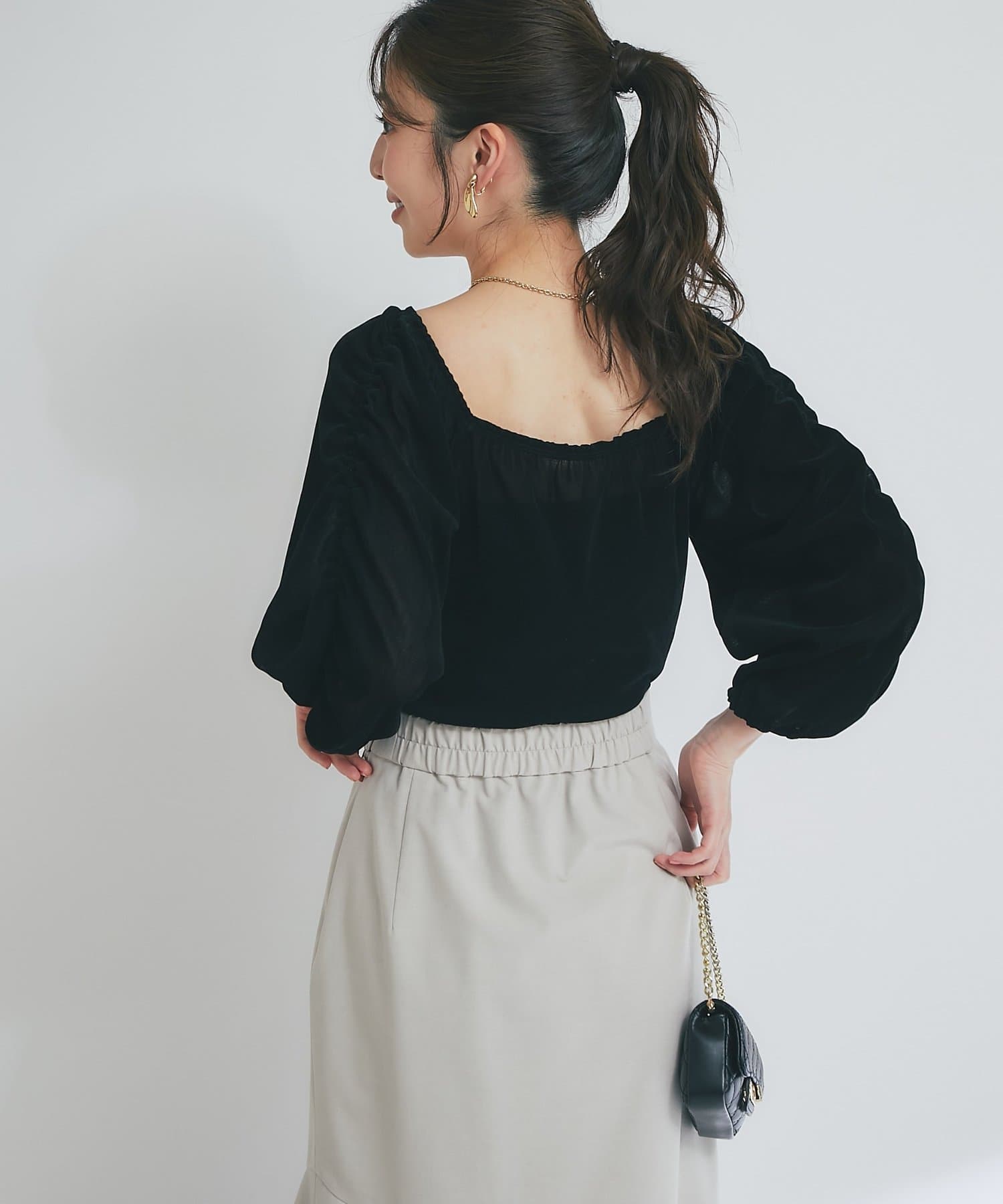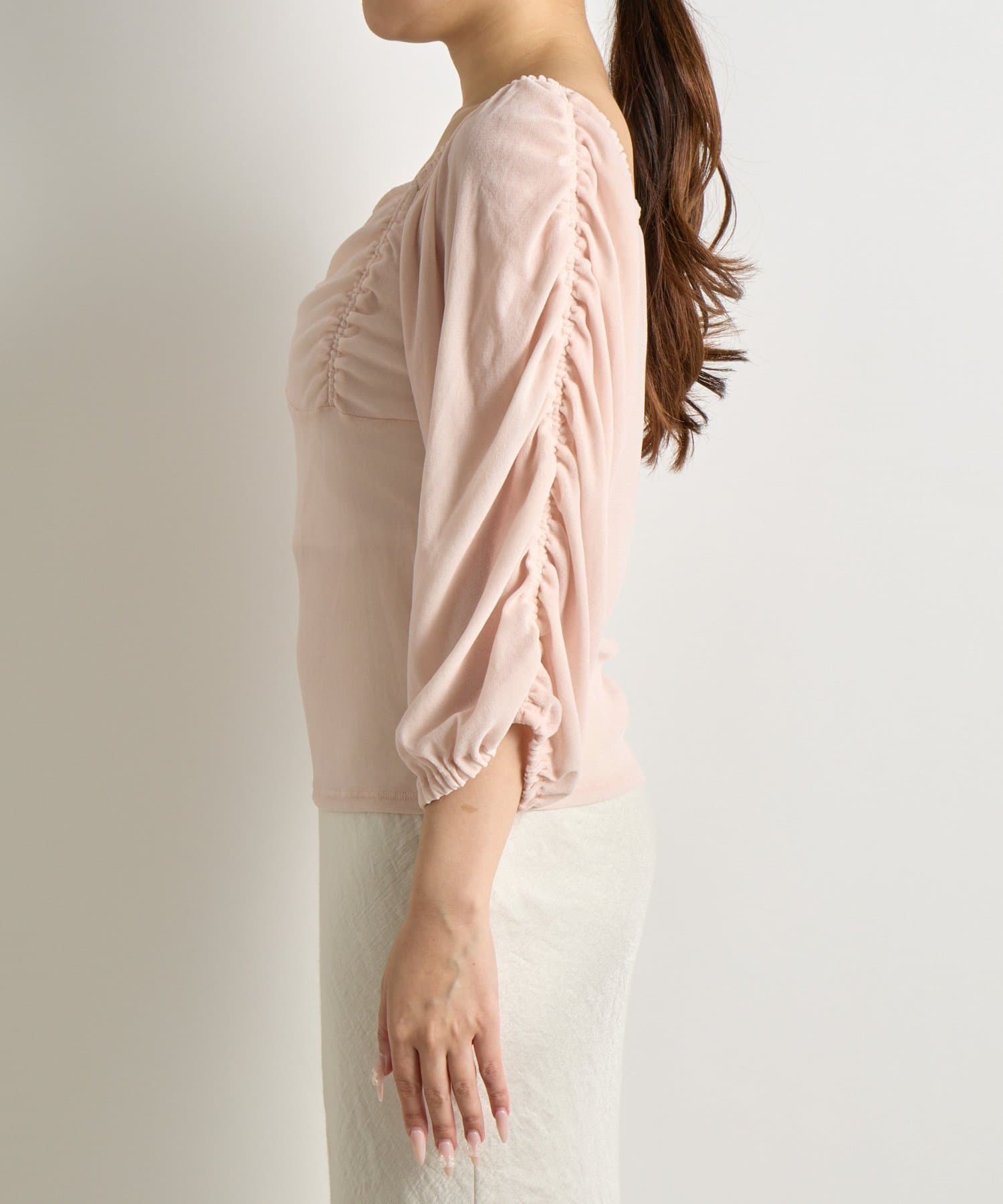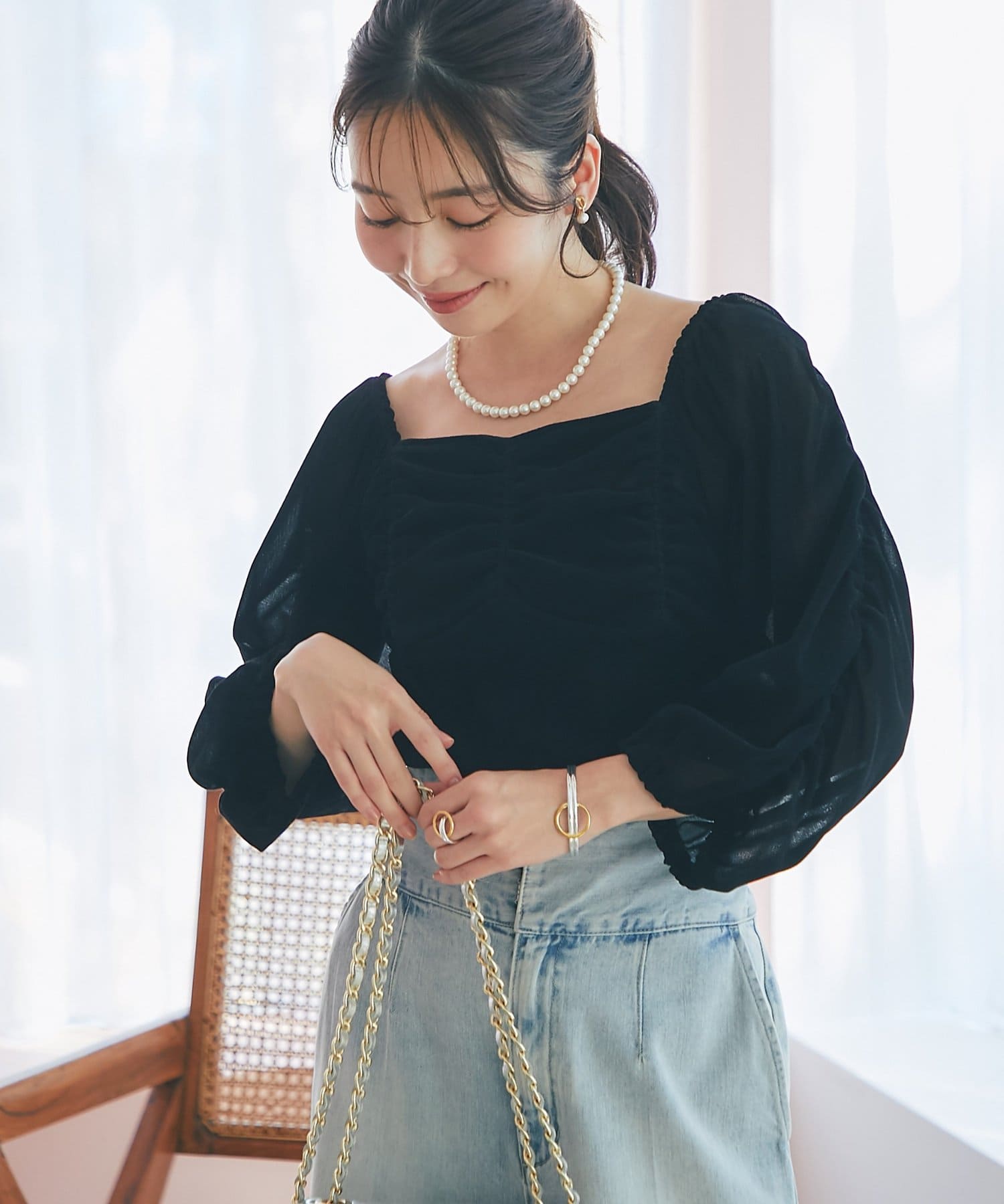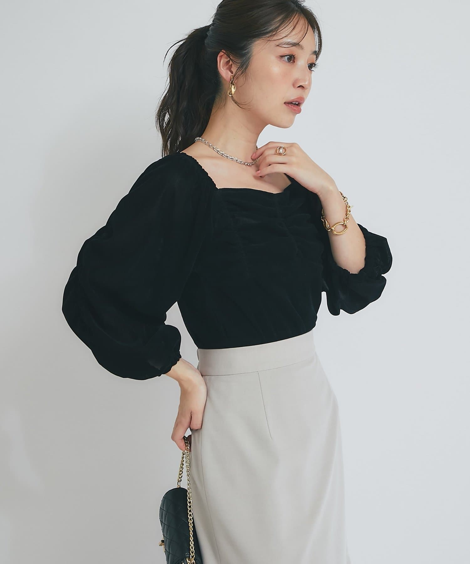 スクエアネックとシャーリングディテールがデコルテを美しく見せ、顔まわりをすっきりとした印象に。