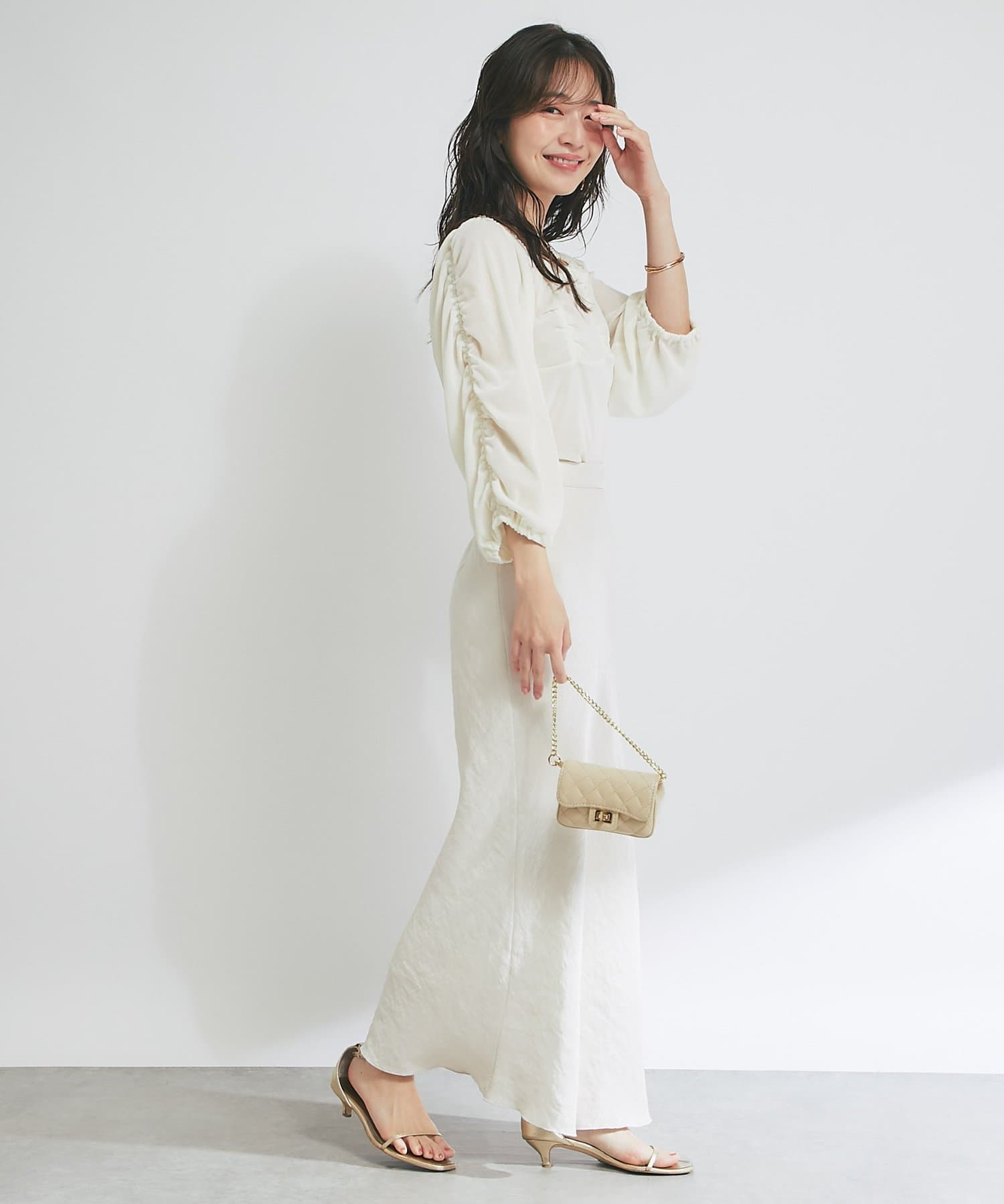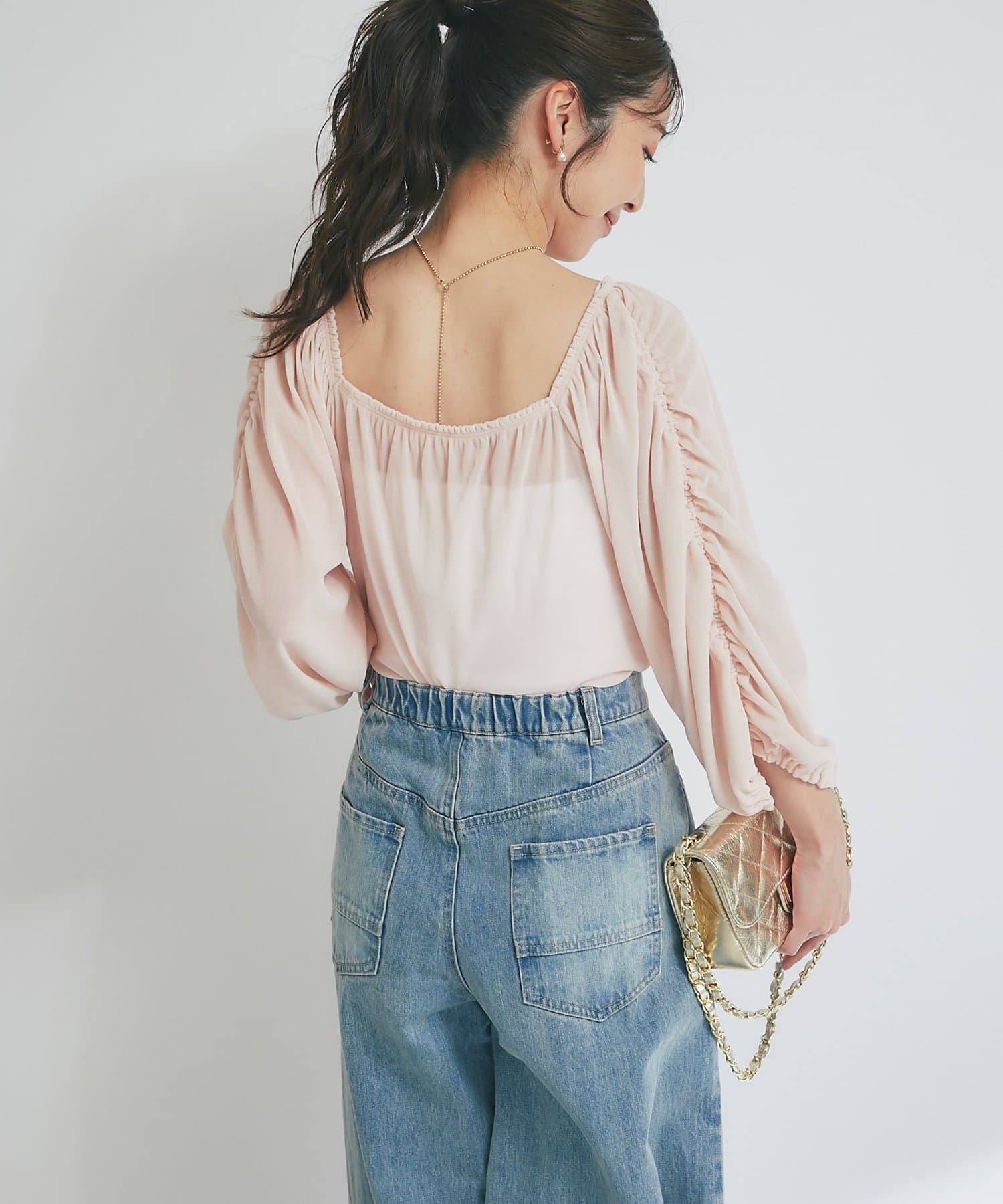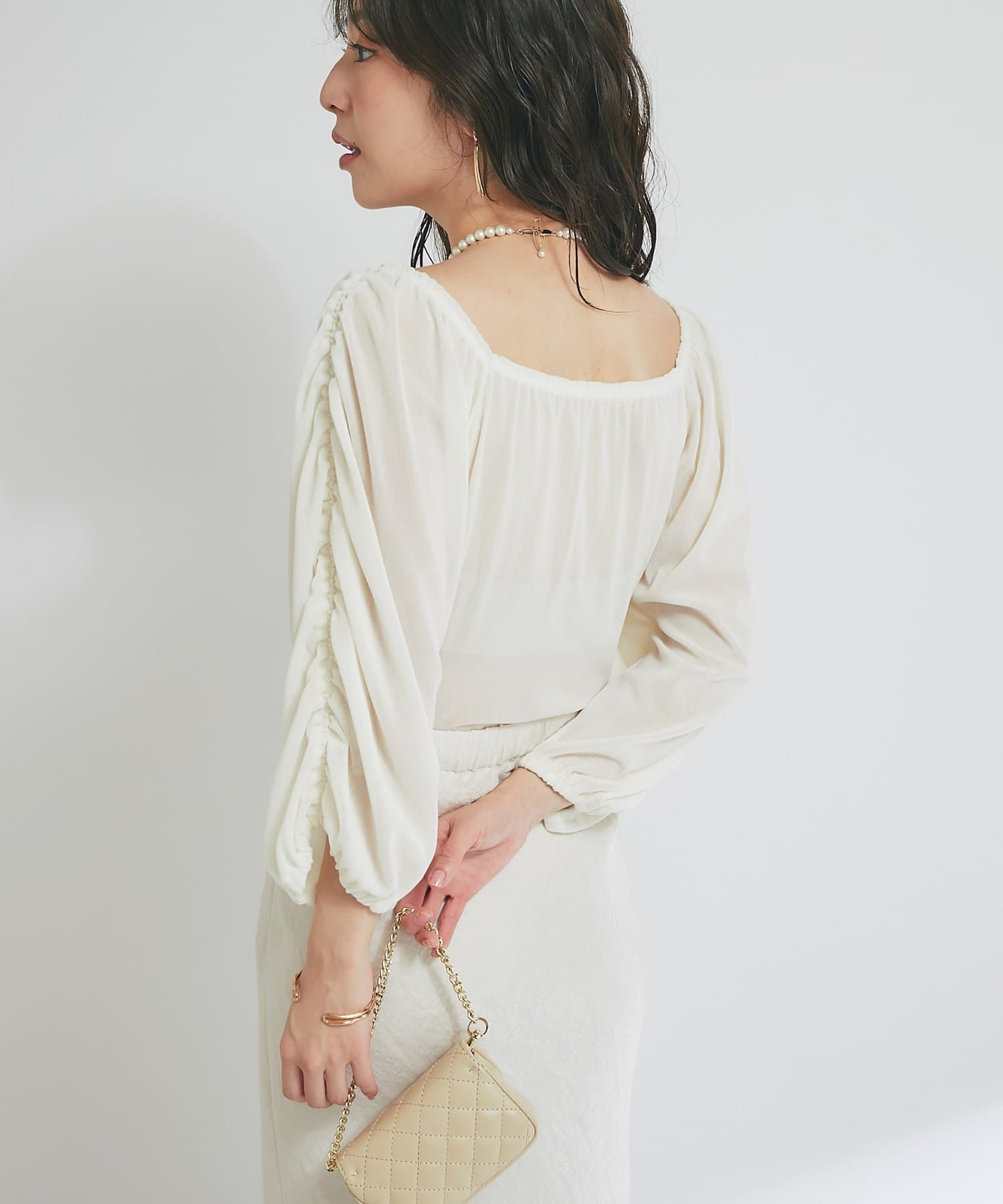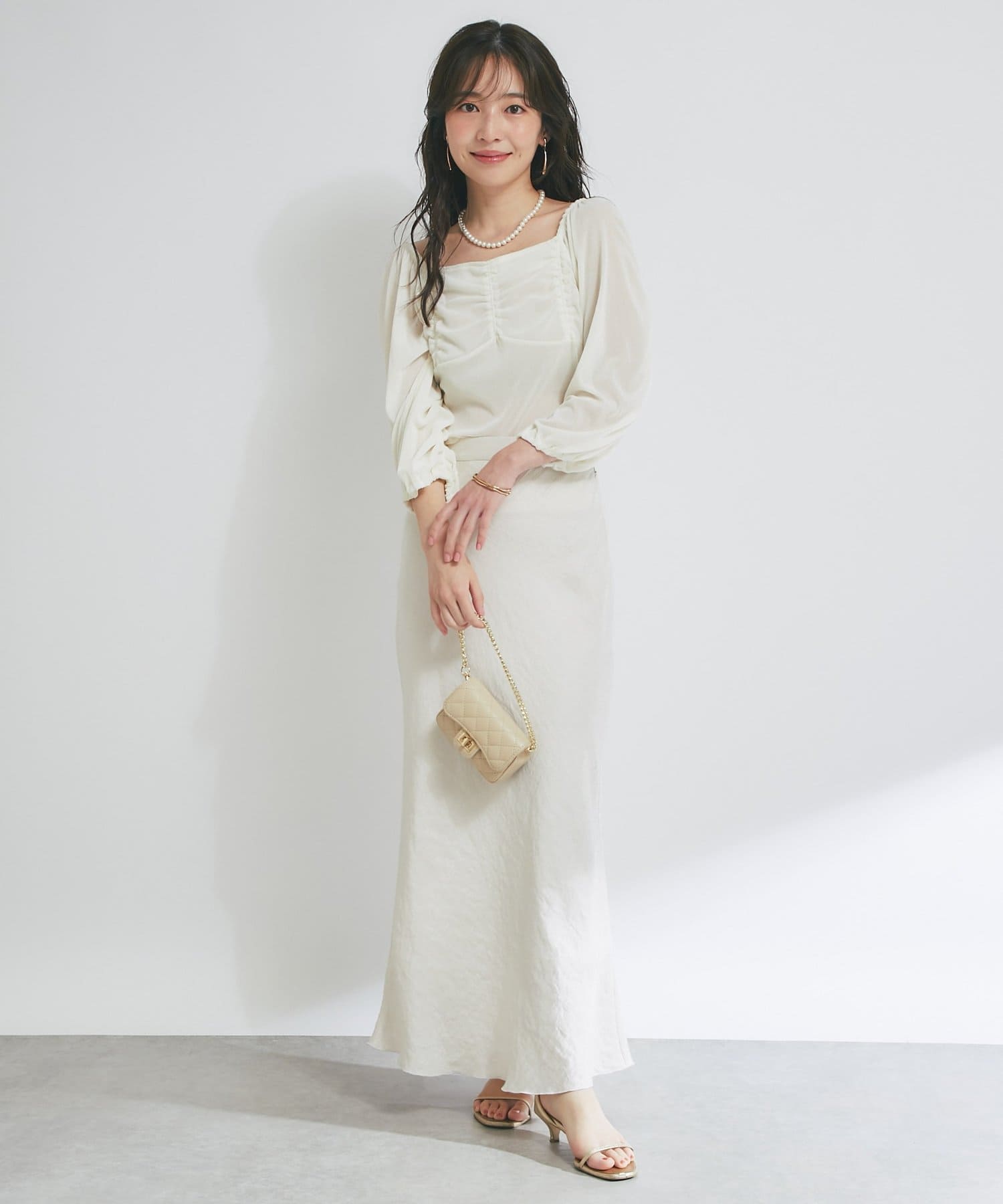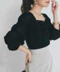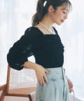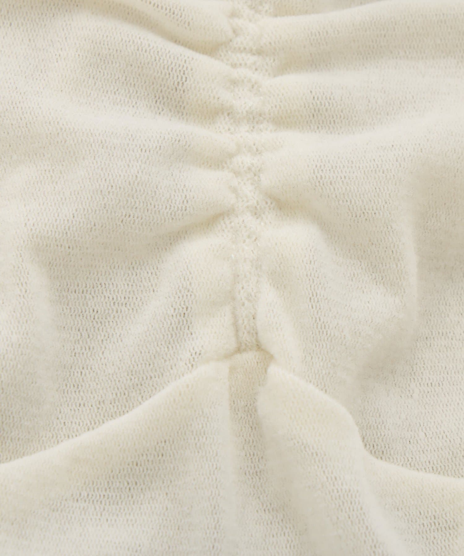 スクエアネックとシャーリングディテールがデコルテを美しく見せ、顔まわりをすっきりとした印象に。