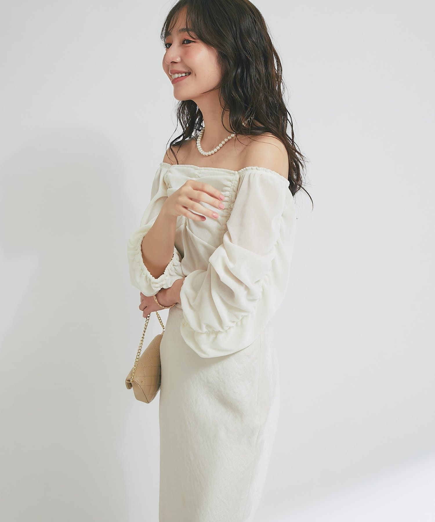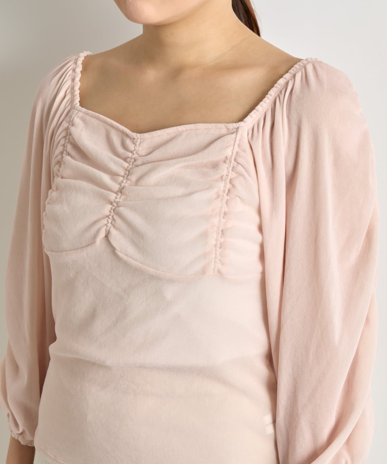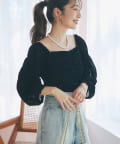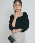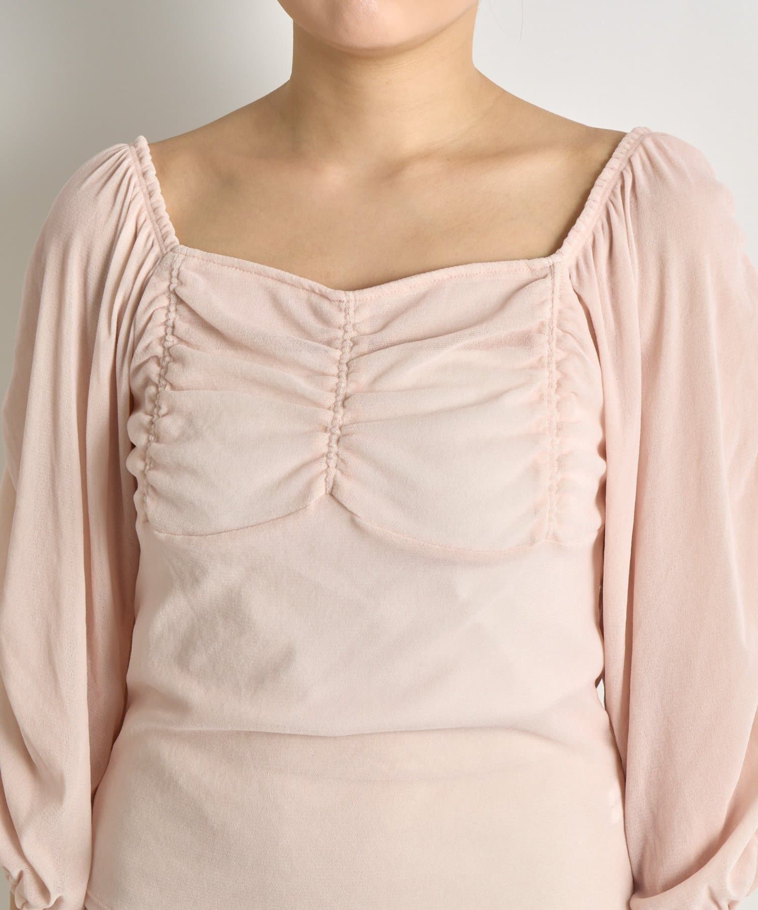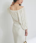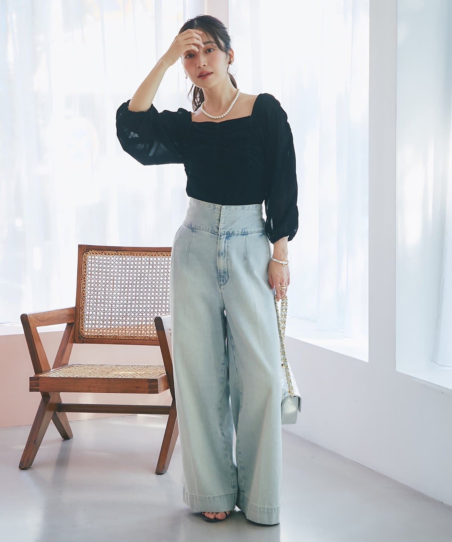 スクエアネックとシャーリングディテールがデコルテを美しく見せ、顔まわりをすっきりとした印象に。