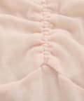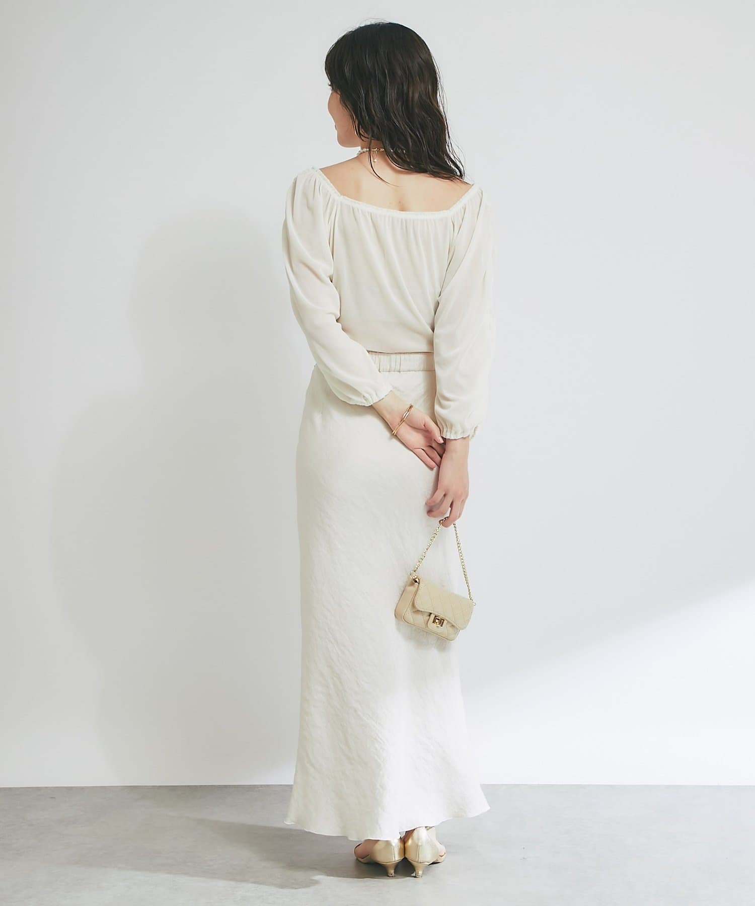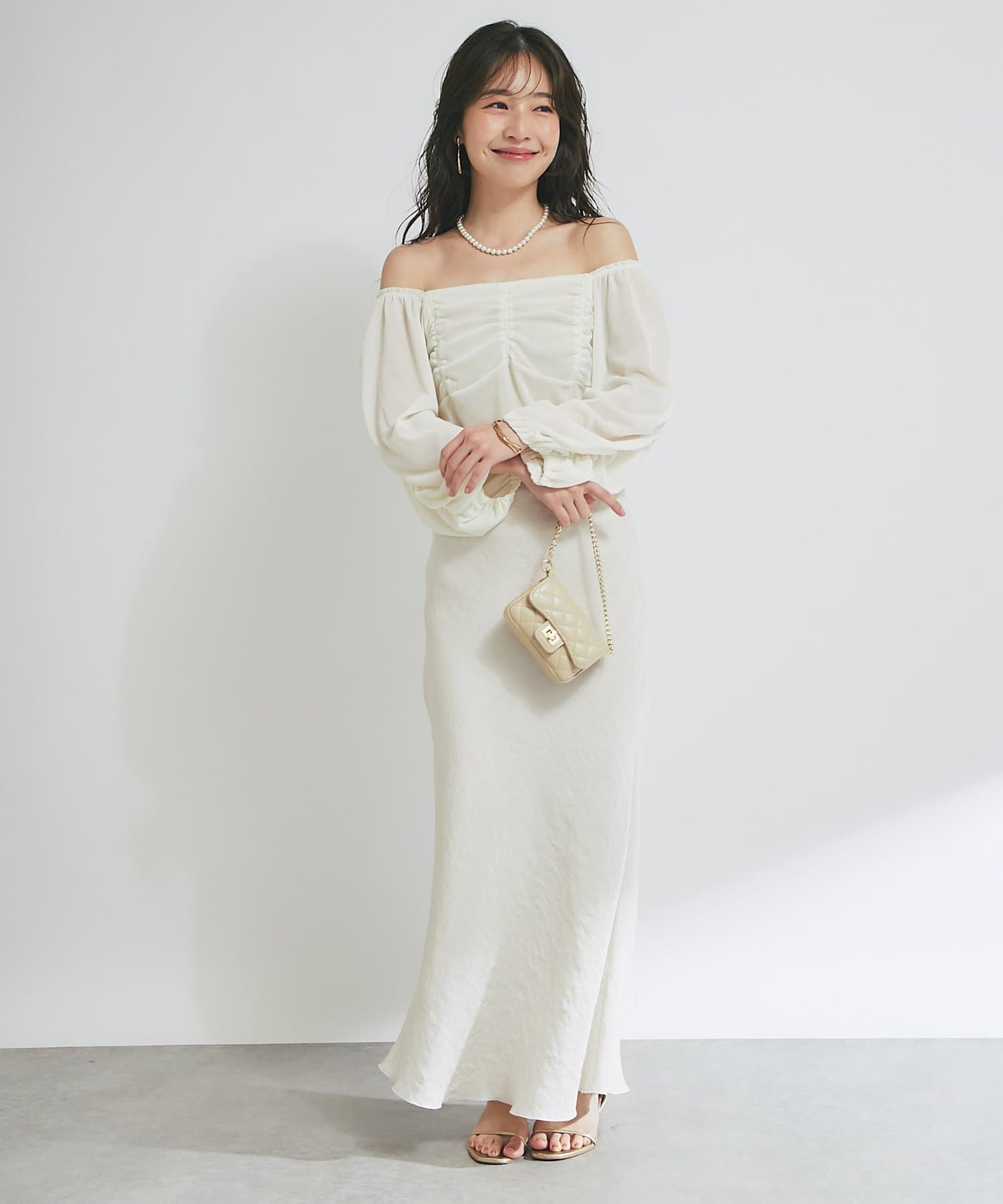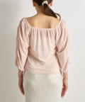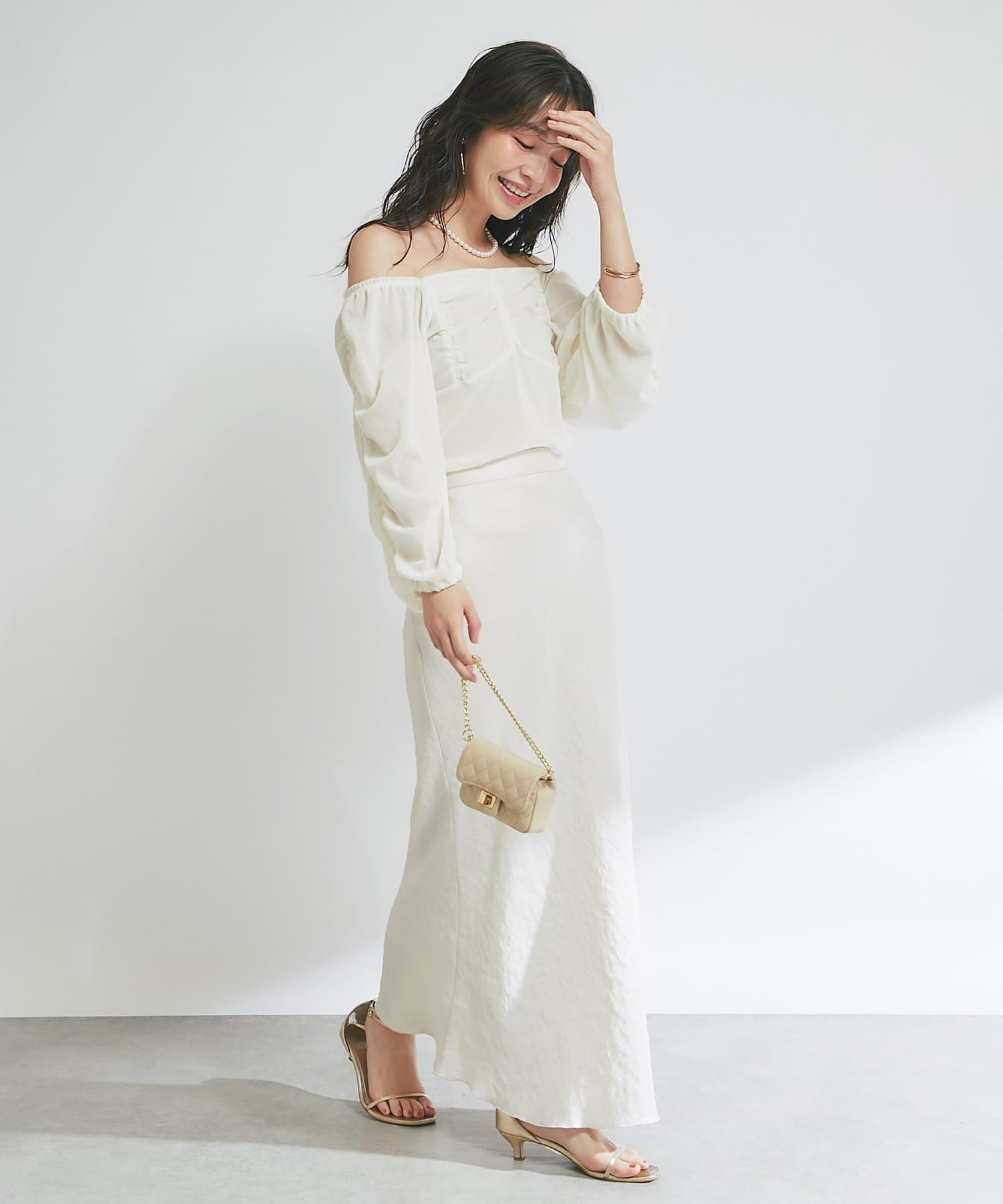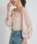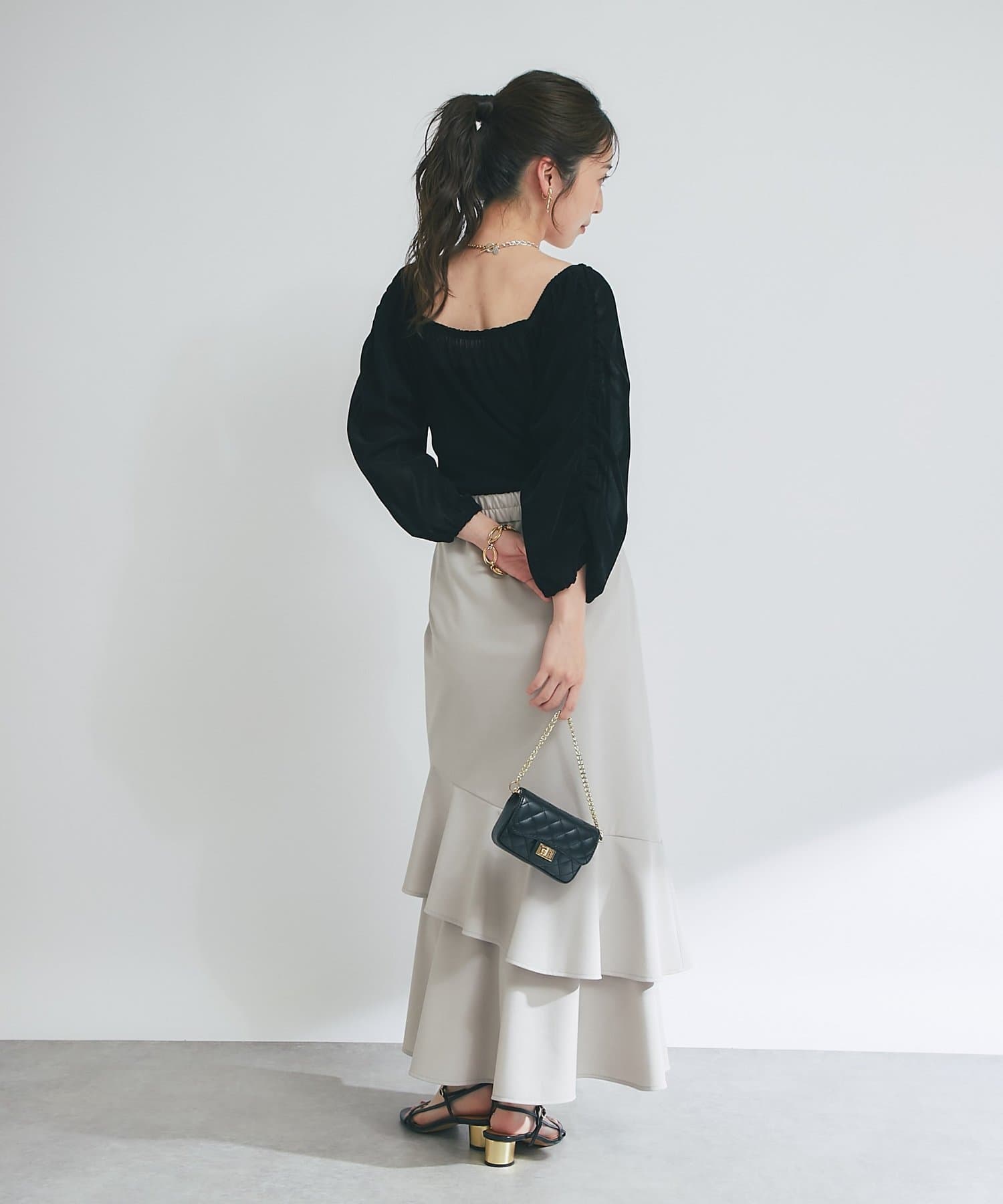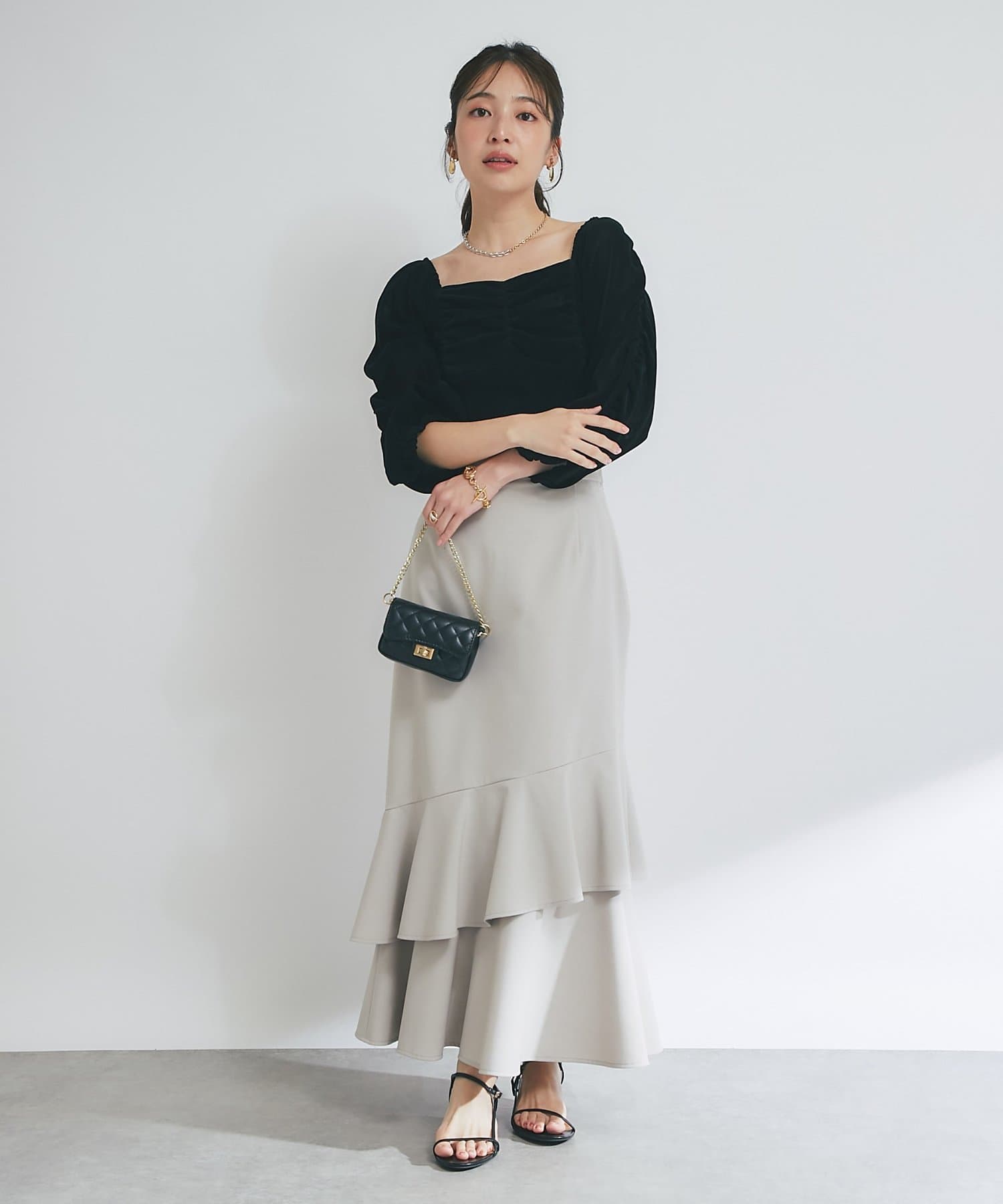 スクエアネックとシャーリングディテールがデコルテを美しく見せ、顔まわりをすっきりとした印象に。