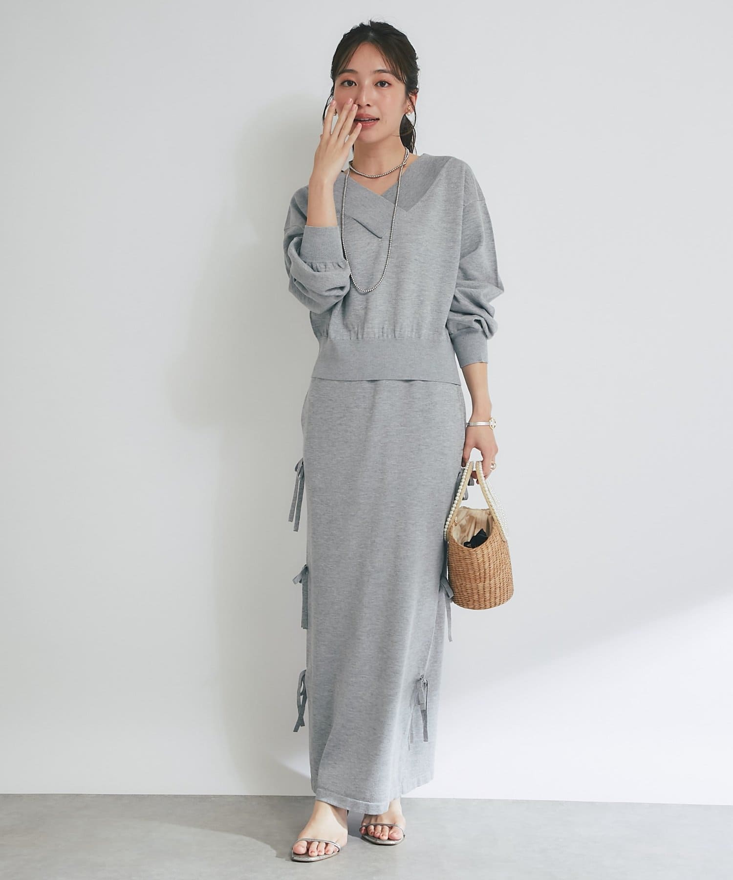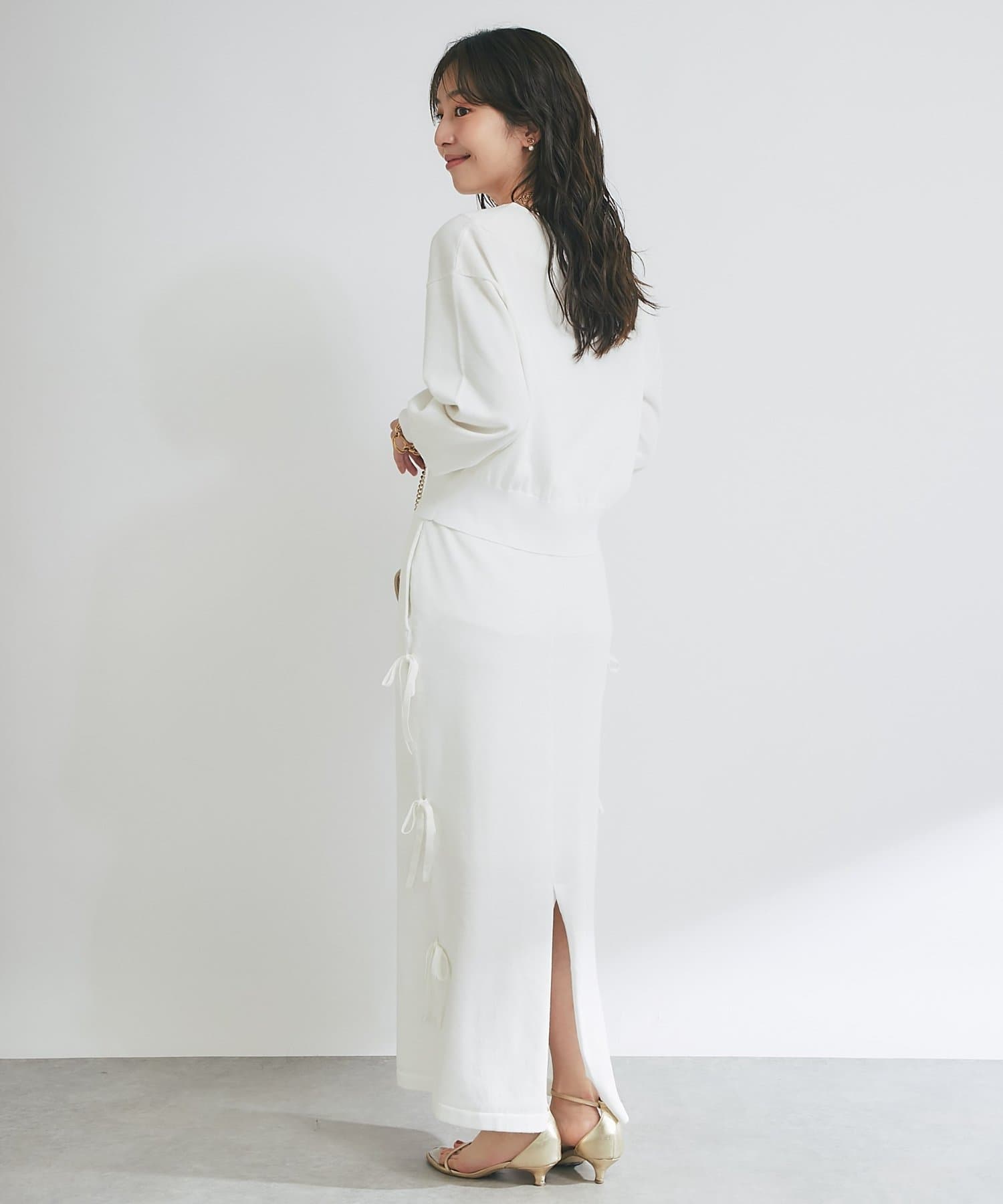 シンプルなデザインに、サイドリボンがアクセントを添えるラメニットロングスカート。