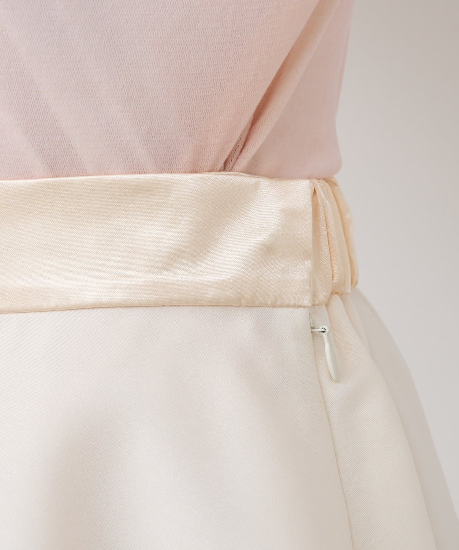 ウエストの部分はサテン地の切替でポイントをきかせつつ、後ろゴムでラクな履き心地に。