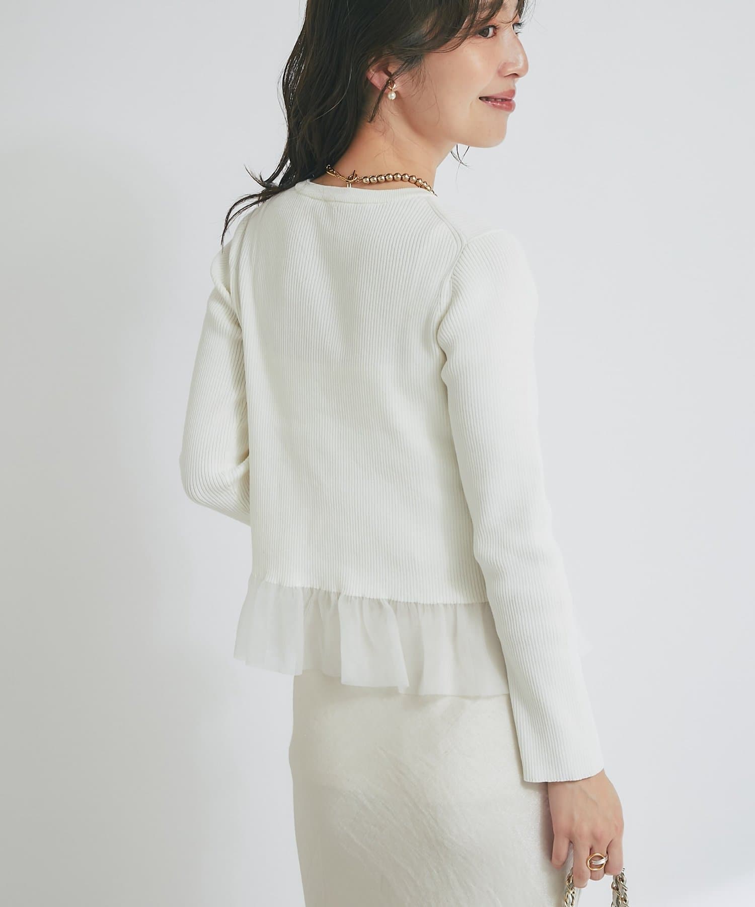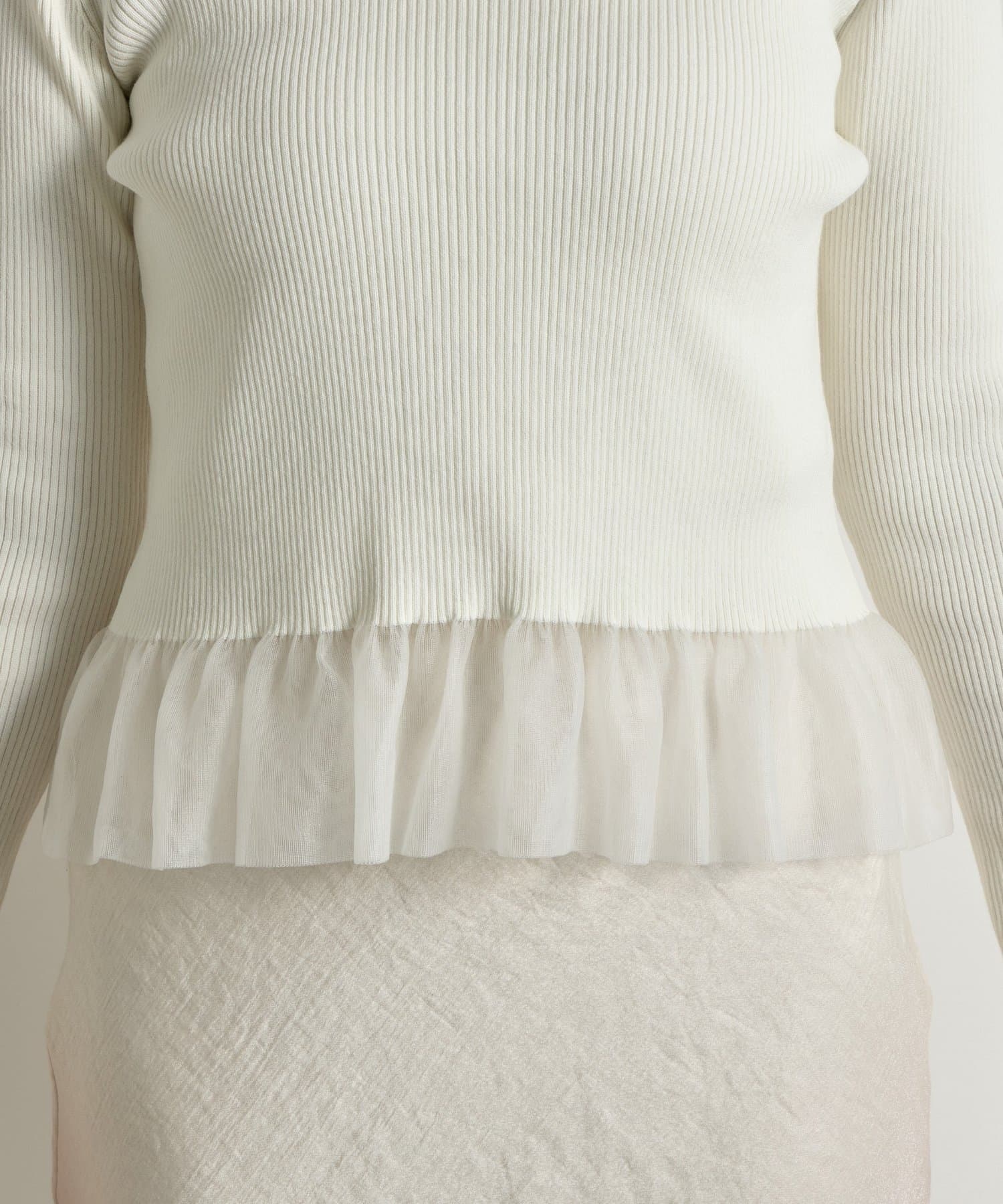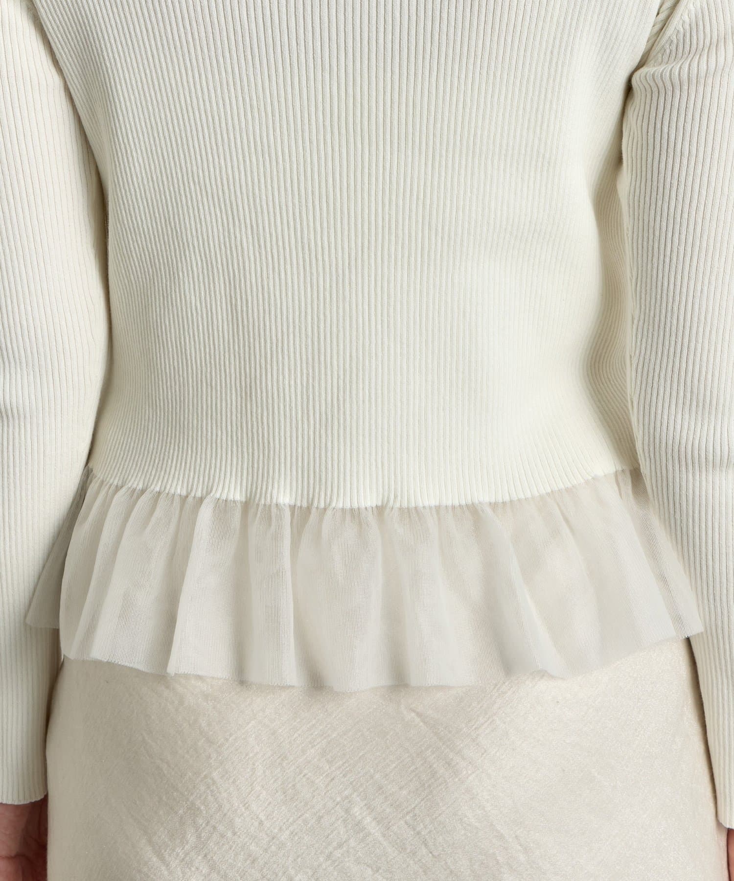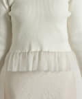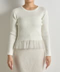 上品な透け感のシアーフリルが目を引く、レイヤード風デザインのニットトップス。