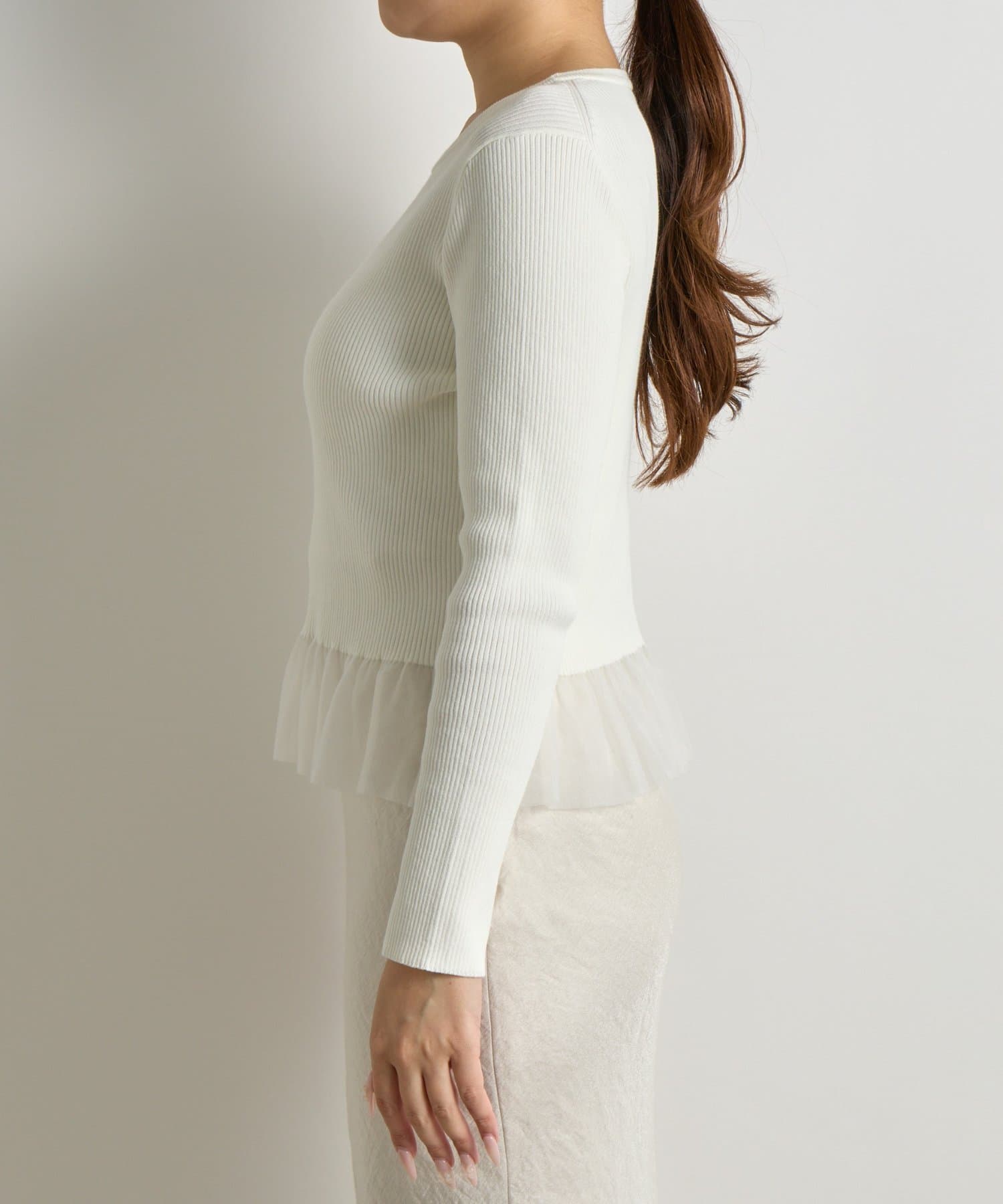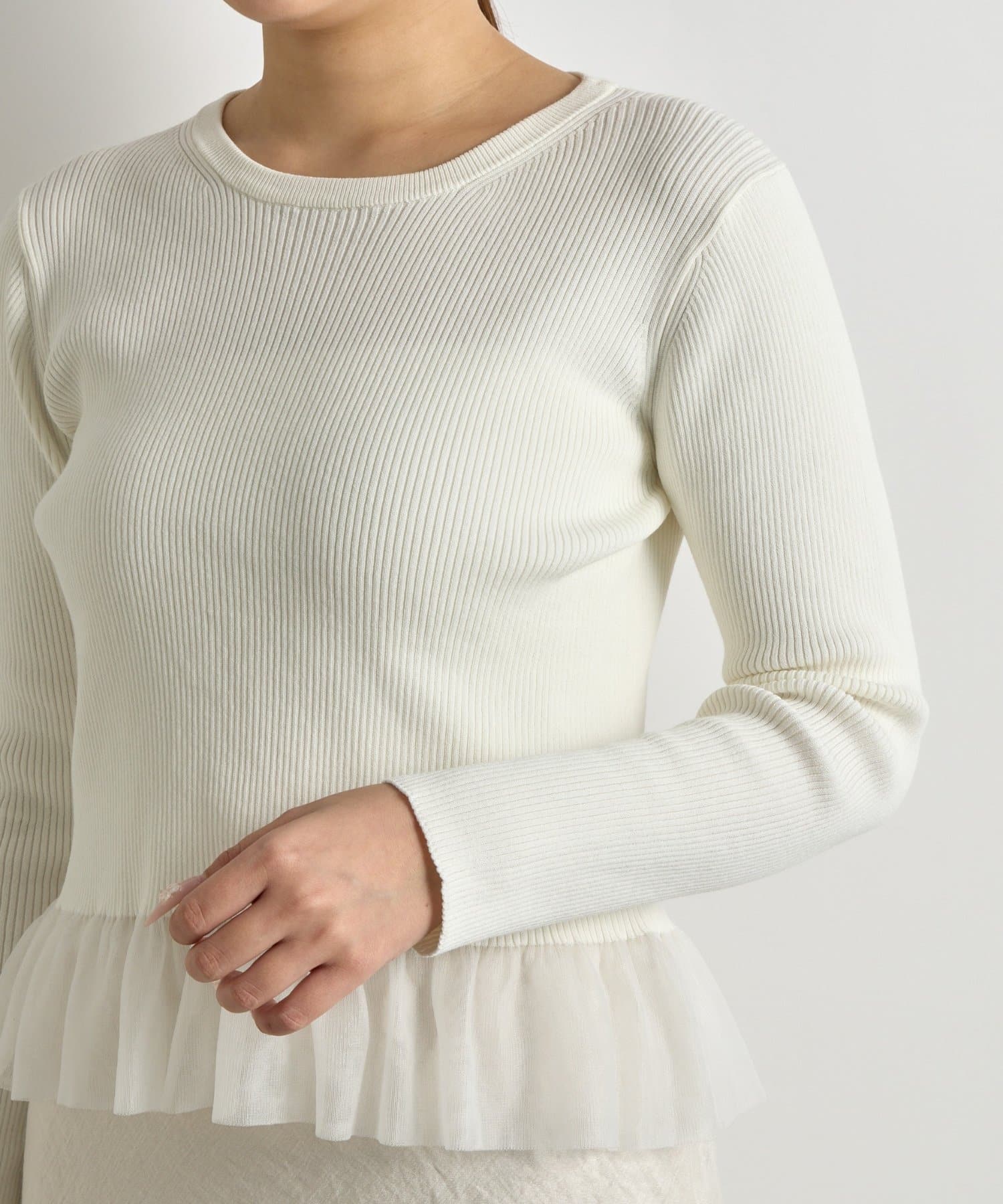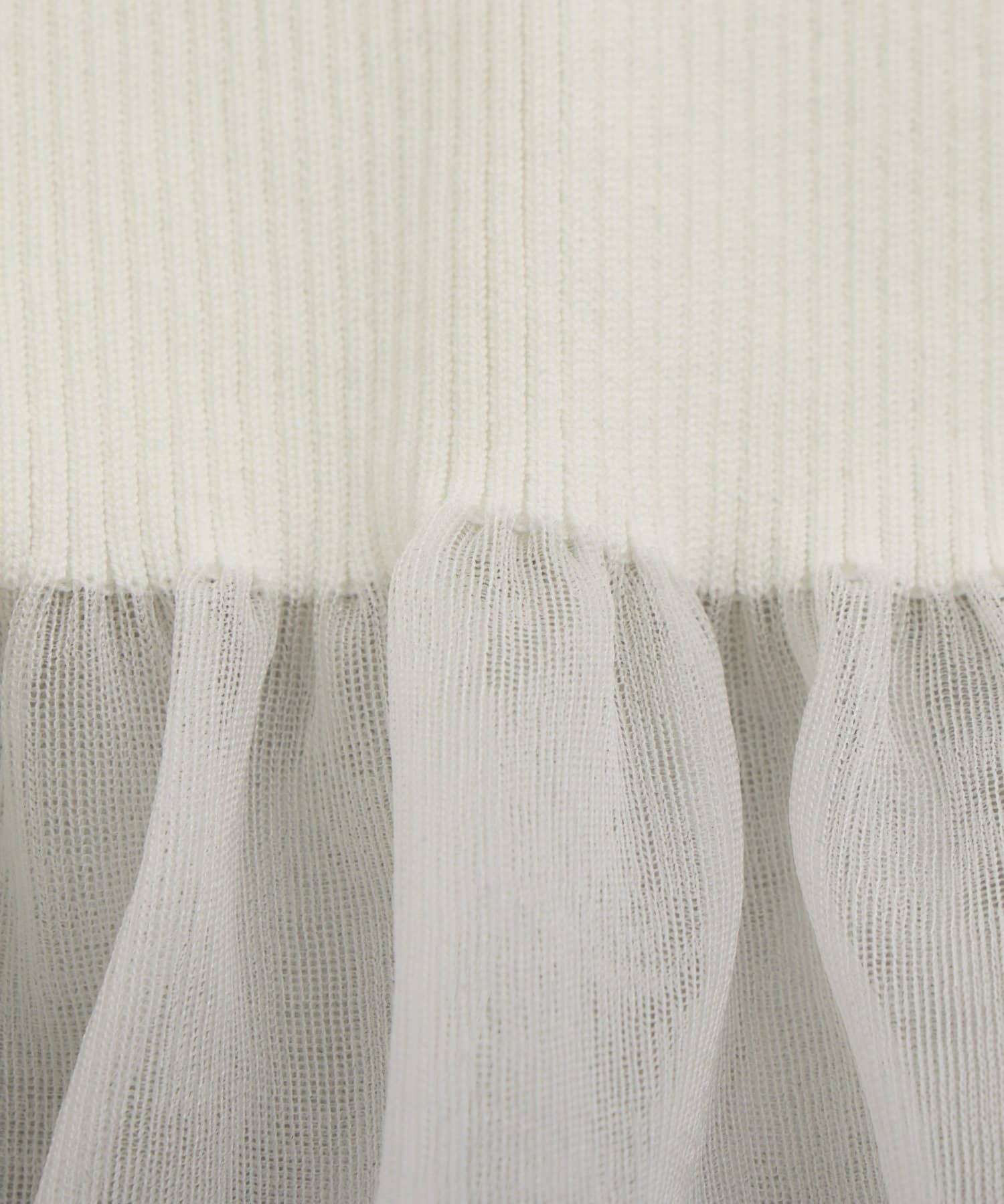 上品な透け感のシアーフリルが目を引く、レイヤード風デザインのニットトップス。