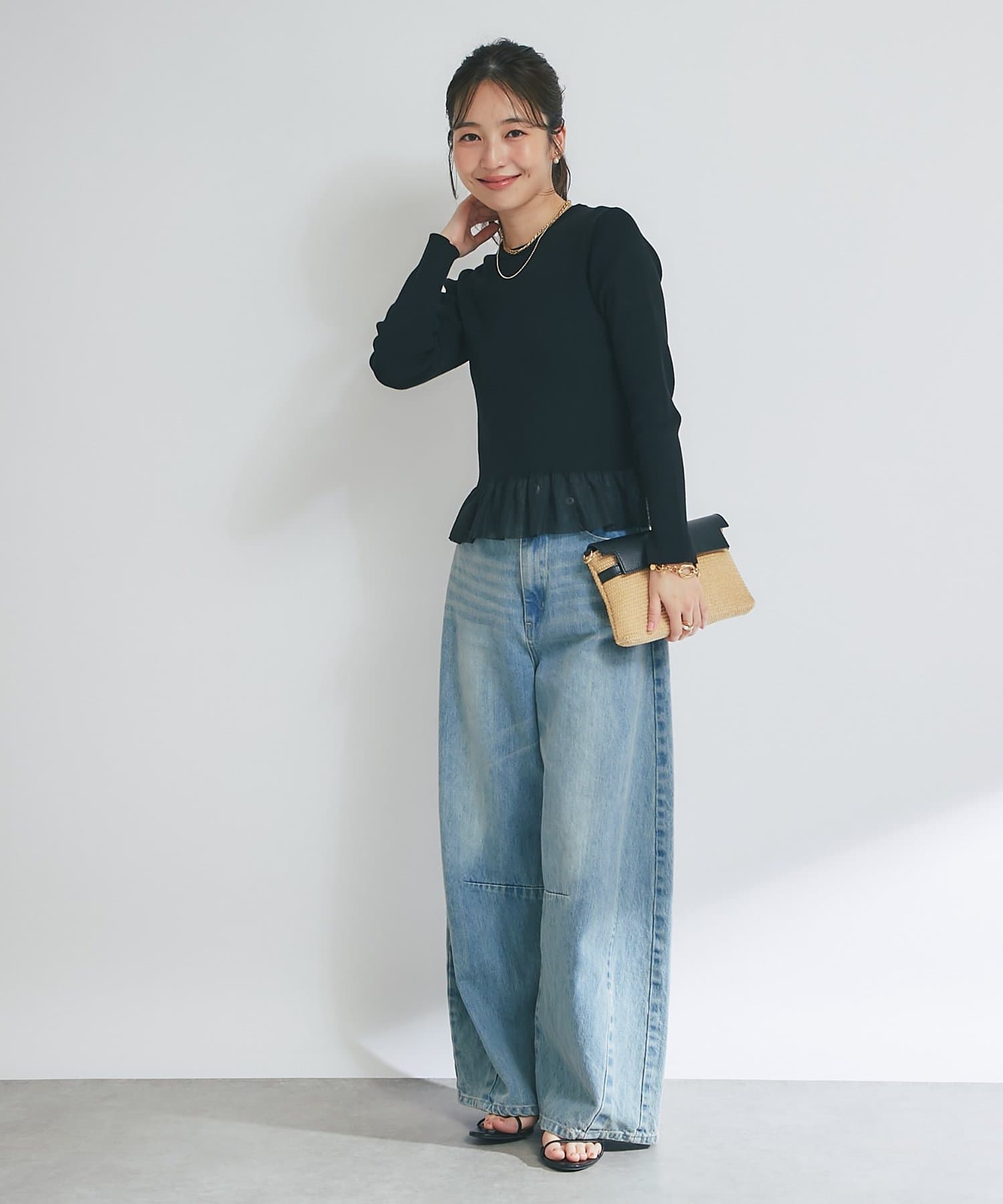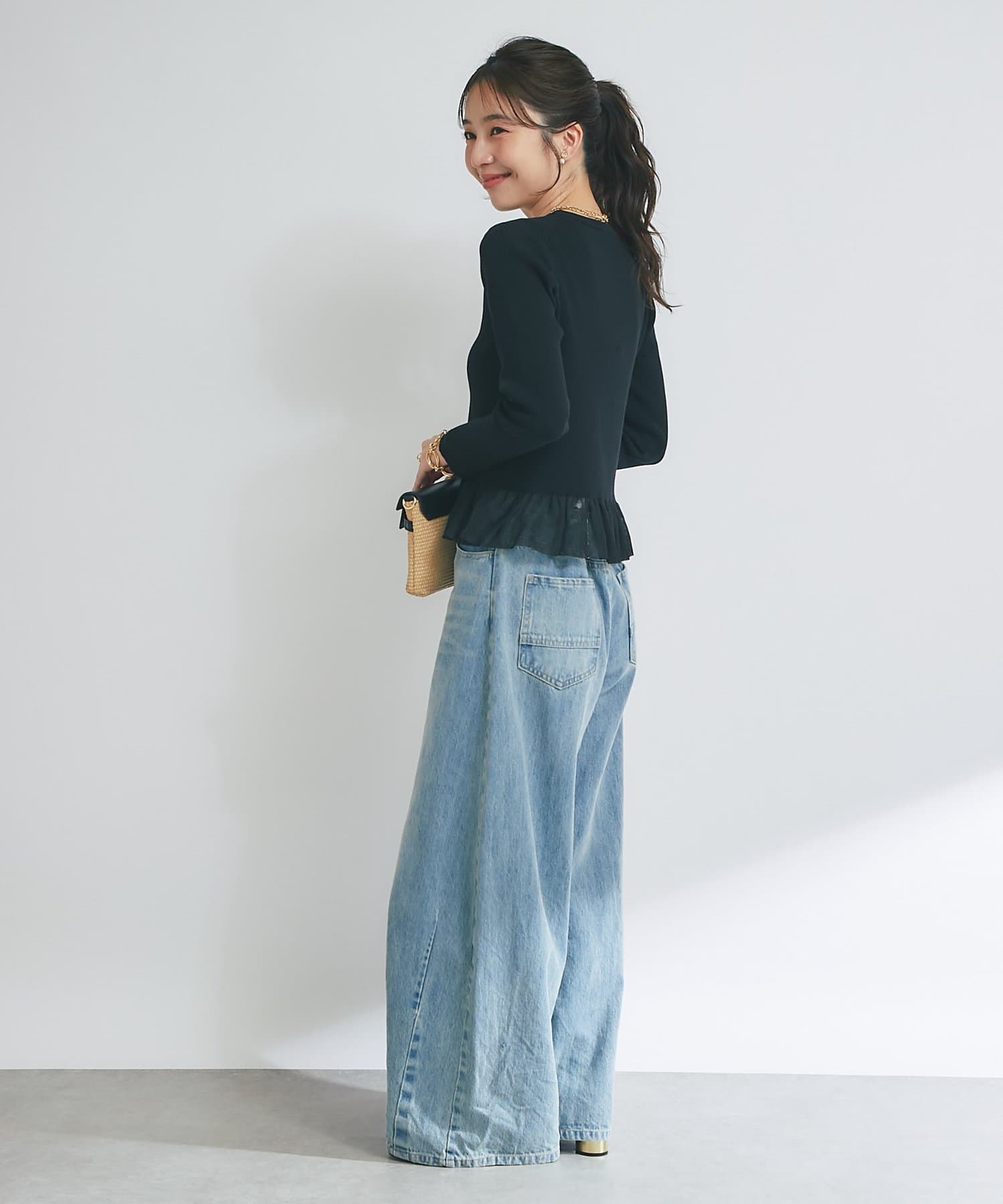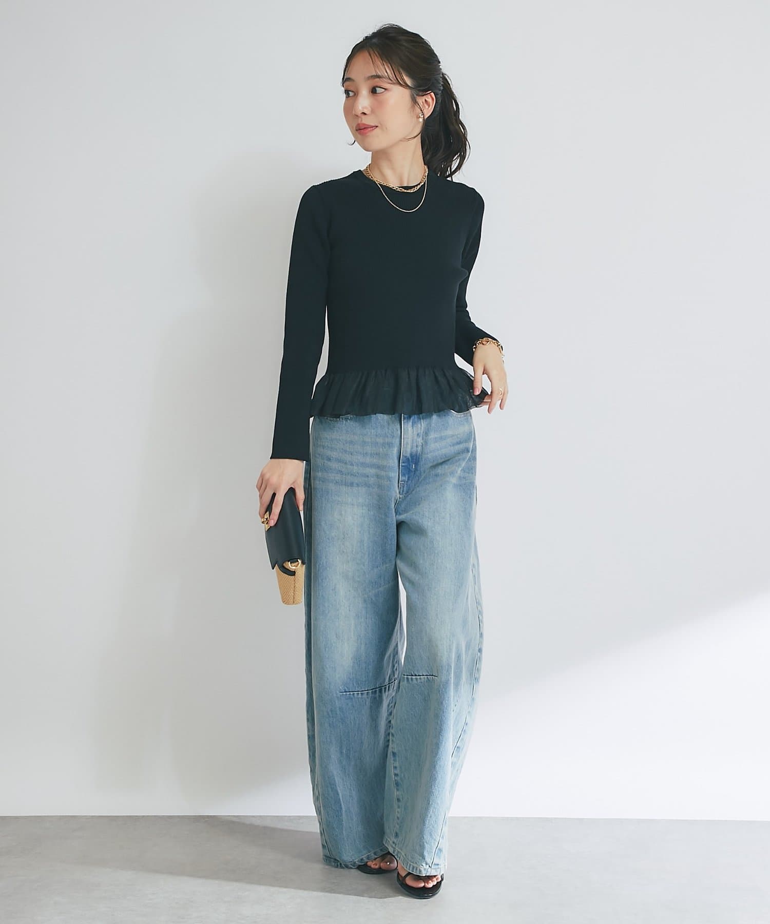 裾からふんわりとのぞくシアー素材のフリルが、スタイリングに華やかさをプラス。