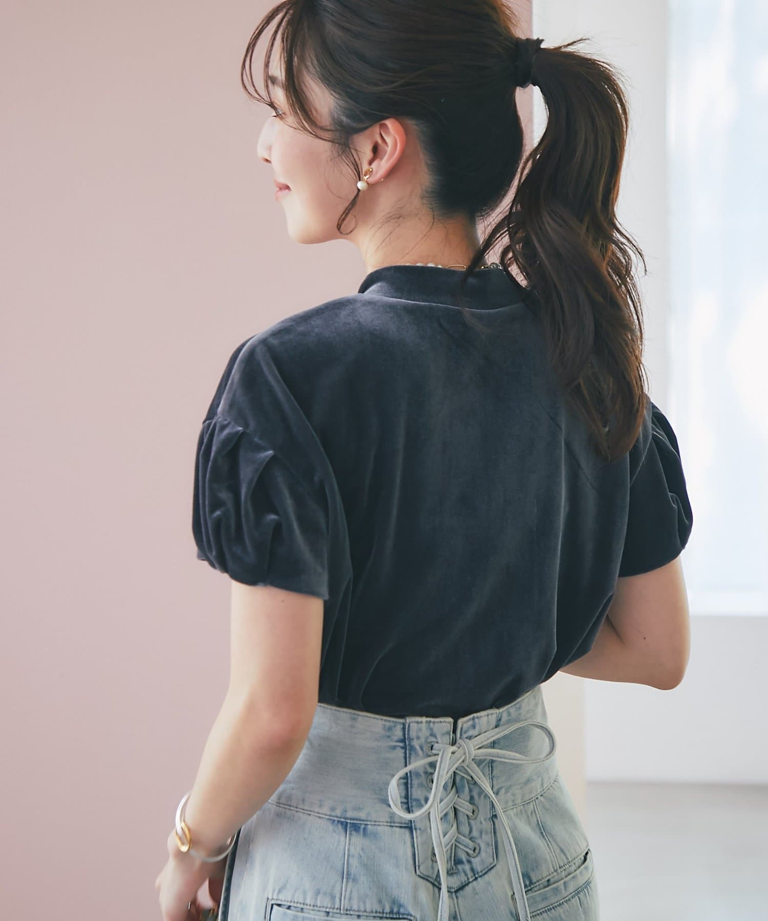 チューリップの花びらのようなお袖が可愛らしい、トレンド感漂うベロアトップス。