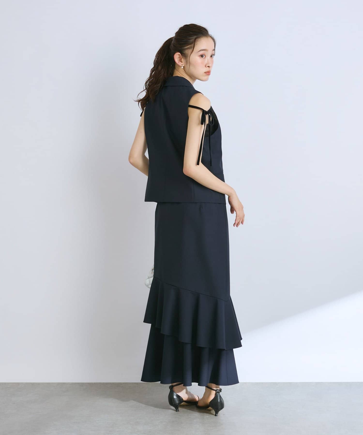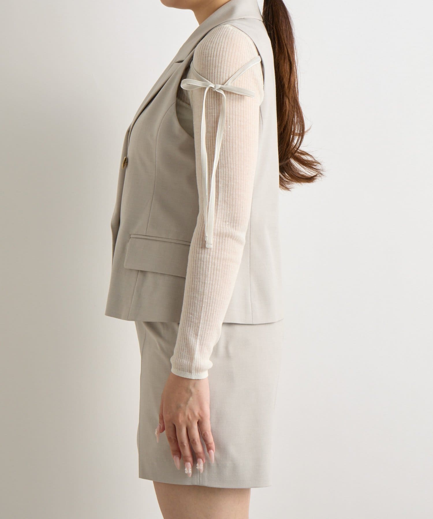 両肩にあしらわれたベルベットリボンが、さりげないアクセントになり
