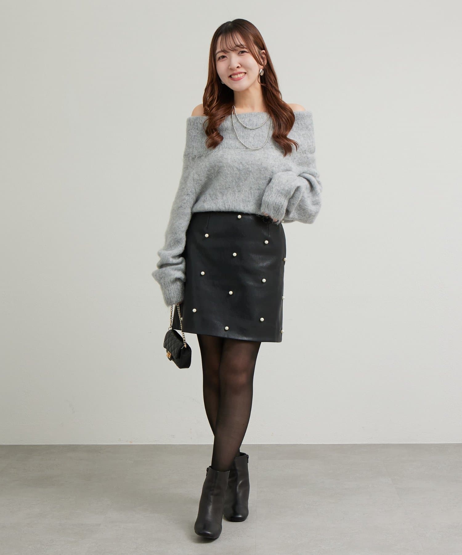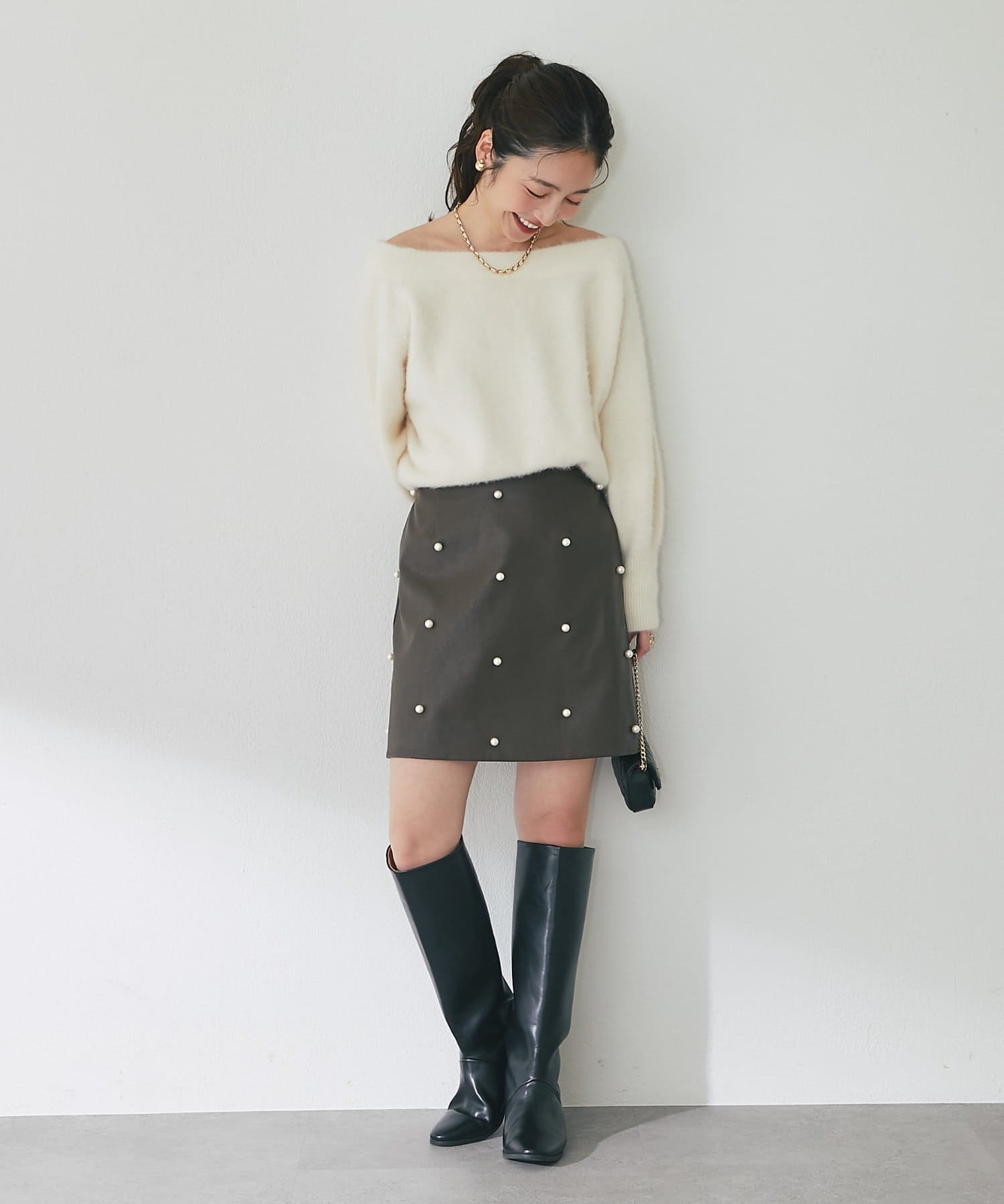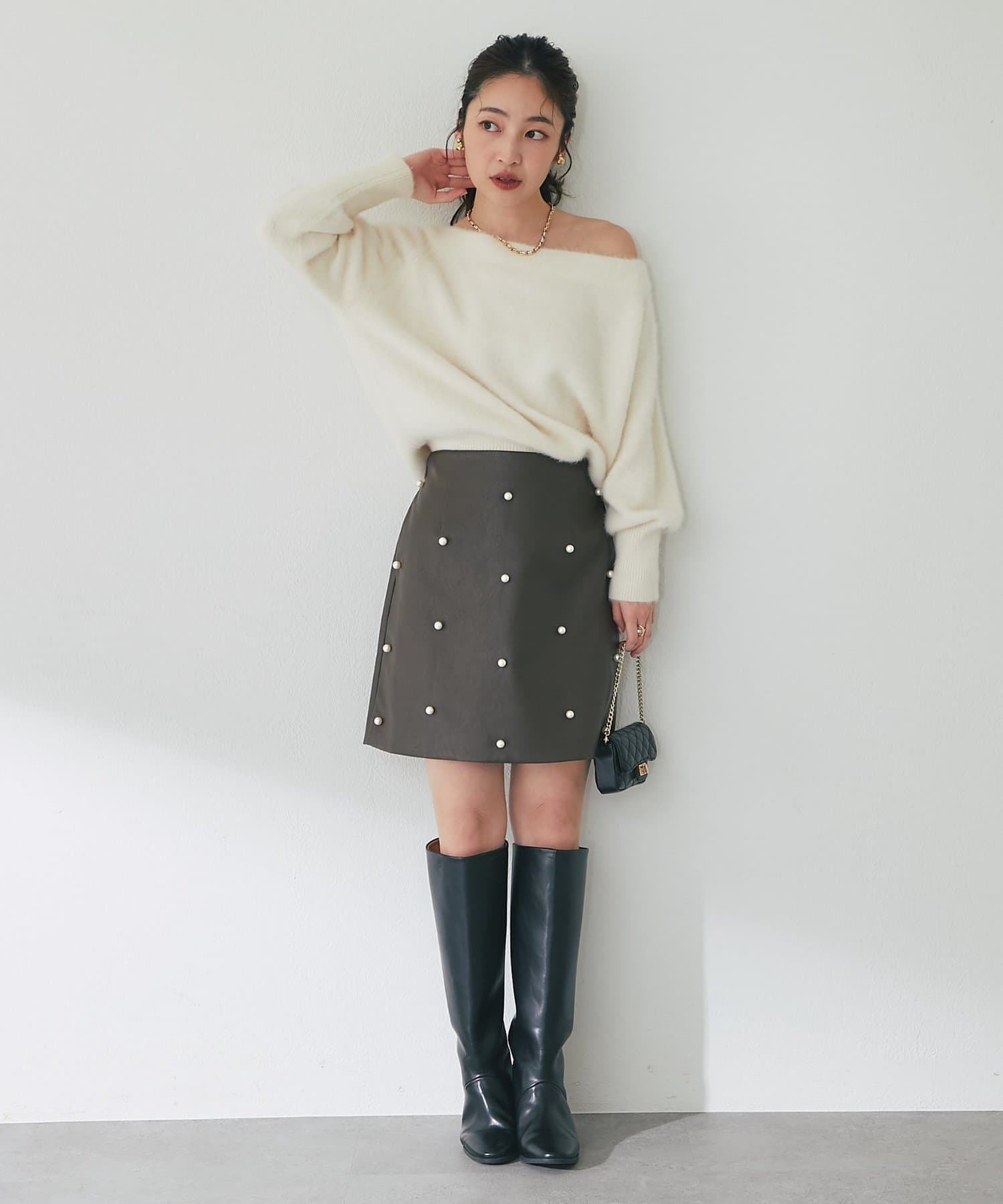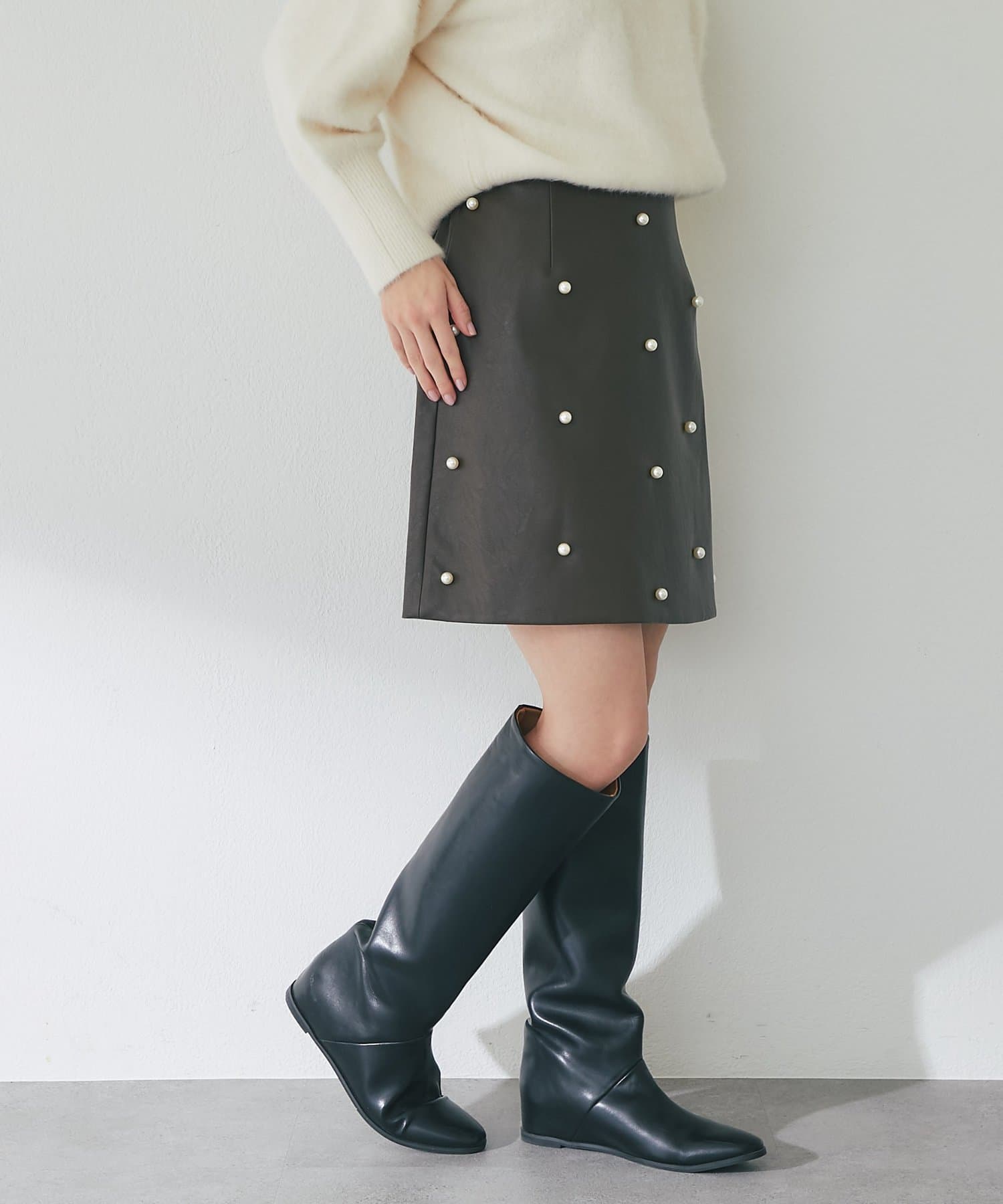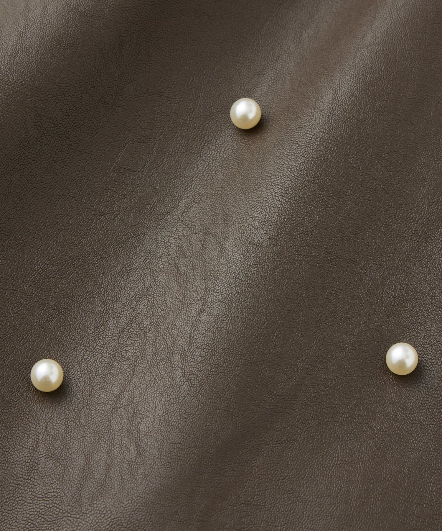 ハードになりがちな合成皮革のスカートに、あえてパールをあしらうことで