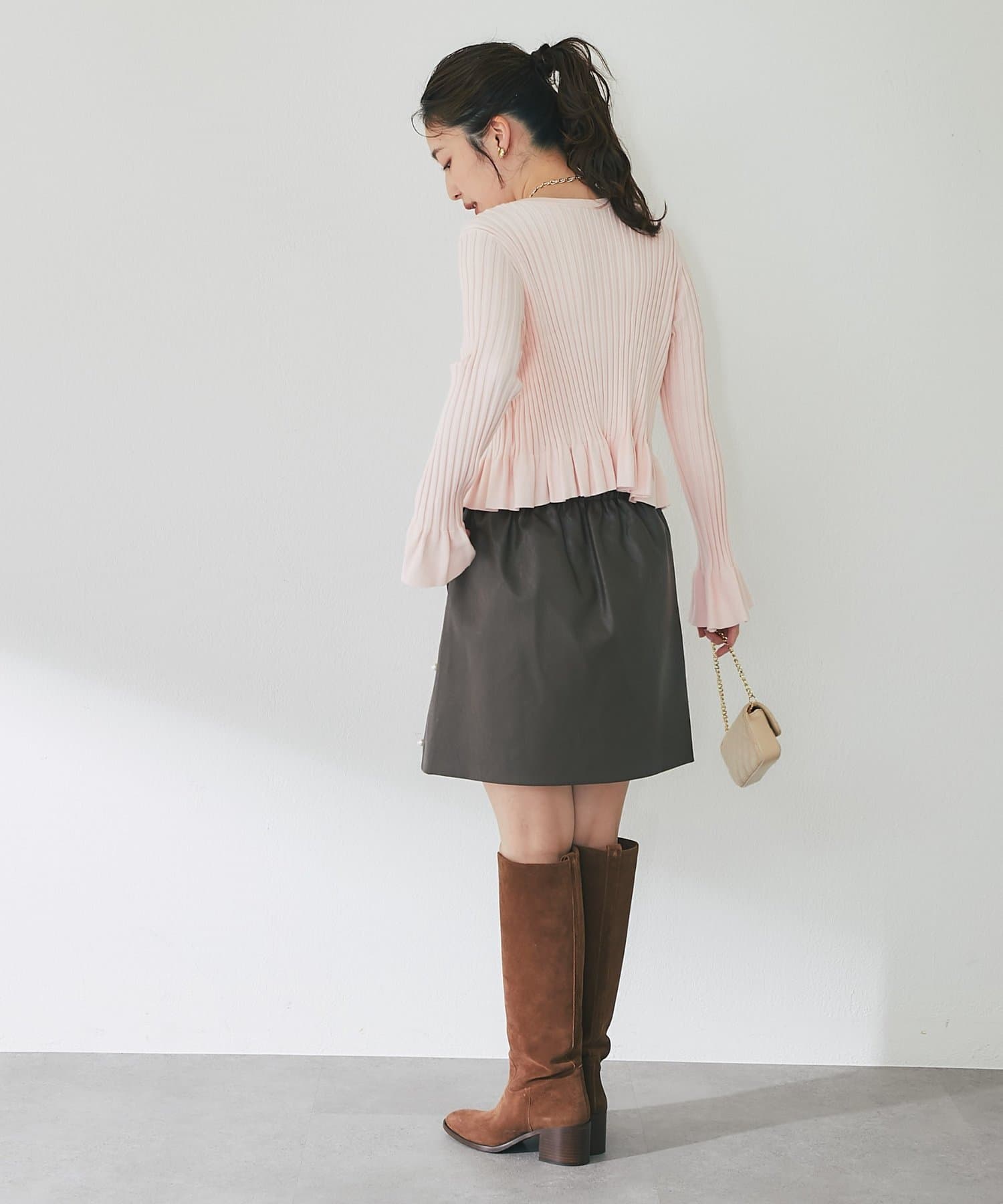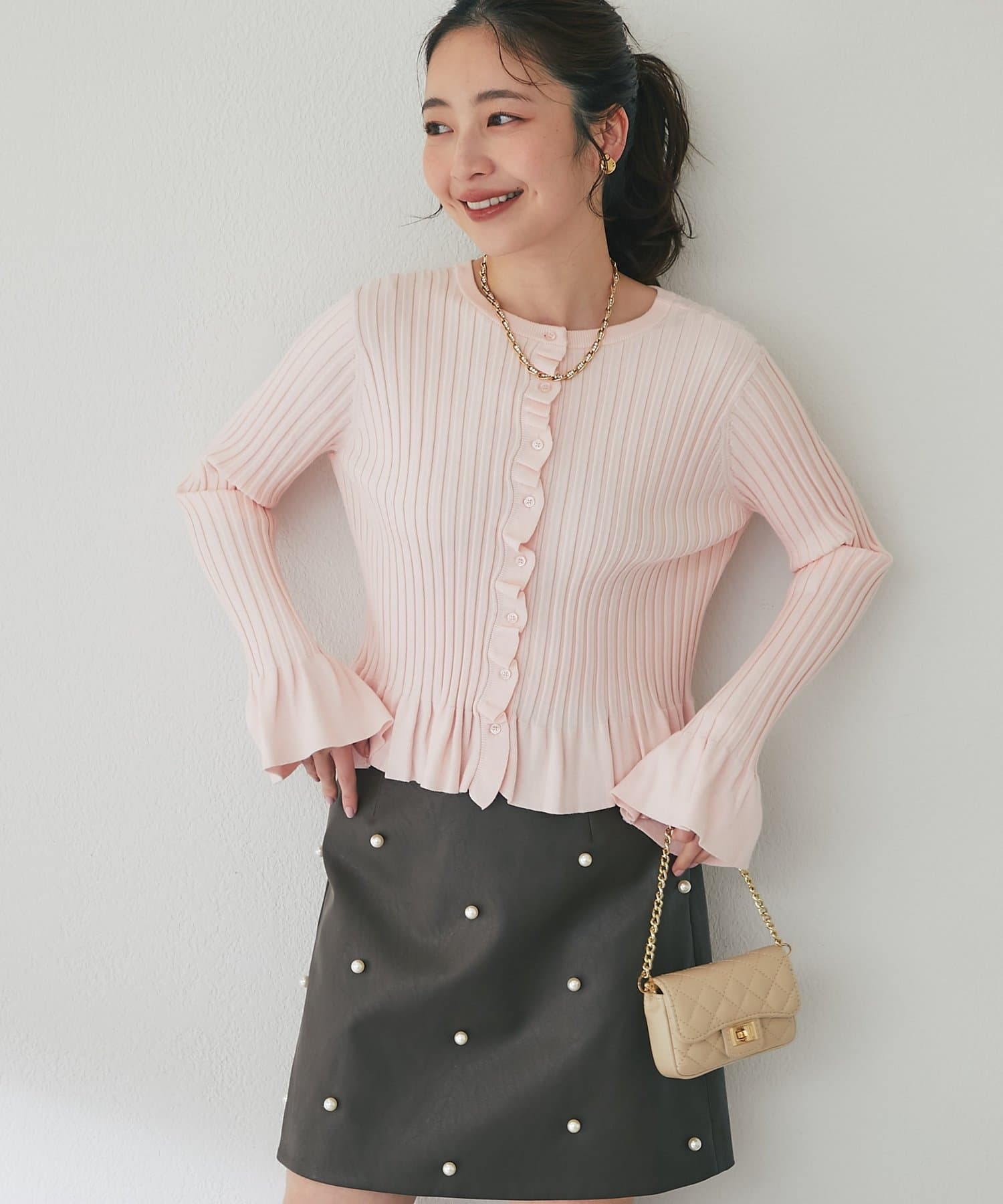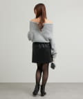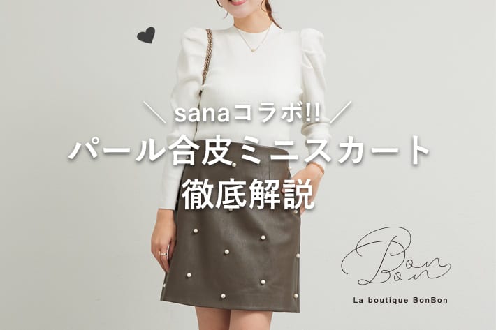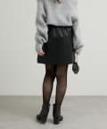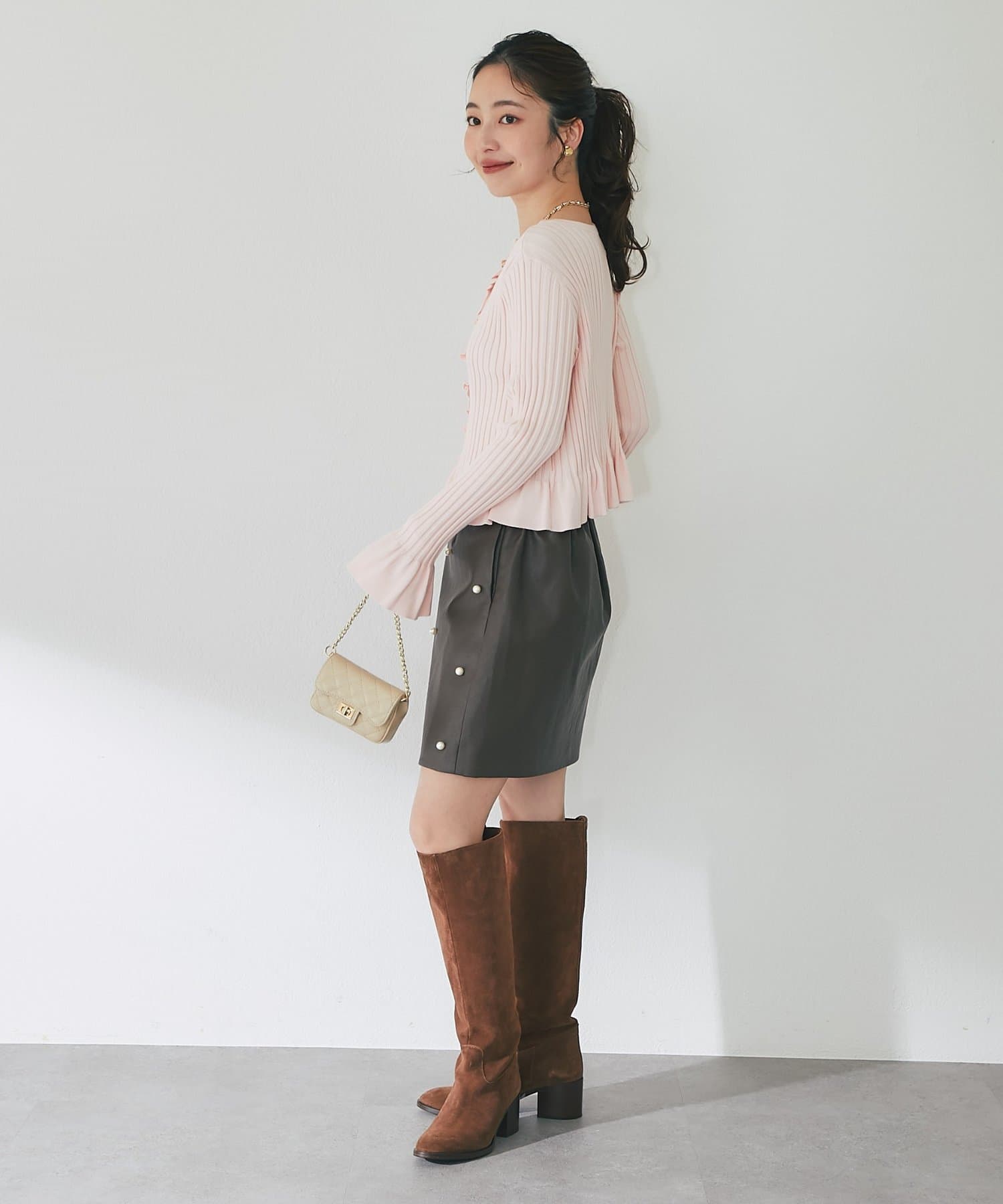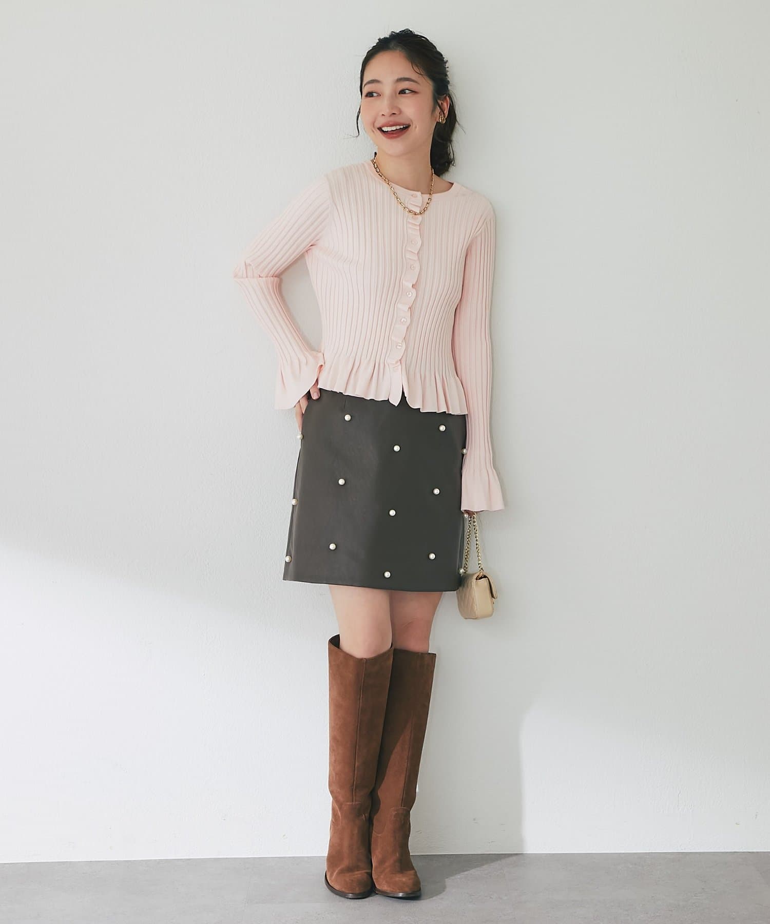ハードになりがちな合成皮革のスカートに、あえてパールをあしらうことで