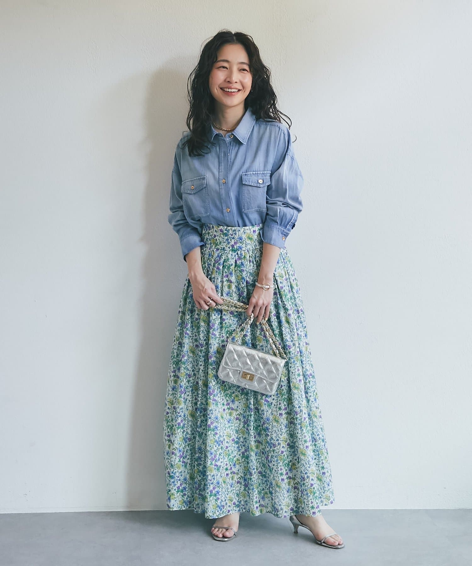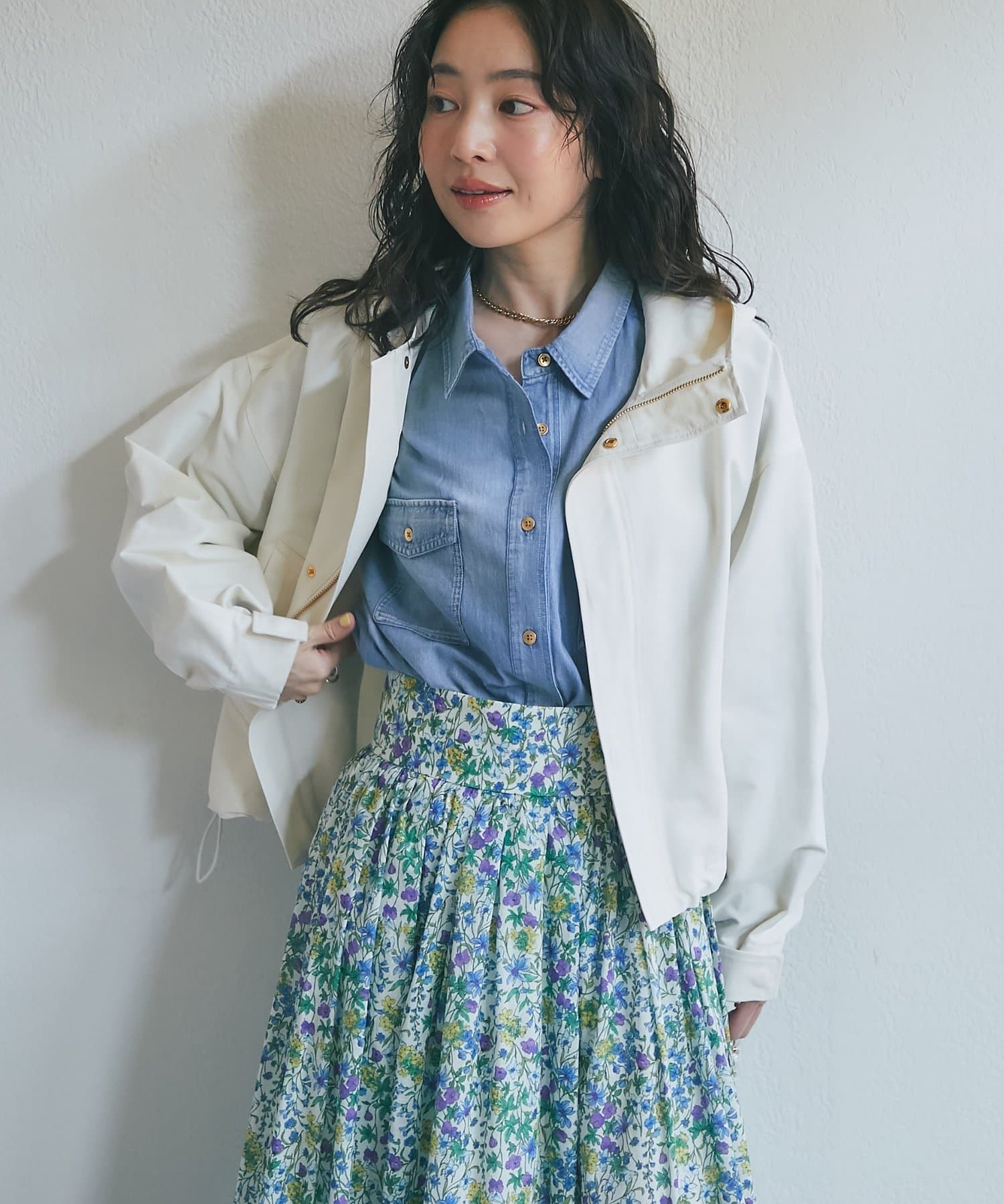 スカートやワンピースに羽織れば、カジュアルミックススタイルが完成。