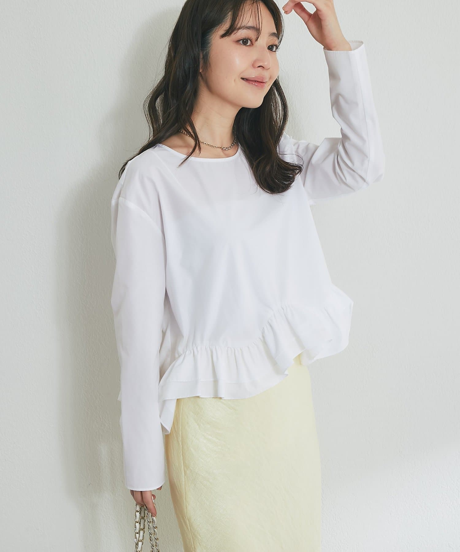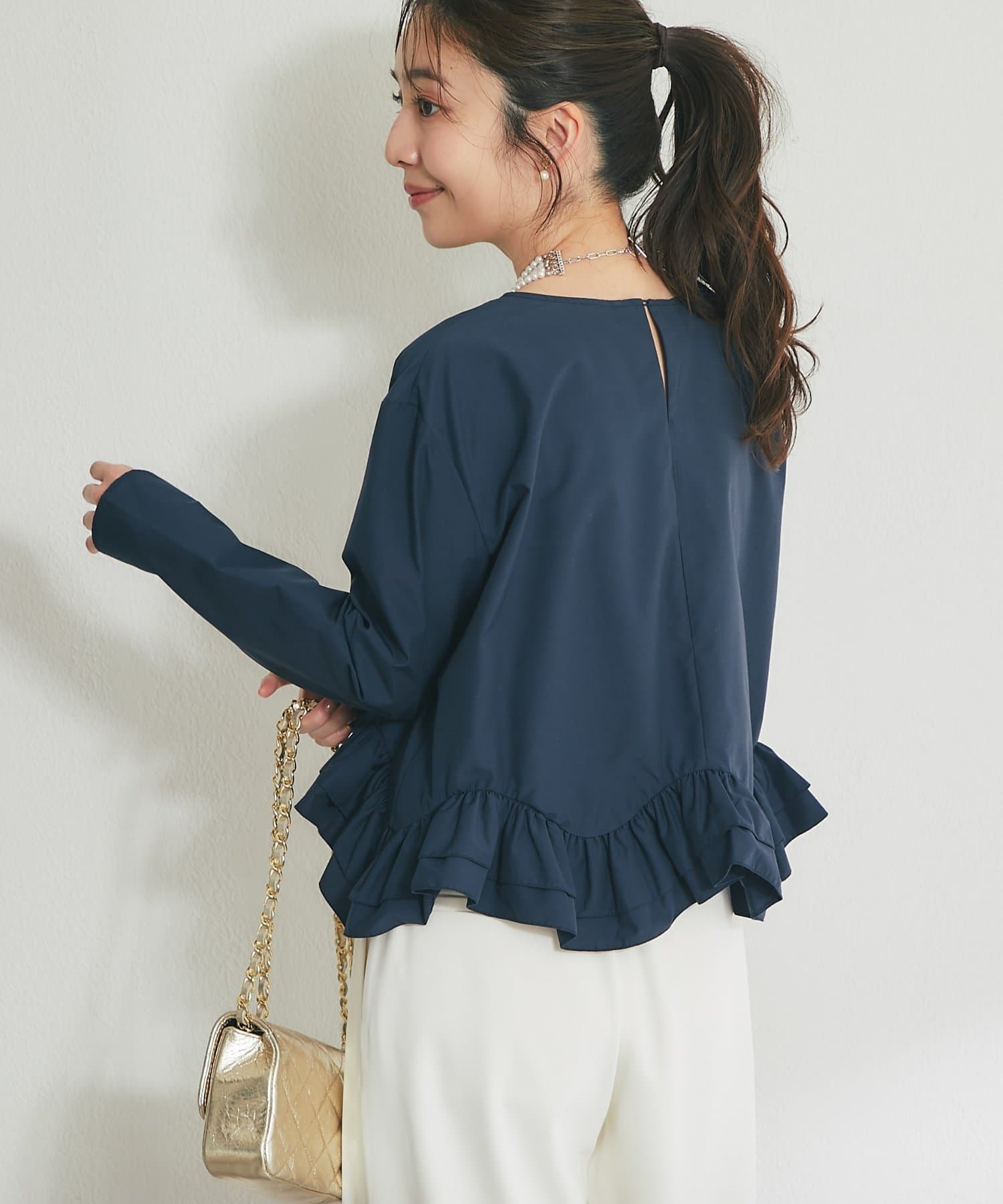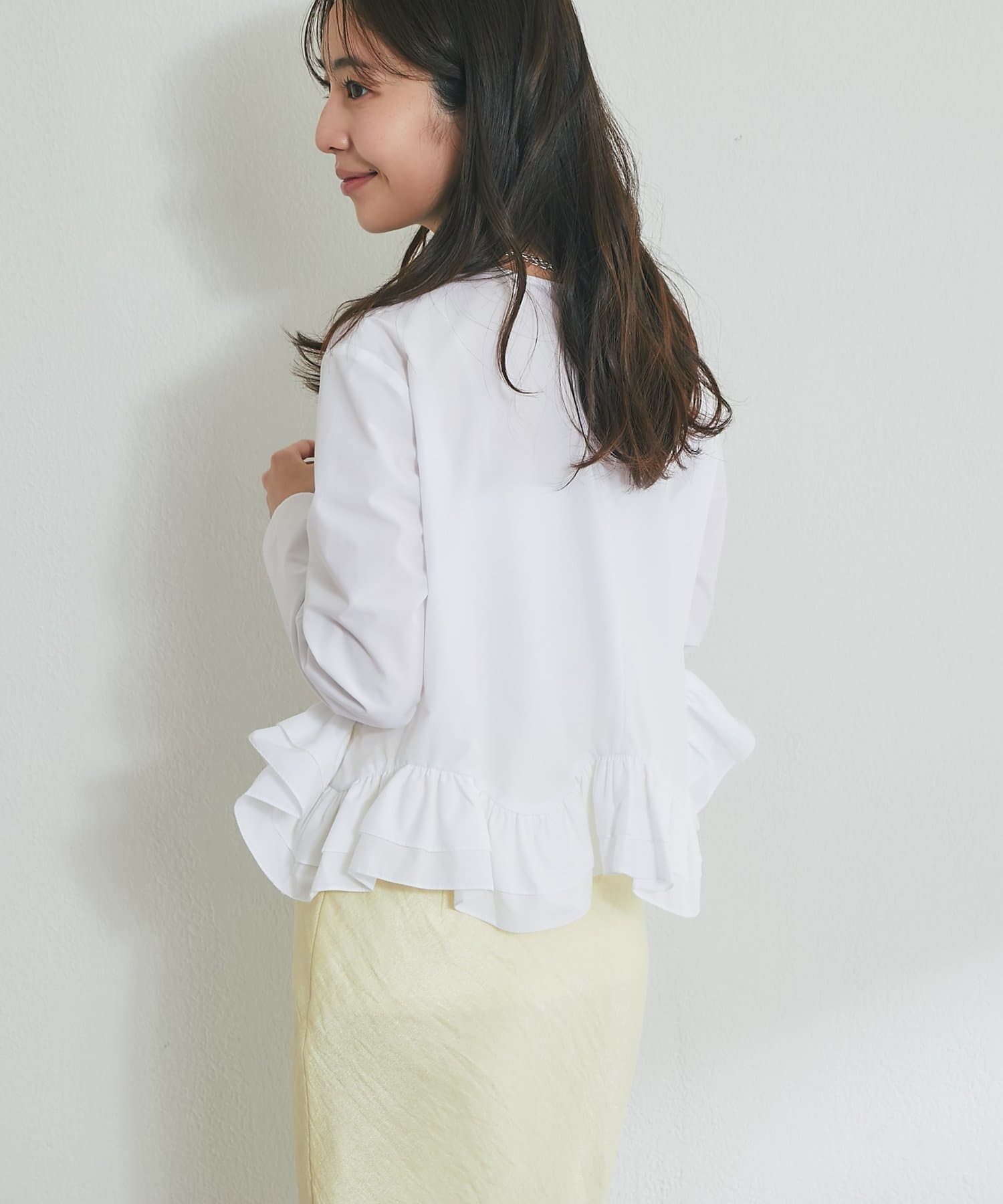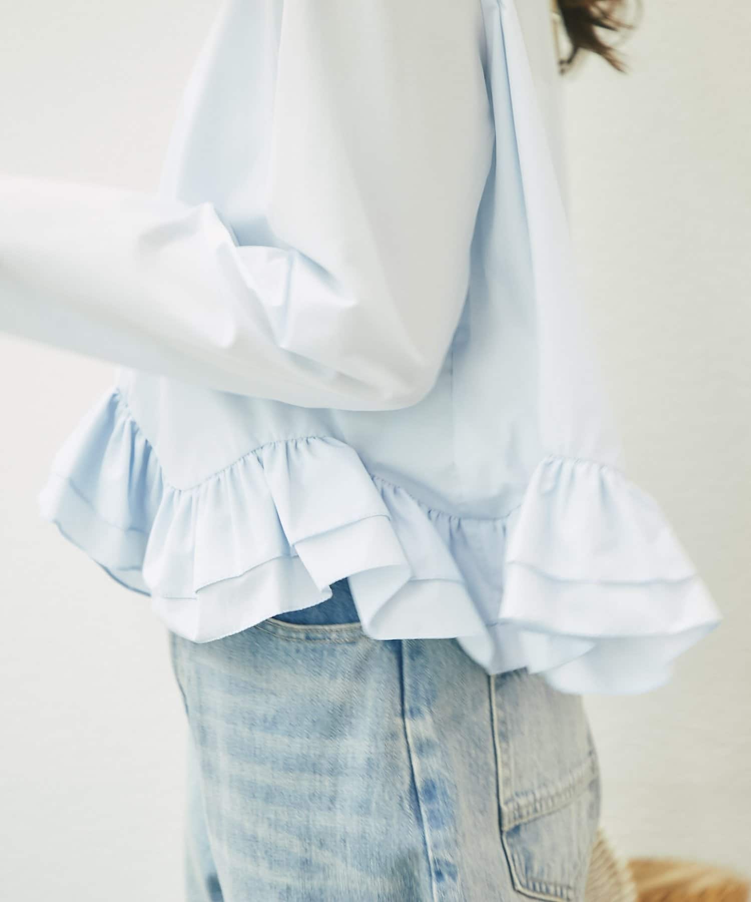シンプルなシルエットに、ふんわりと軽やかなフリルが映えるブラウス。