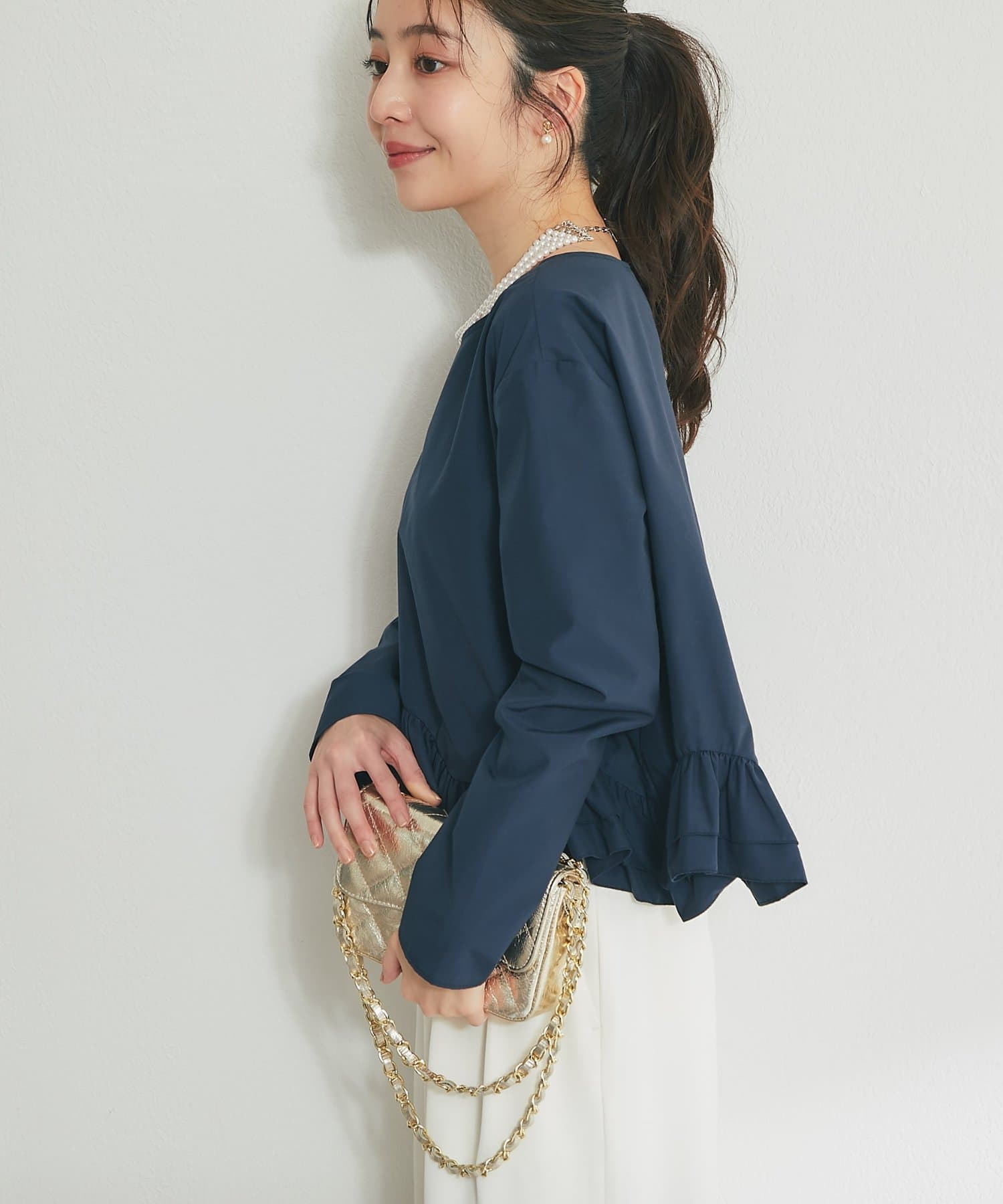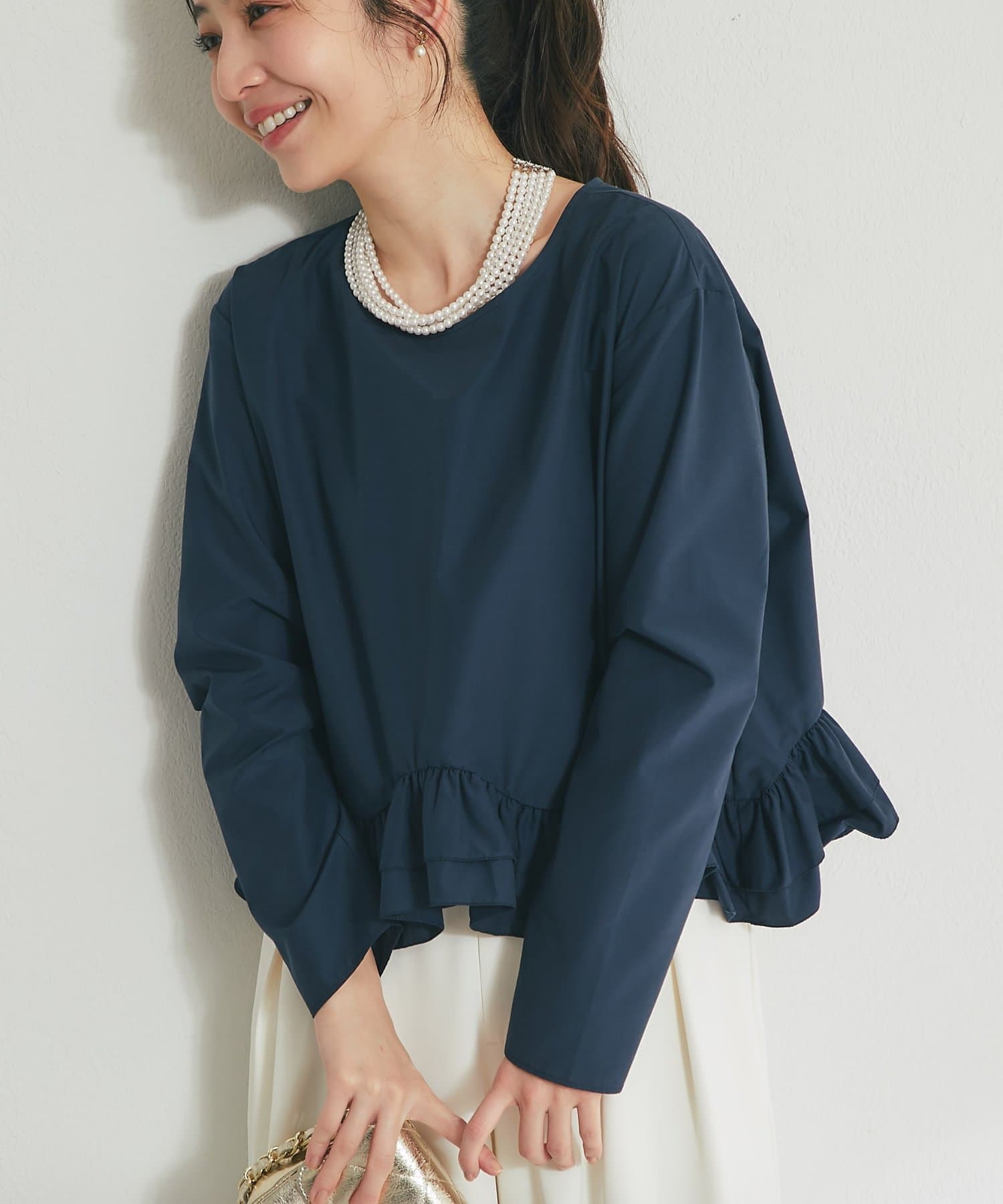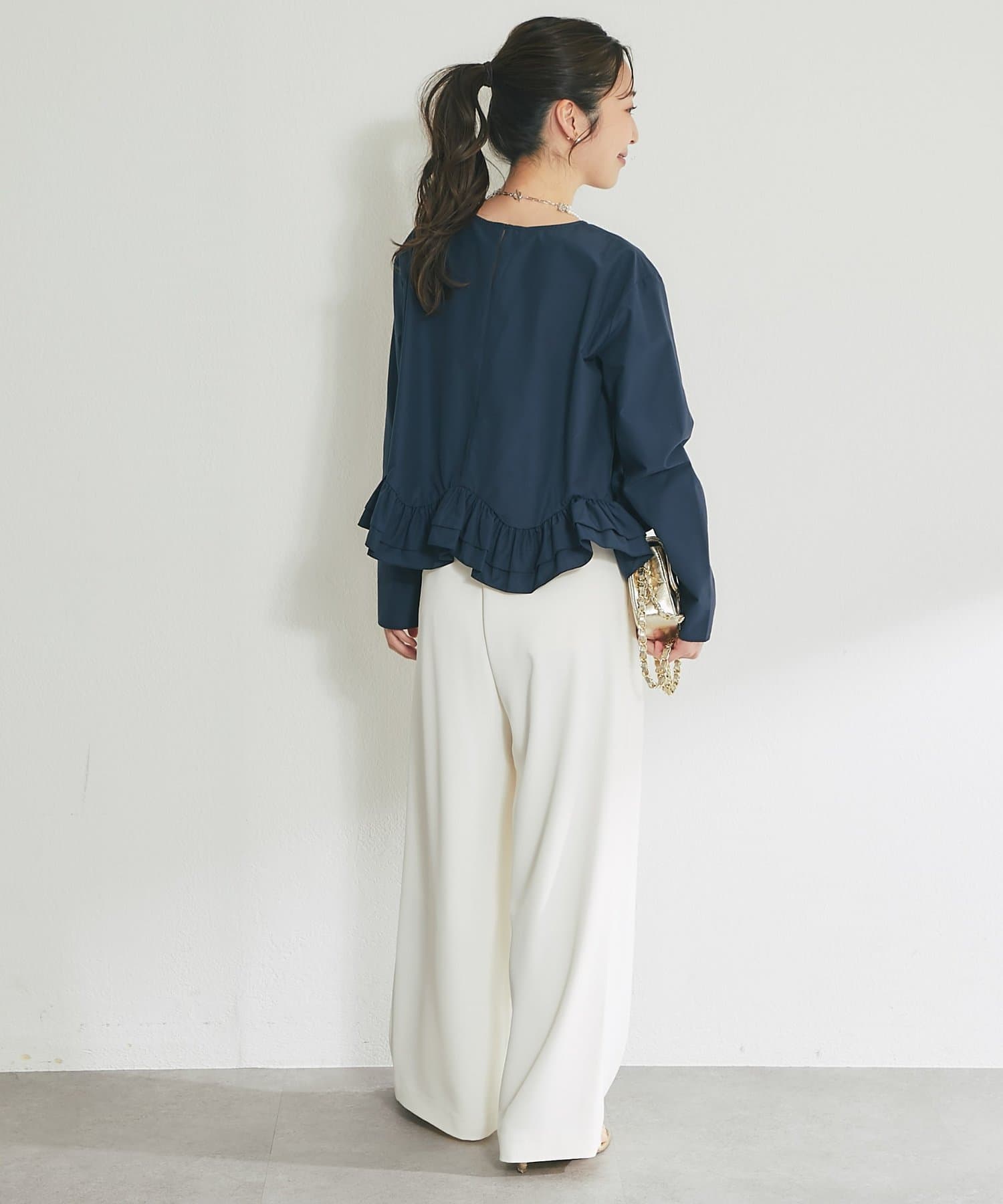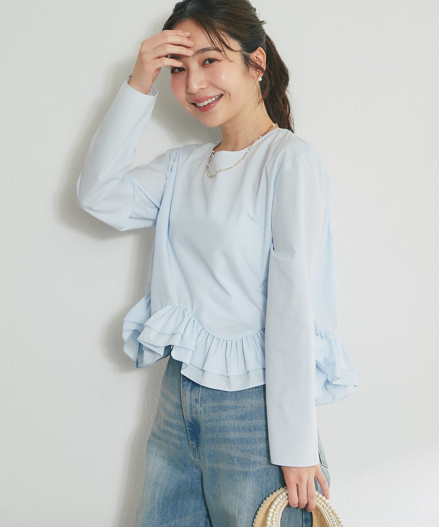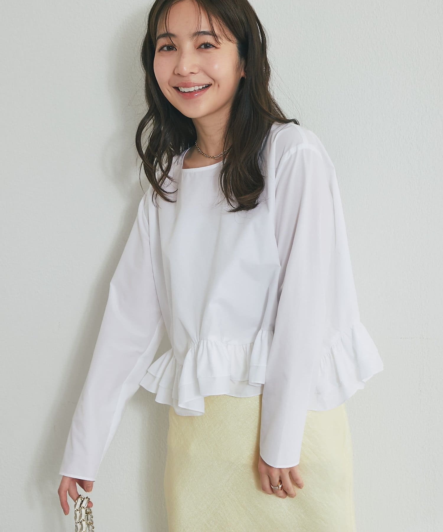 シンプルなシルエットに、ふんわりと軽やかなフリルが映えるブラウス。