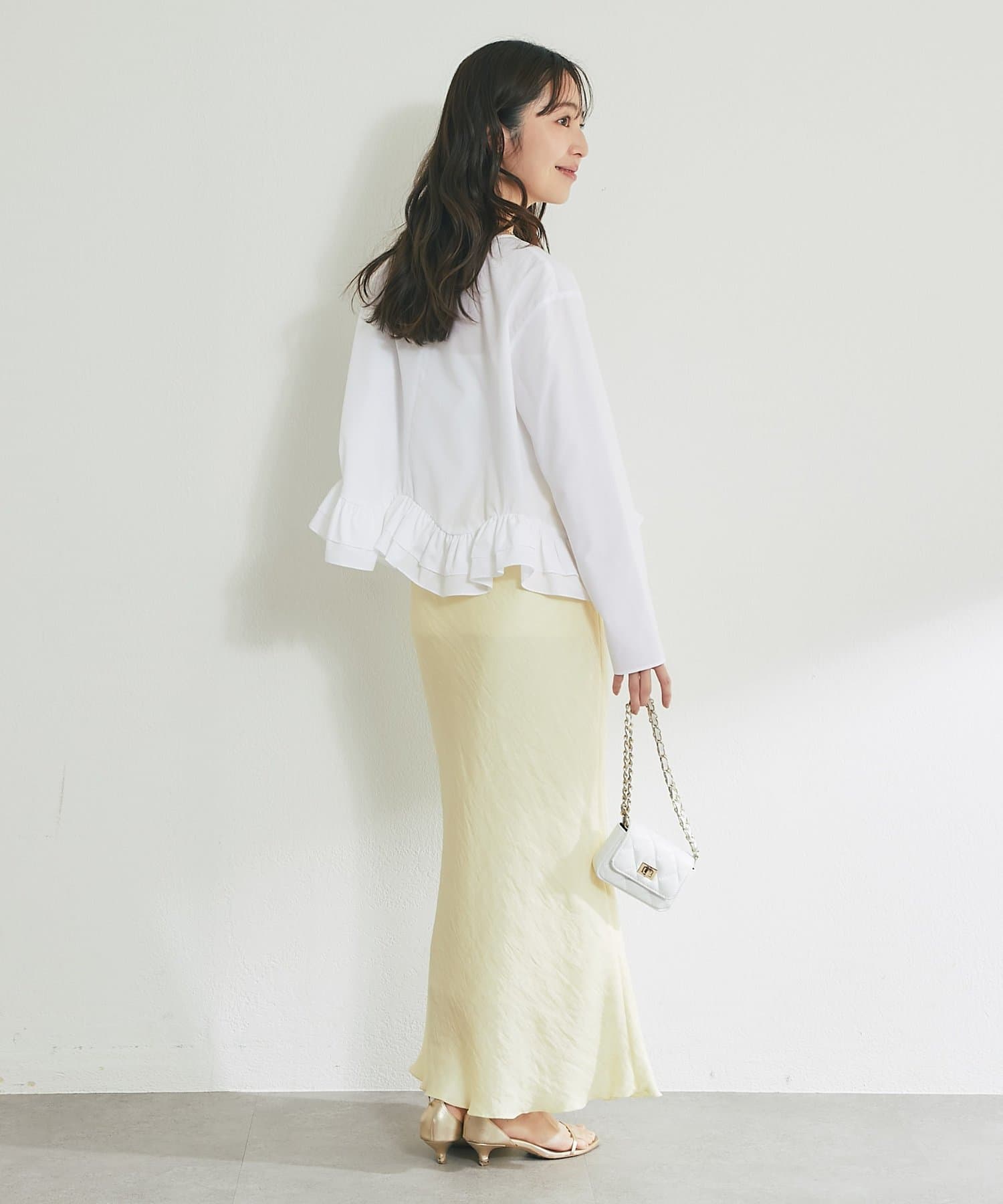 裾からフリルを覗かせるコーディネートもおすすめ。