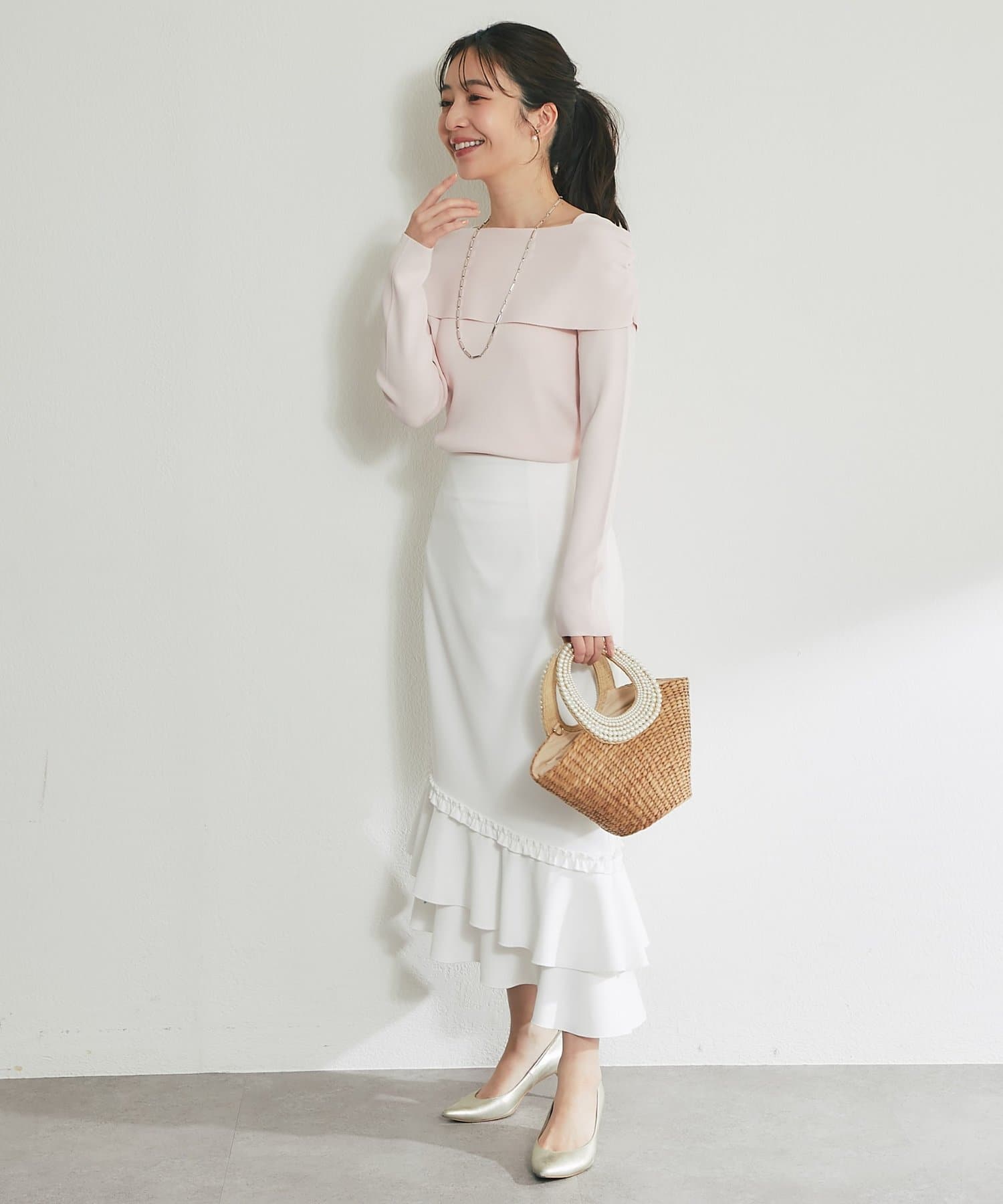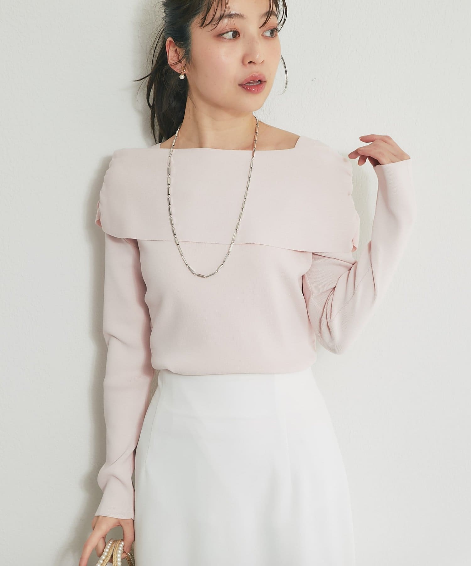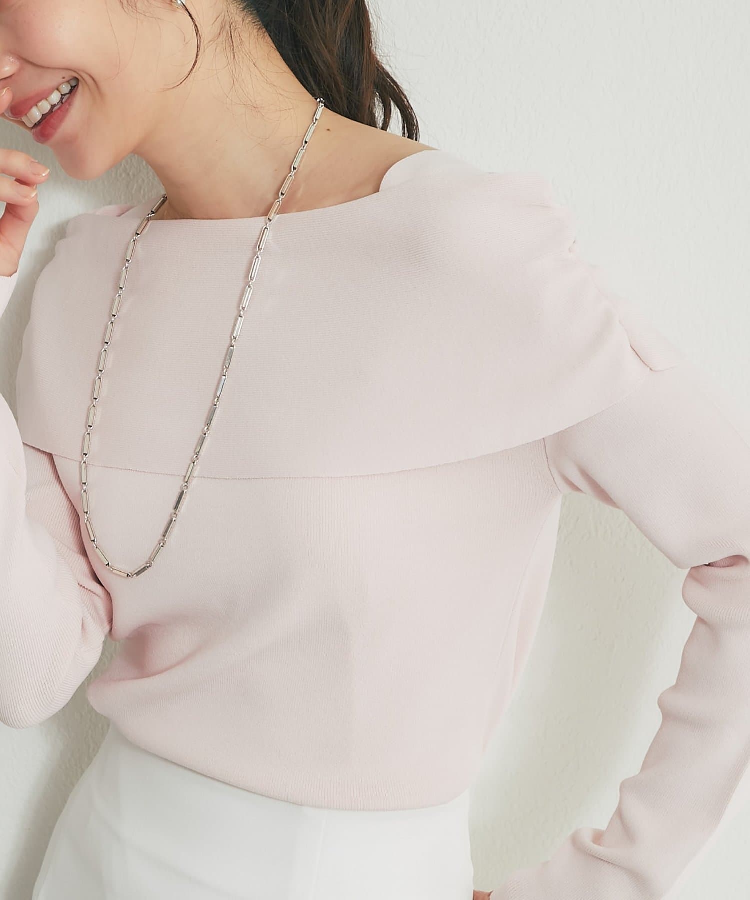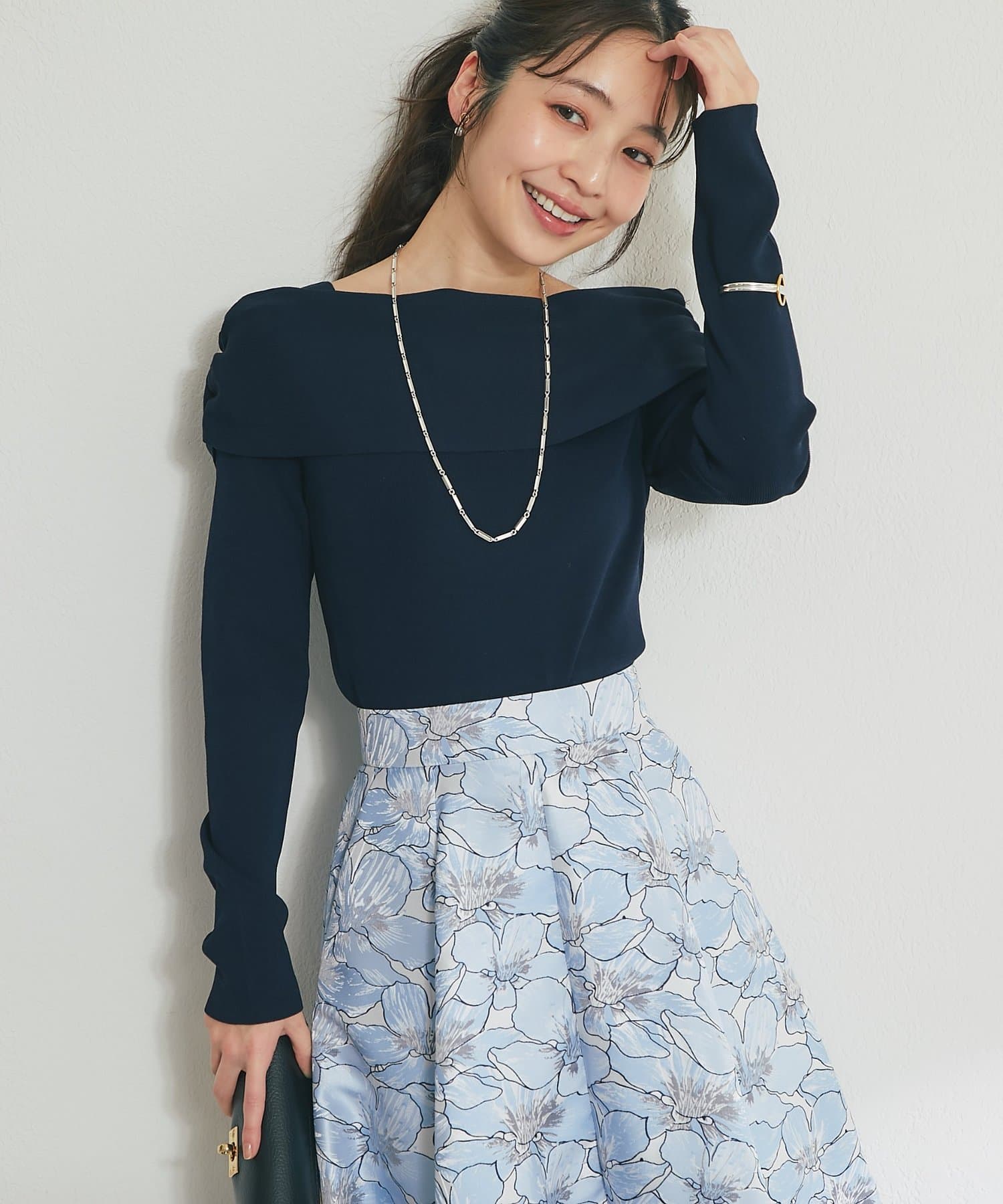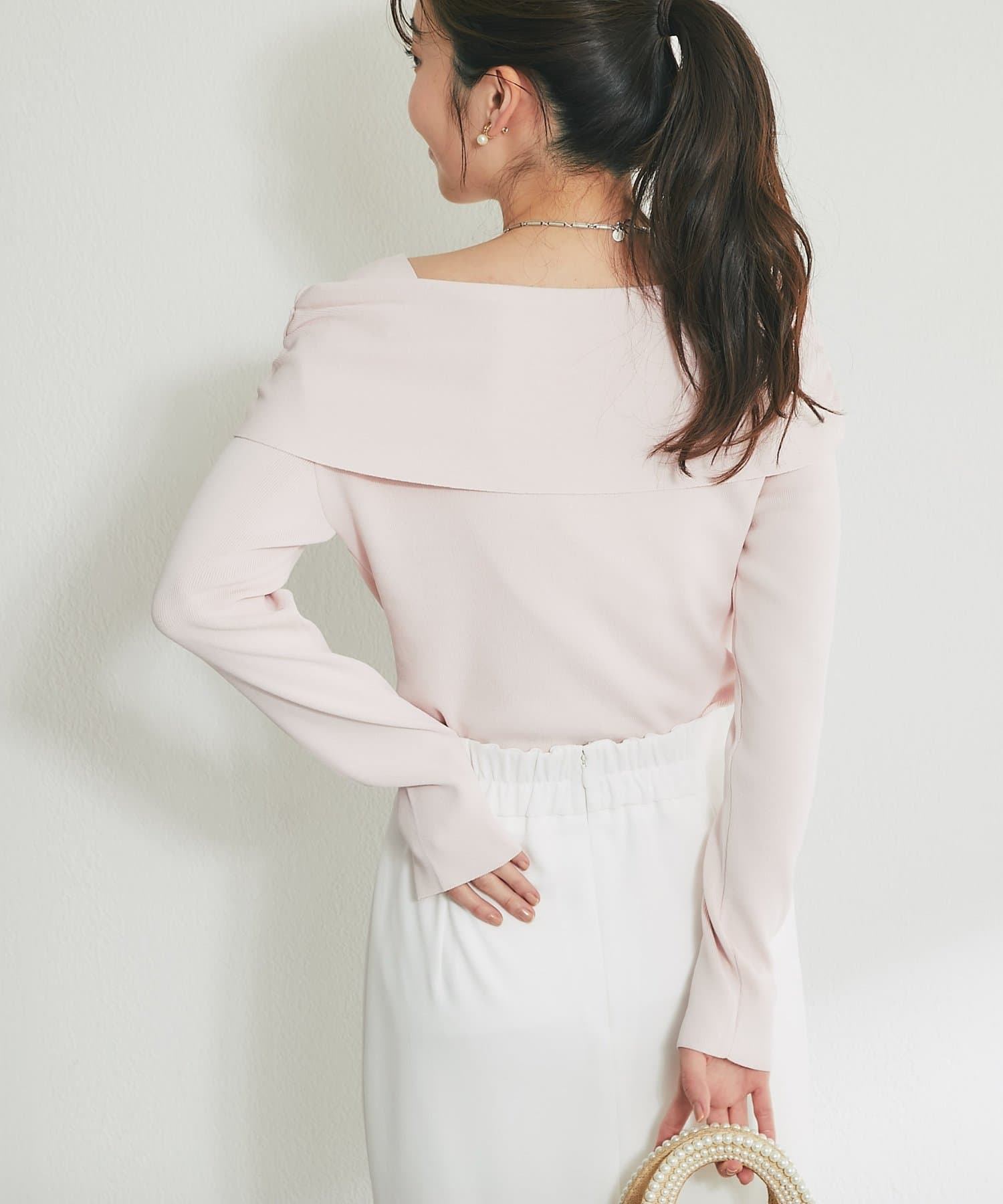 トレンドのオフショルデザインで、女性らしい華奢なデコルテラインを演出。