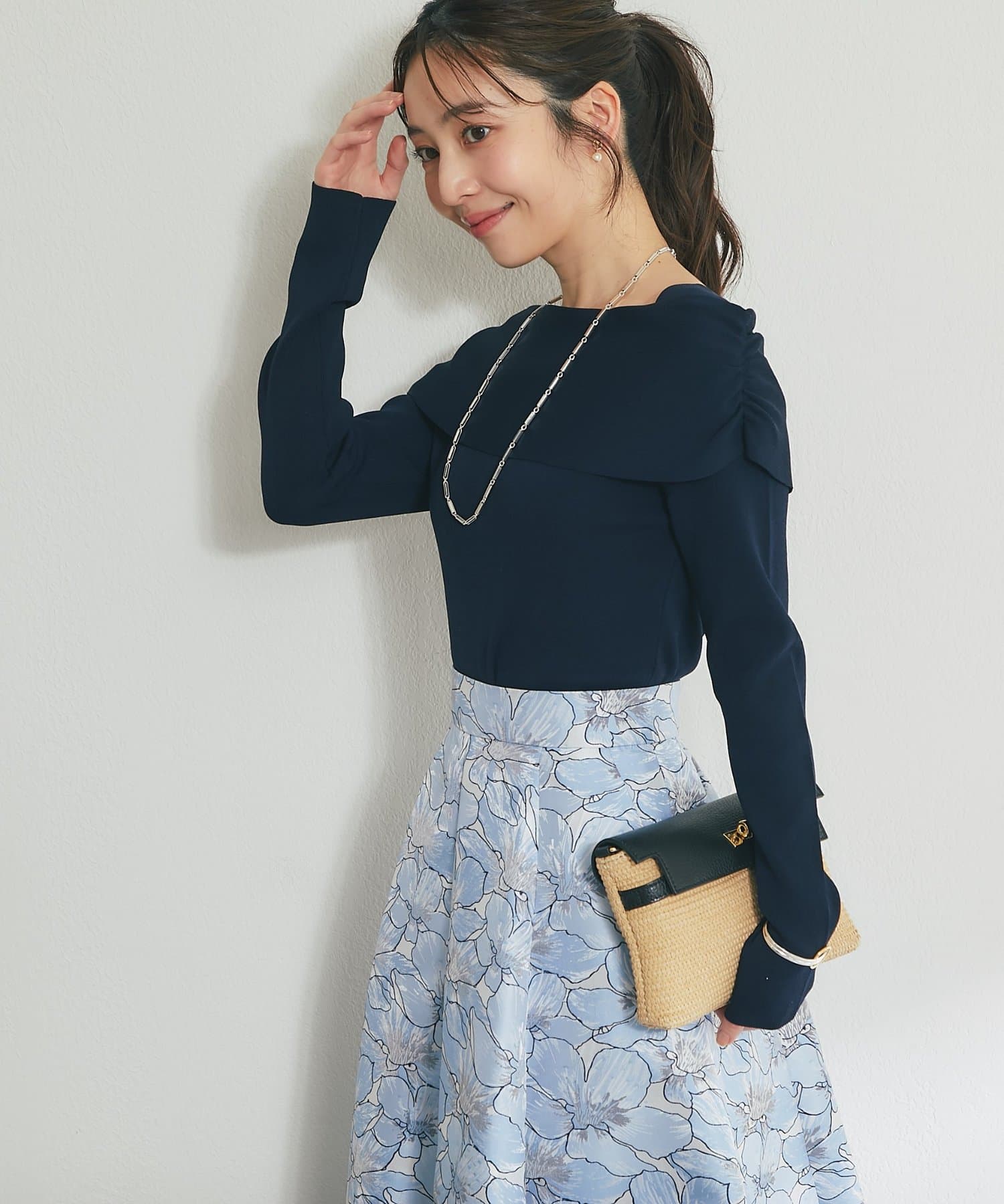袖は長袖なので、気になる二の腕をカバーしつつ、上品な印象を与えます。