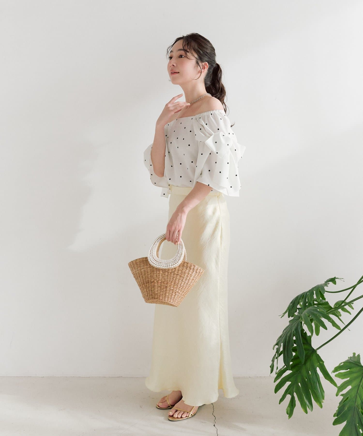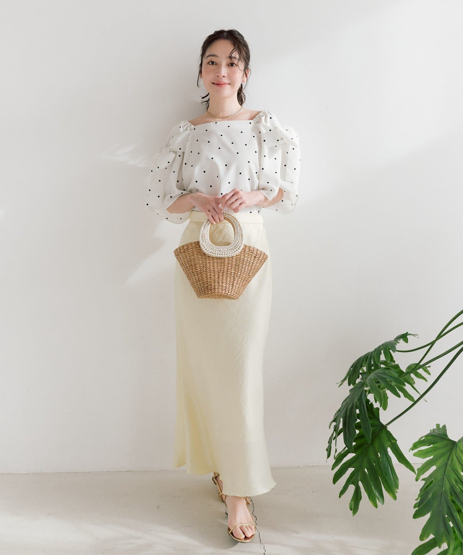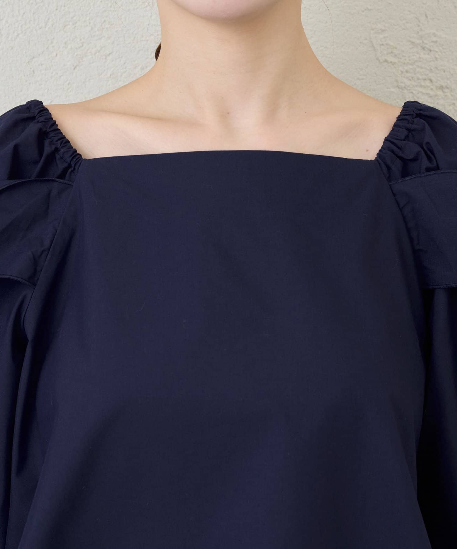 デコルテがきれいに見えるスクエアネックで、デコルテを綺麗に見せて大人の肌見せ。