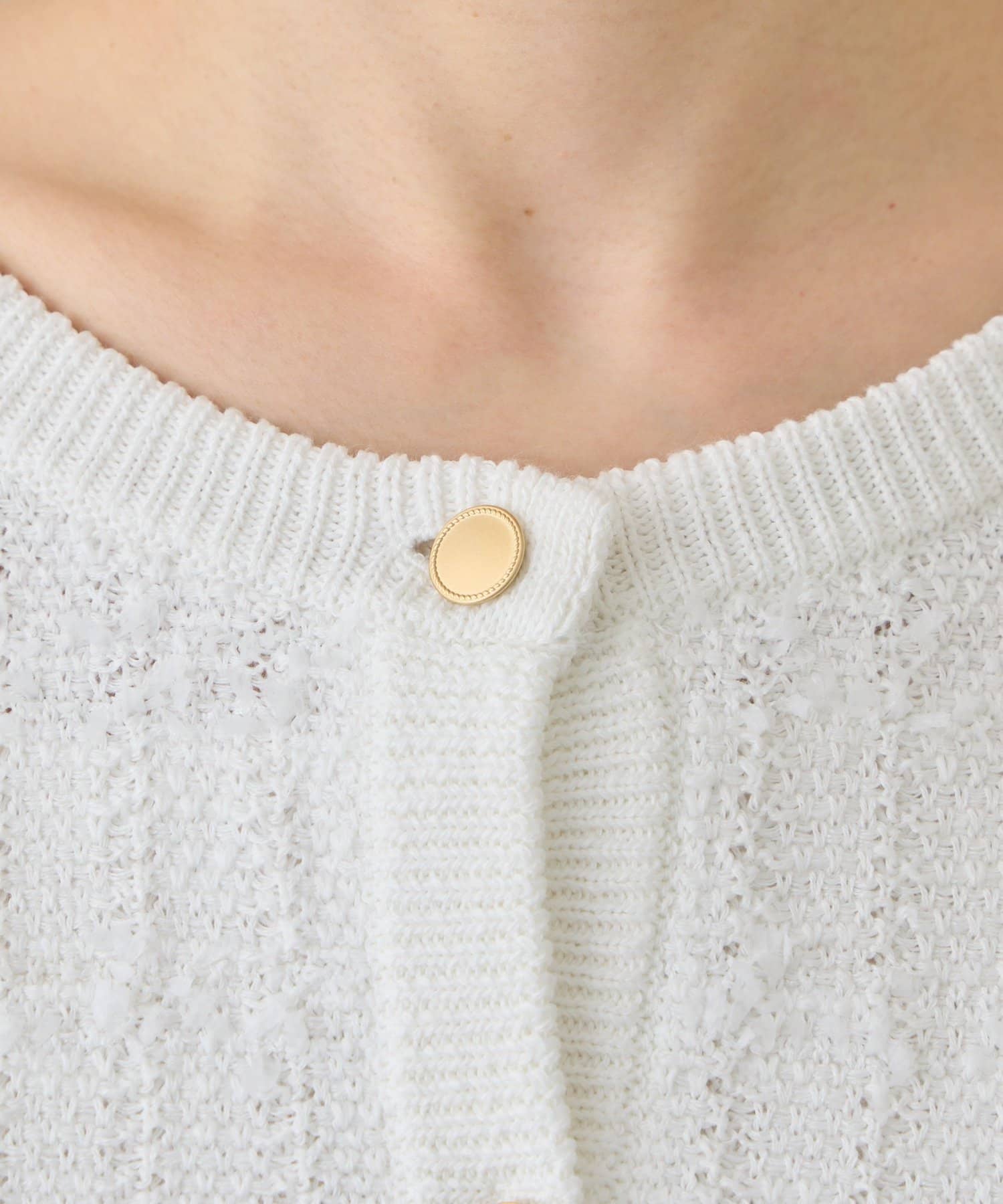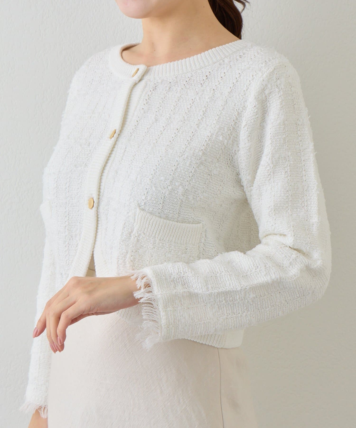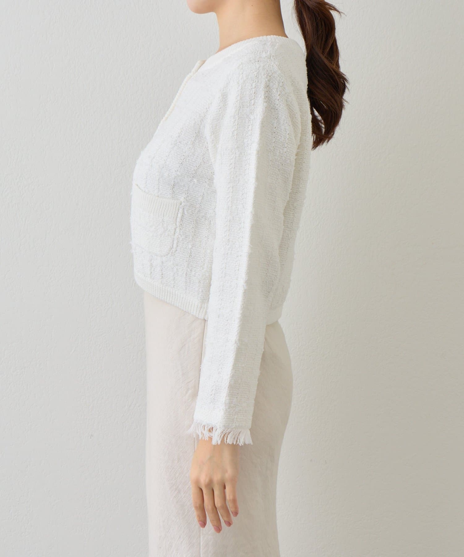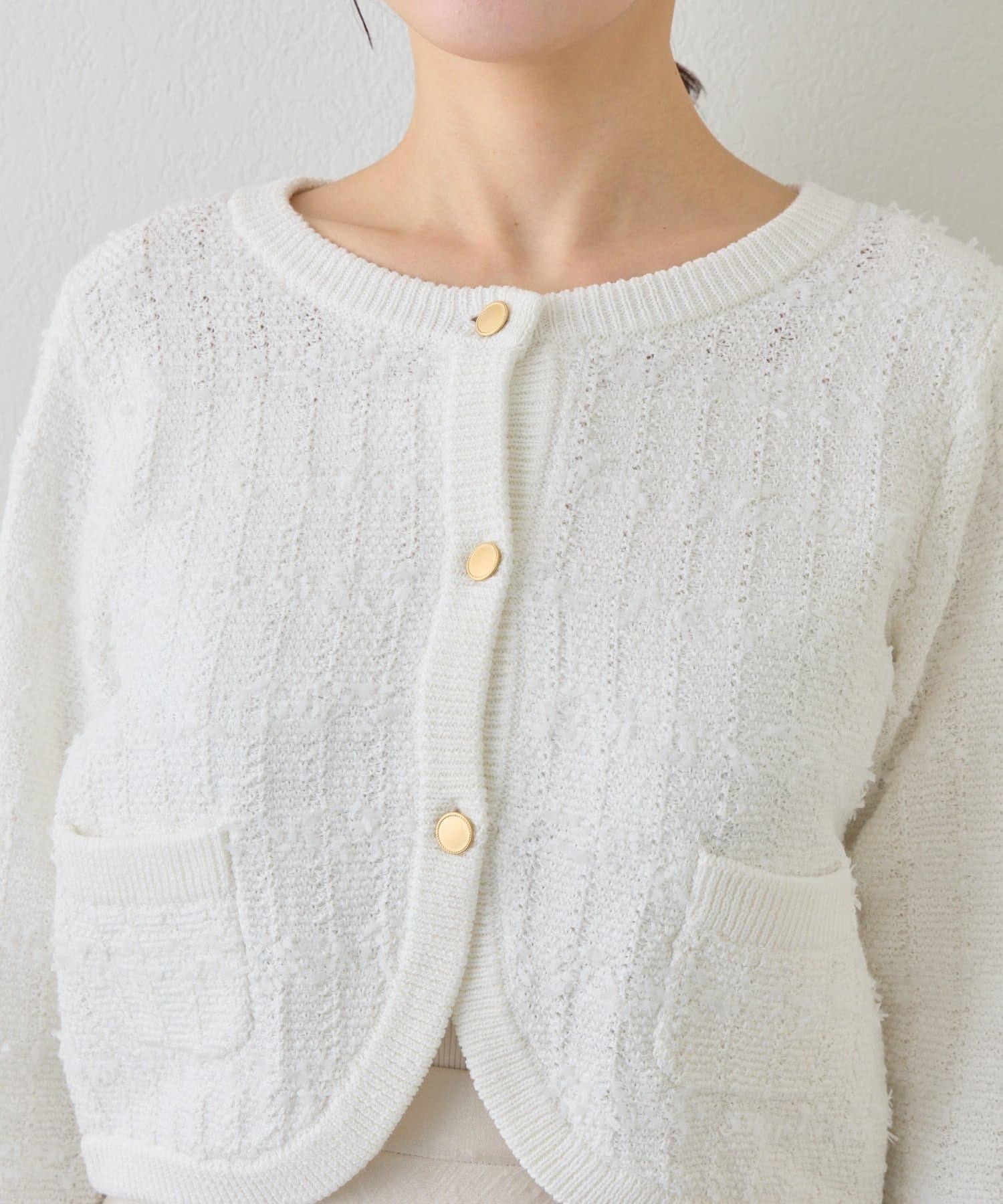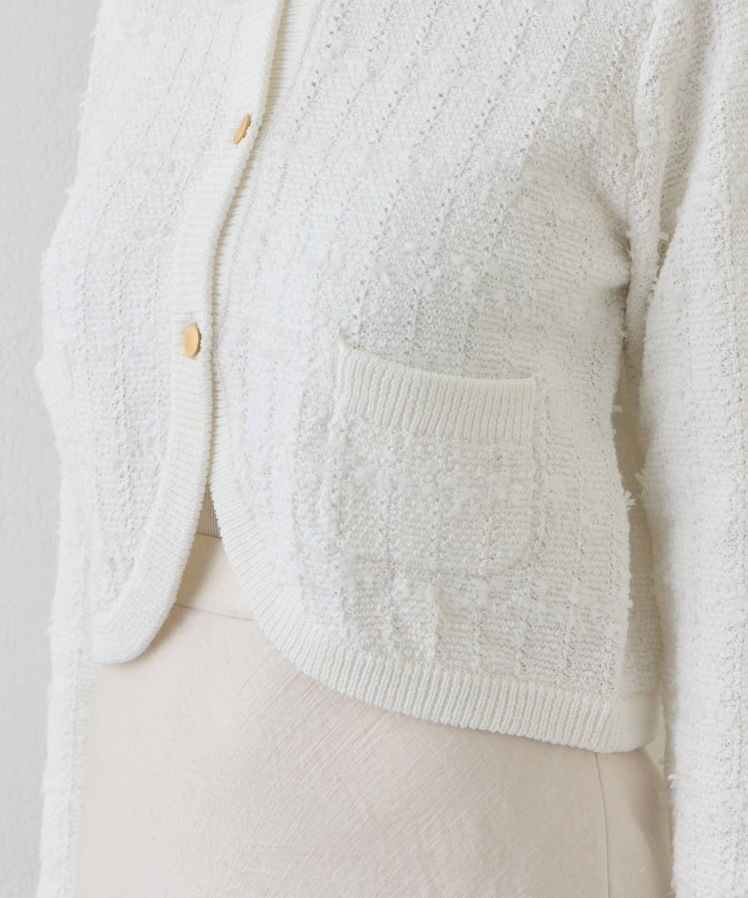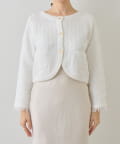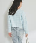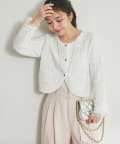 ツイード調の編地が上品な印象を与える、ニットボレロカーディガン。