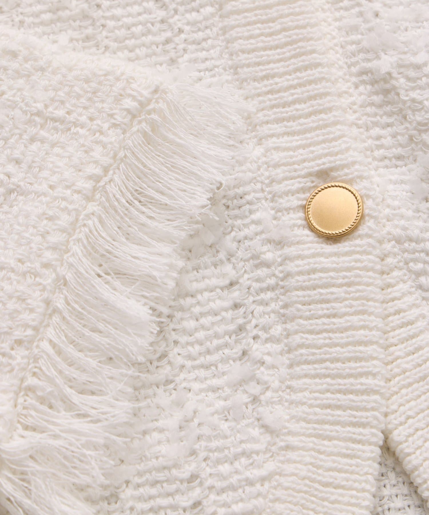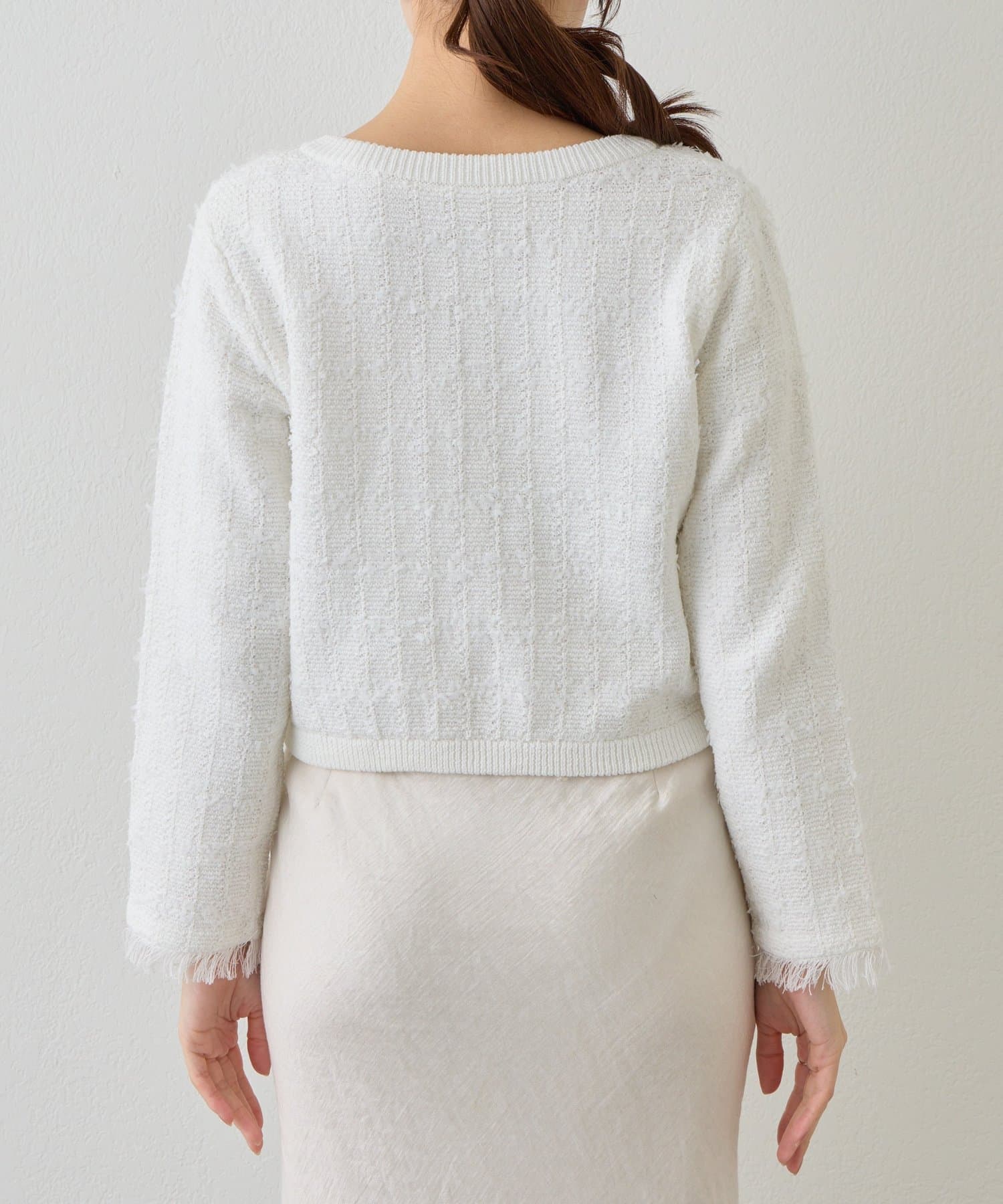 裾や袖口のフリンジディテールが、フェミニンなアクセントに。