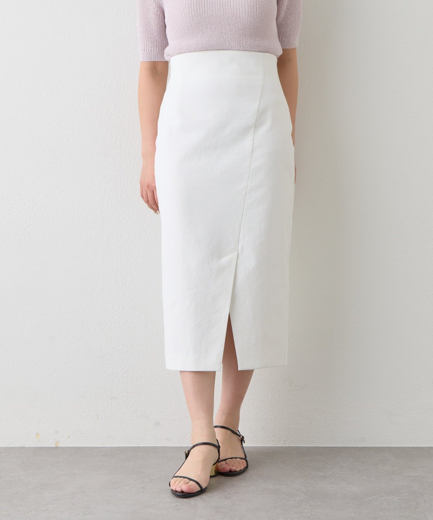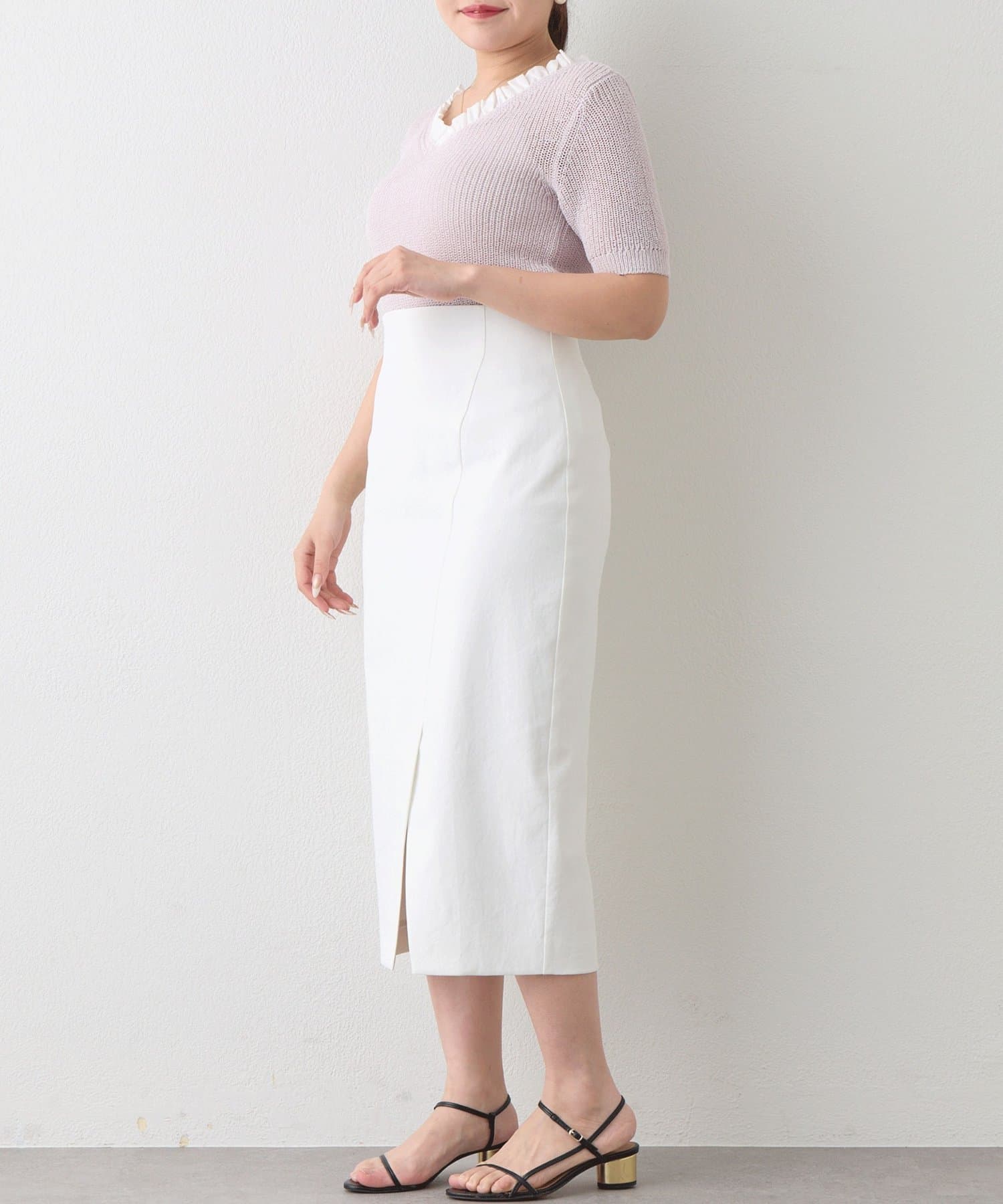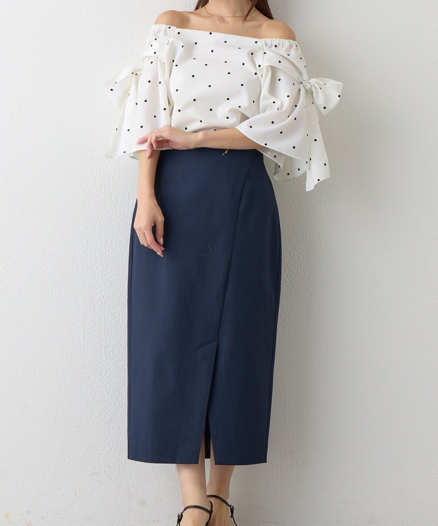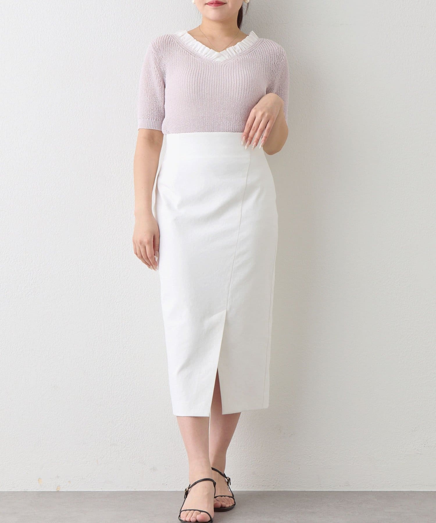 コンパクトなニットやブラウスを合わせれば、きちんと感のあるオフィススタイルに。