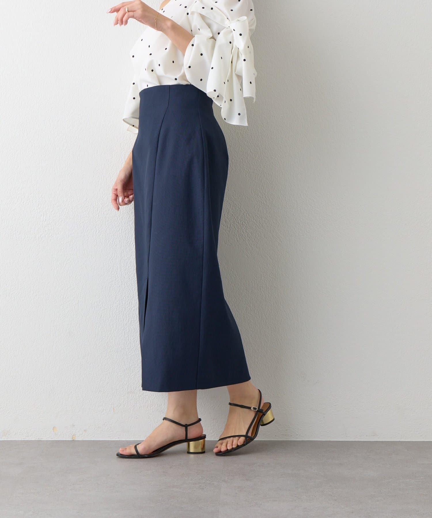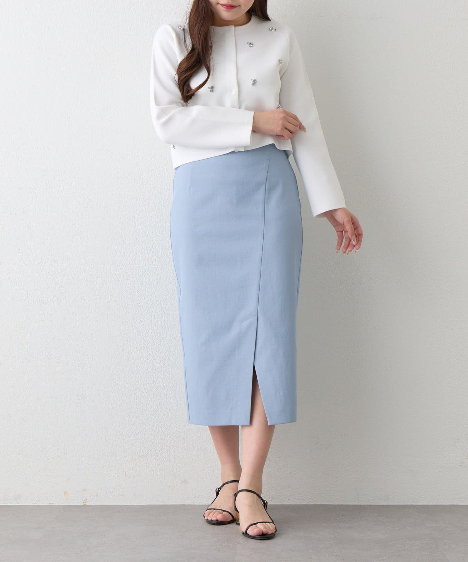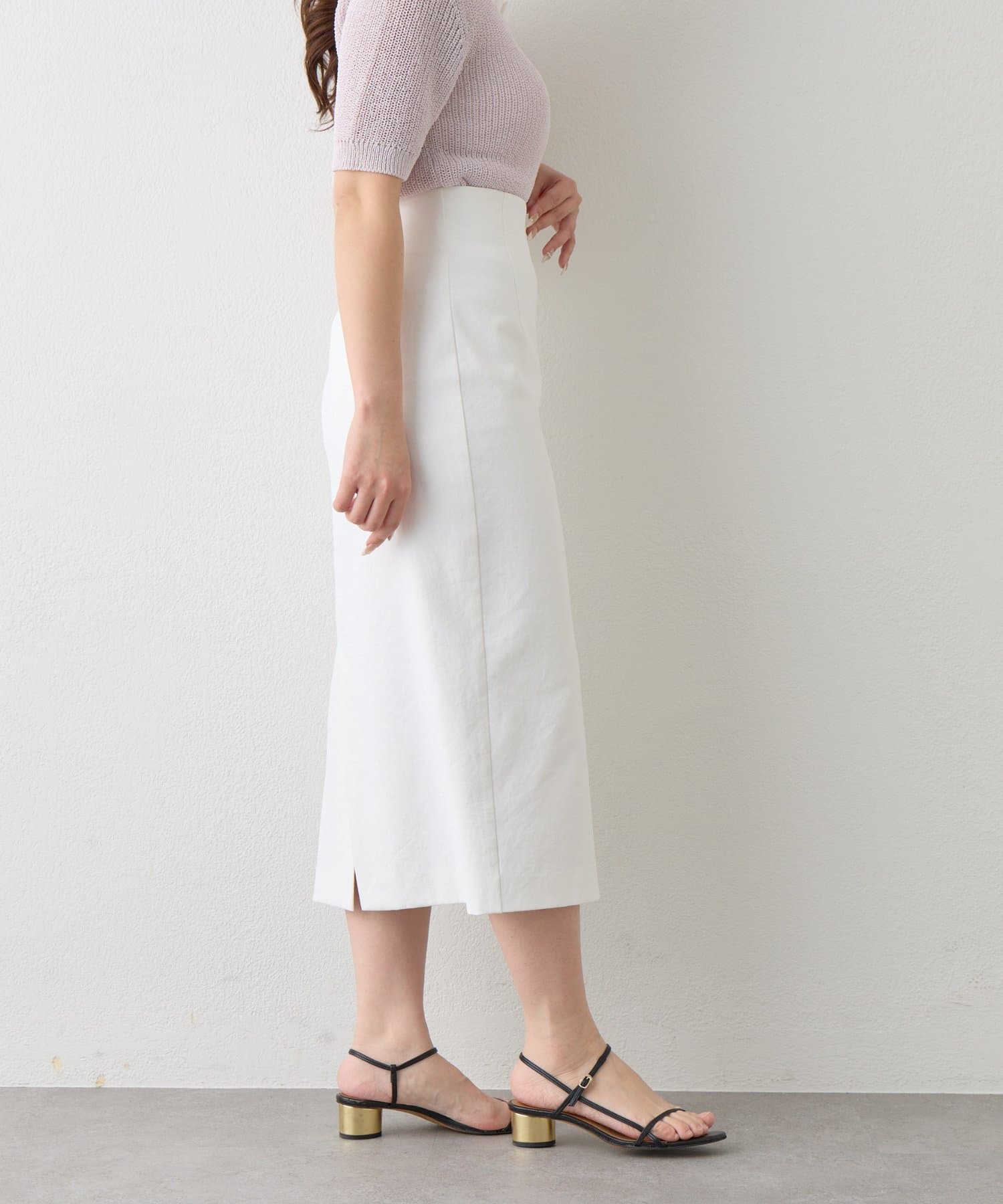 コンパクトなニットやブラウスを合わせれば、きちんと感のあるオフィススタイルに。