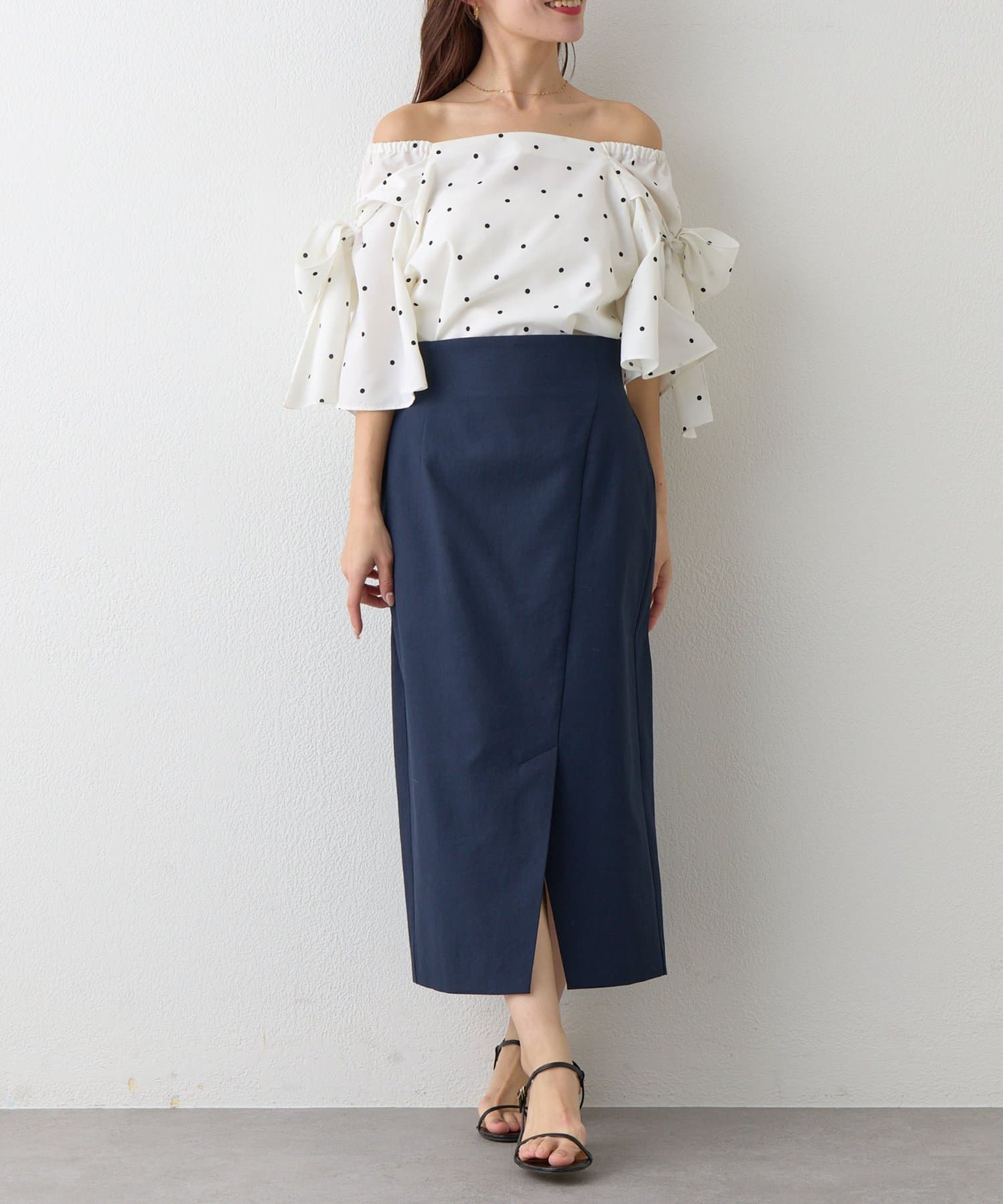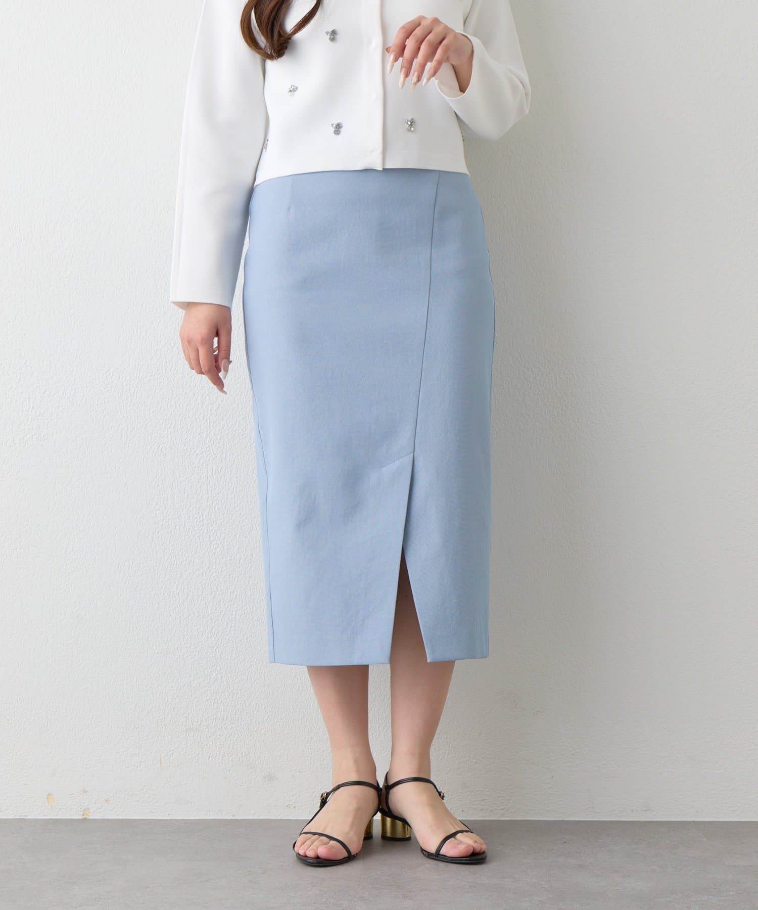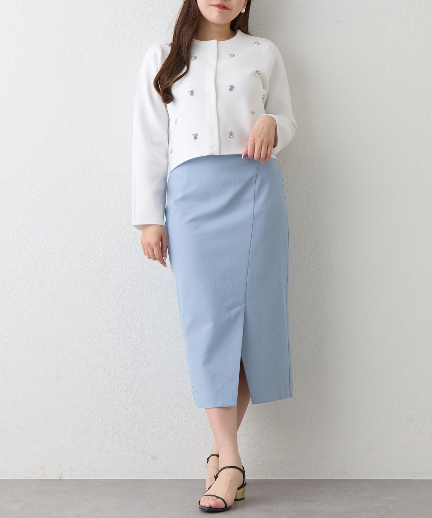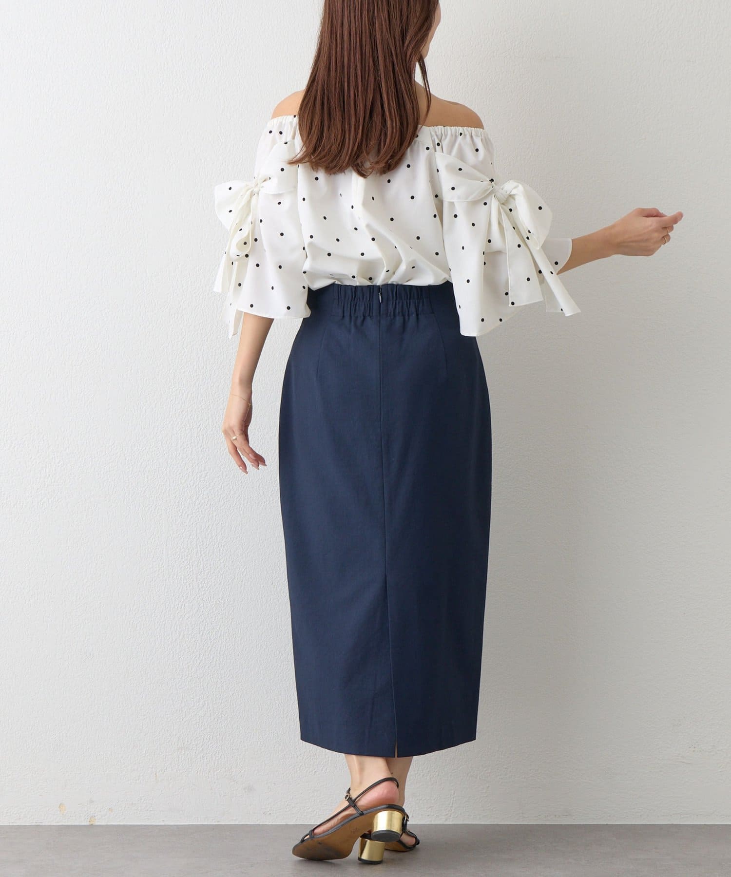 コンパクトなニットやブラウスを合わせれば、きちんと感のあるオフィススタイルに。