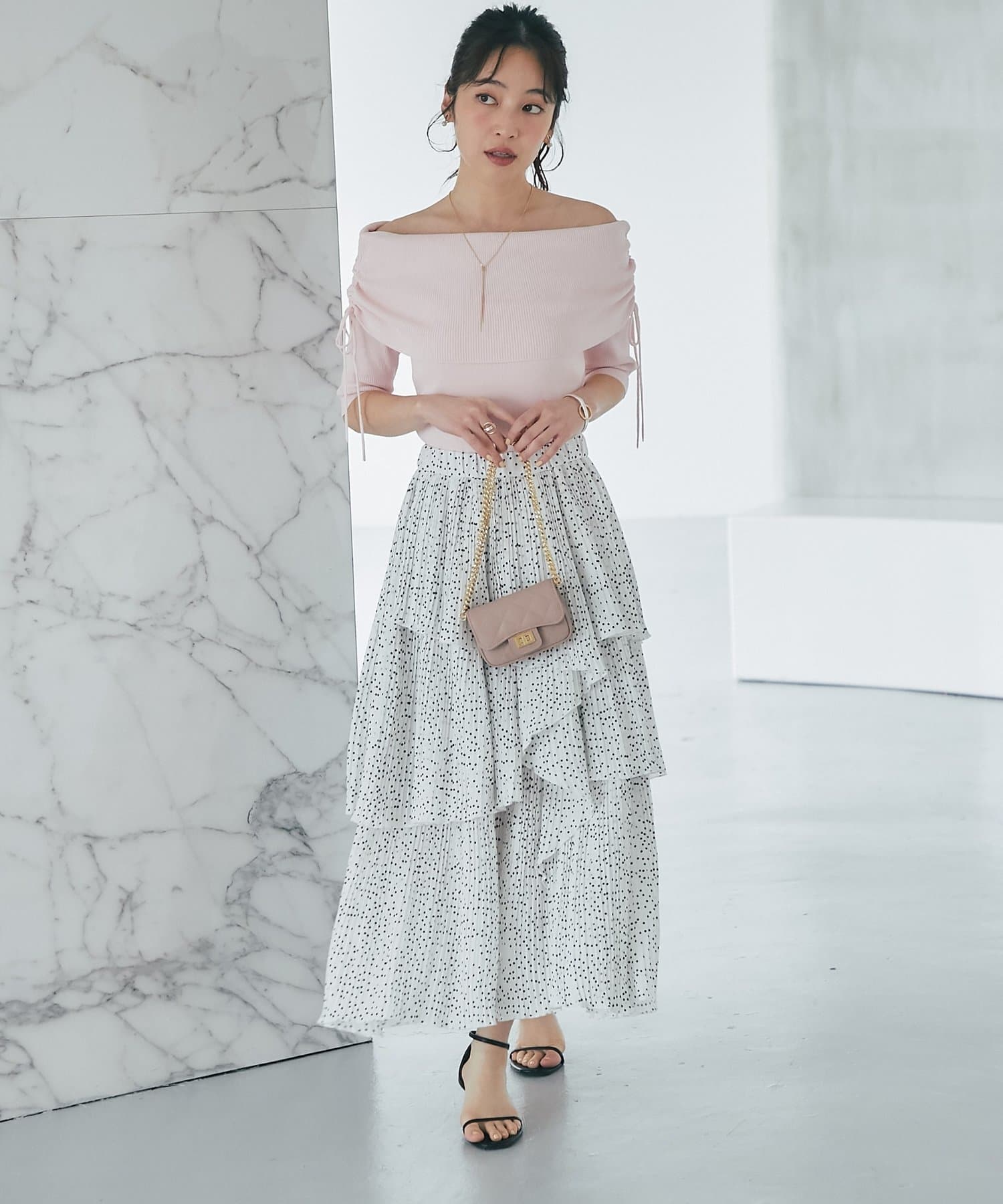 重なり合うようなデザインが立体感を生み、歩くたびにふんわりと揺れる表情が魅力です。