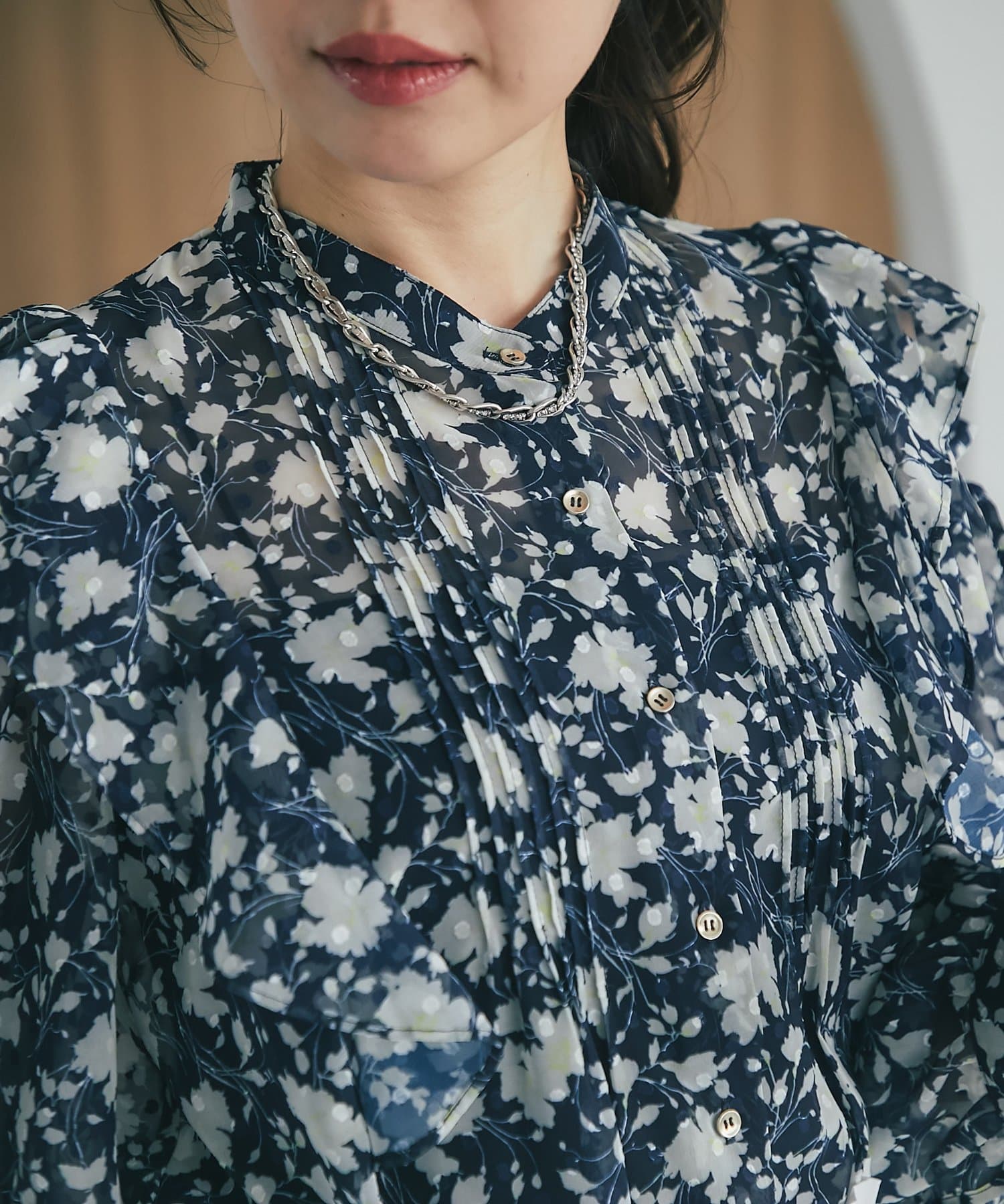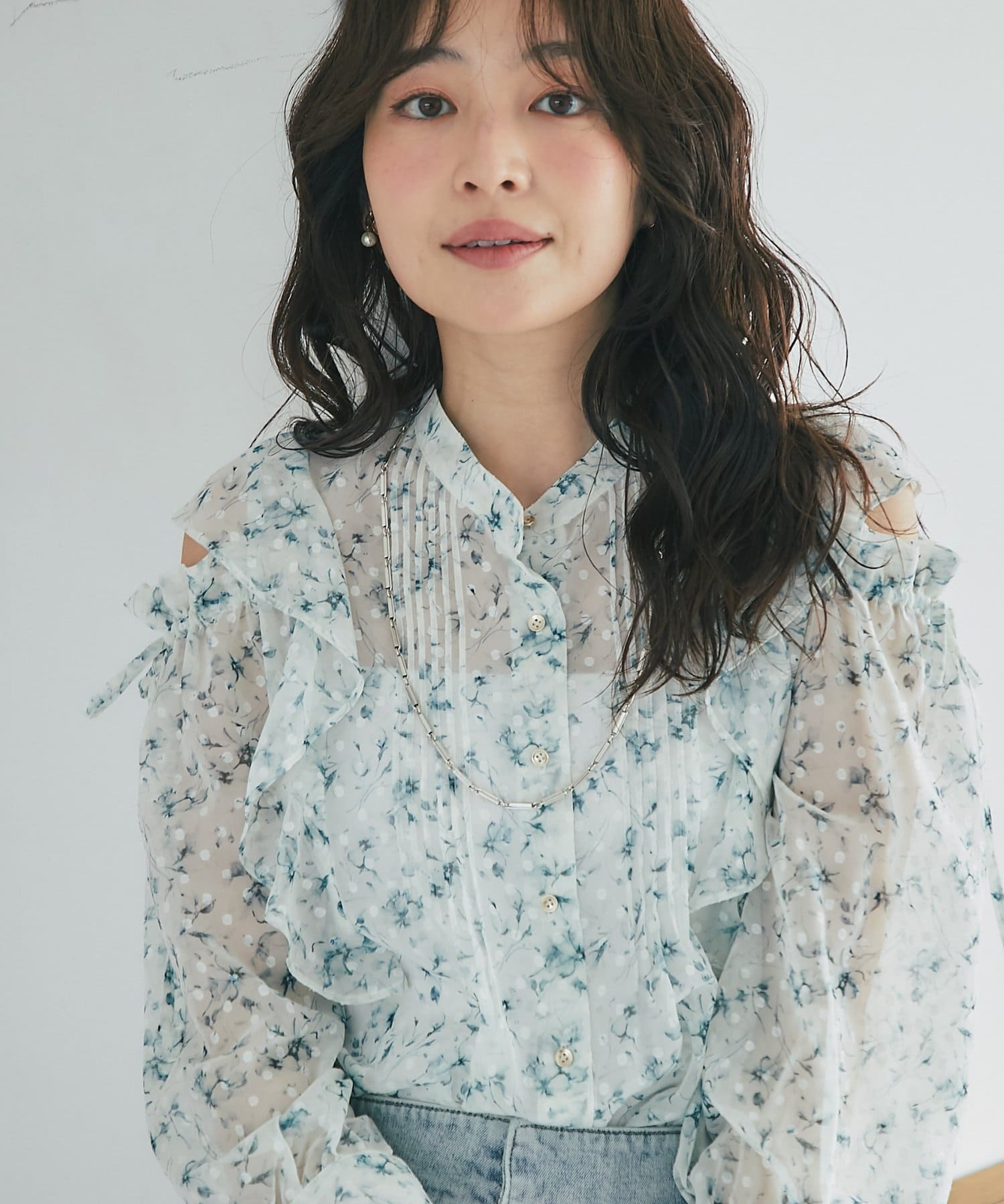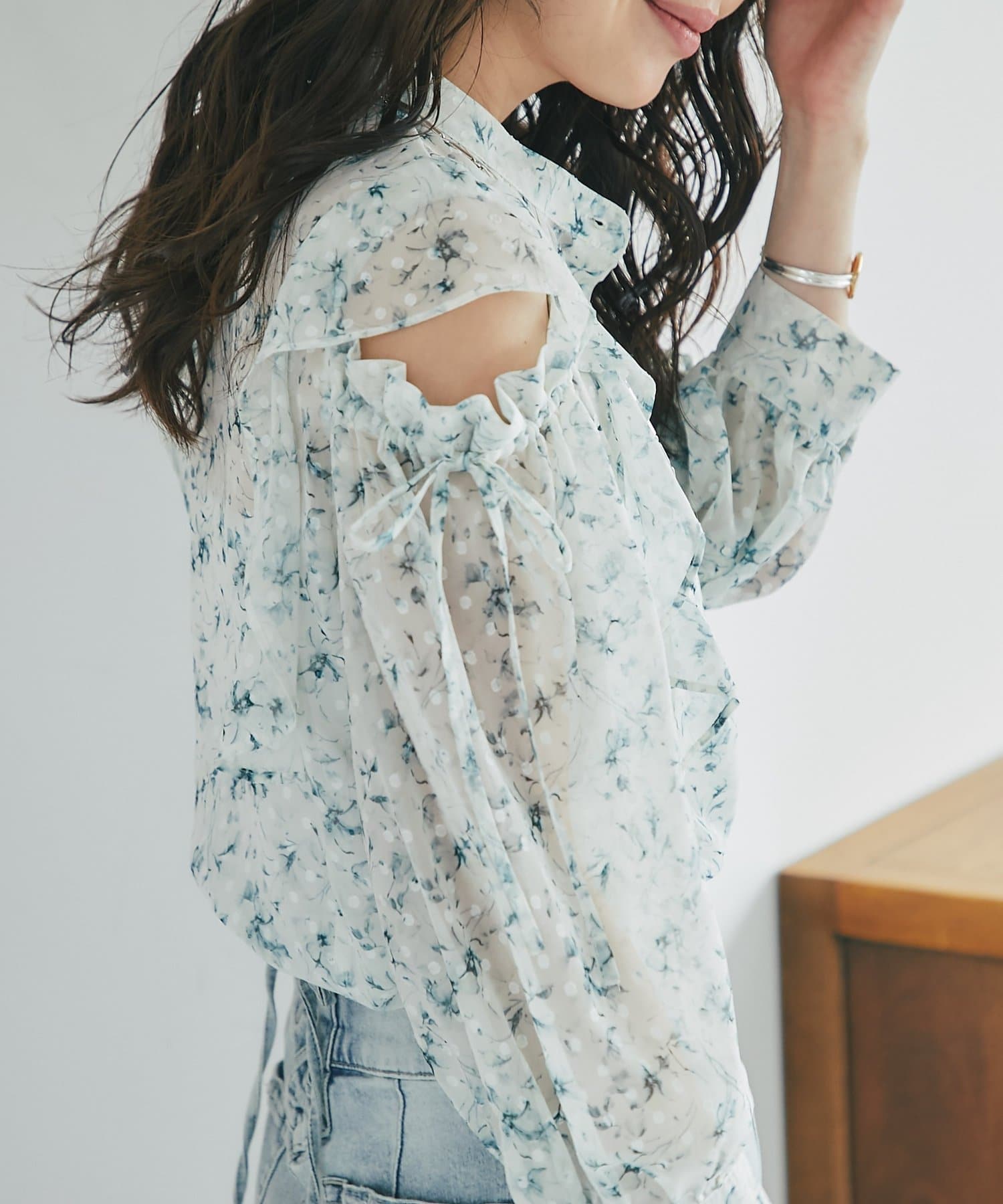 シアーのドット生地に繊細な花柄がプリントされており着映えする一枚。