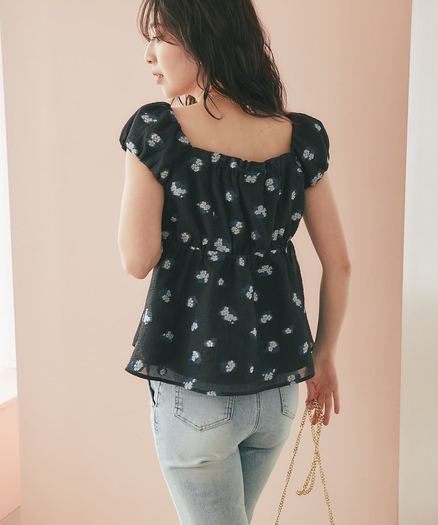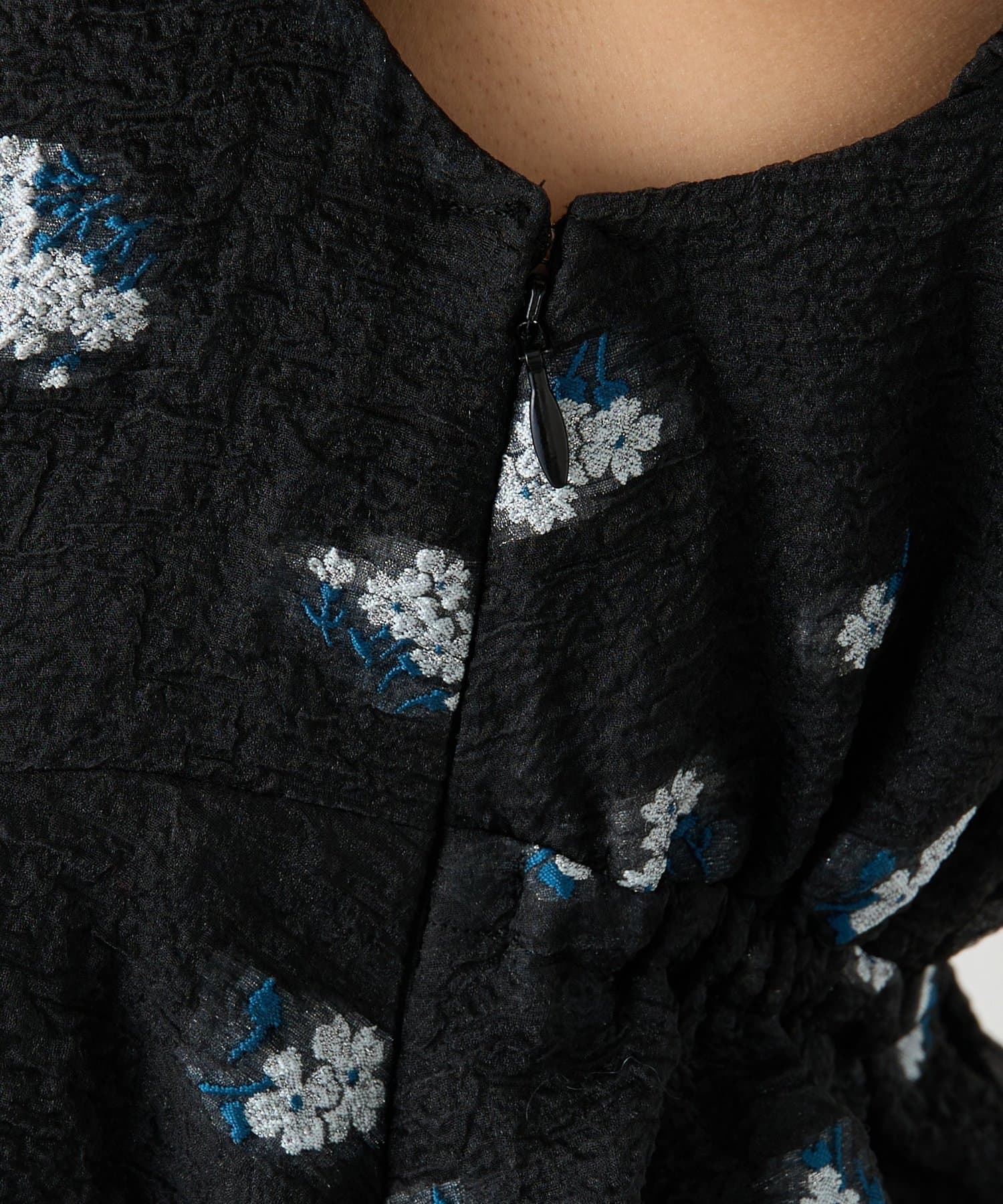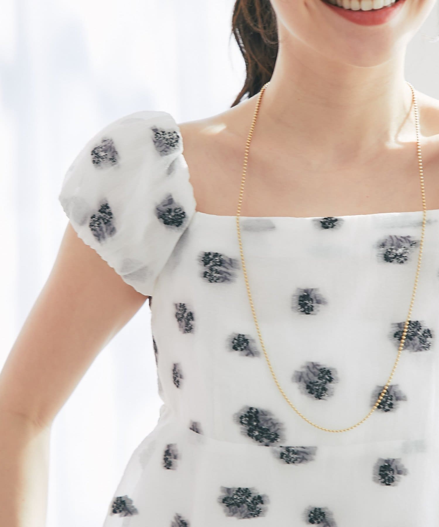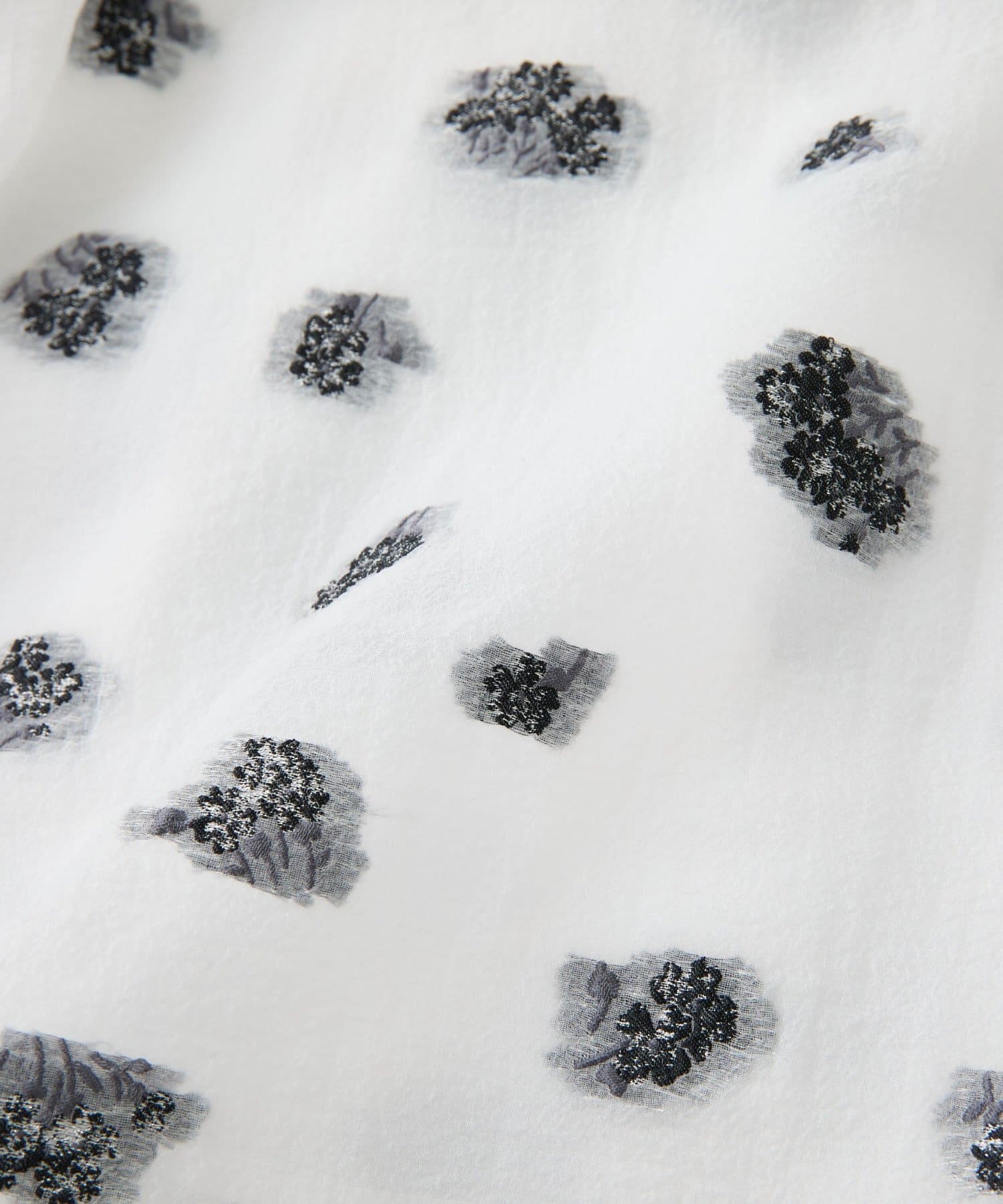 裏付きの仕様なので、透け感も気になりにくいのが嬉しい。 シアーでふくらみのある生地にジャガードの小花が際立つ、繊細でかわいらしい生地を使用。