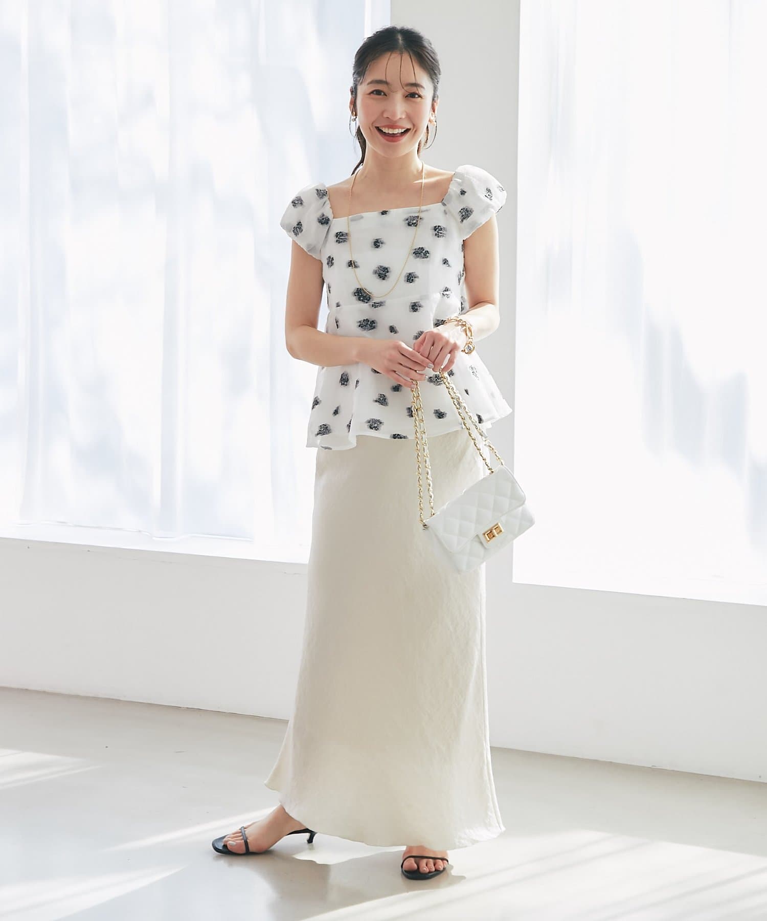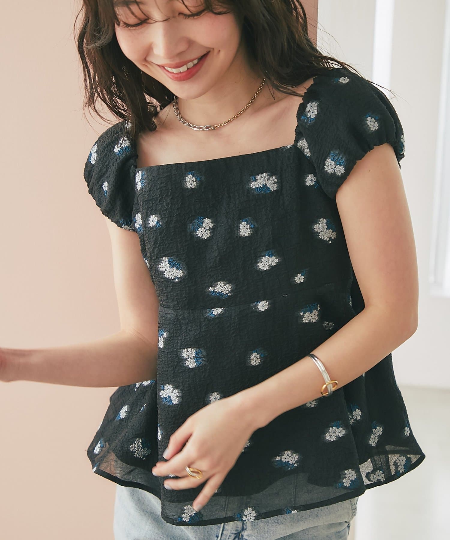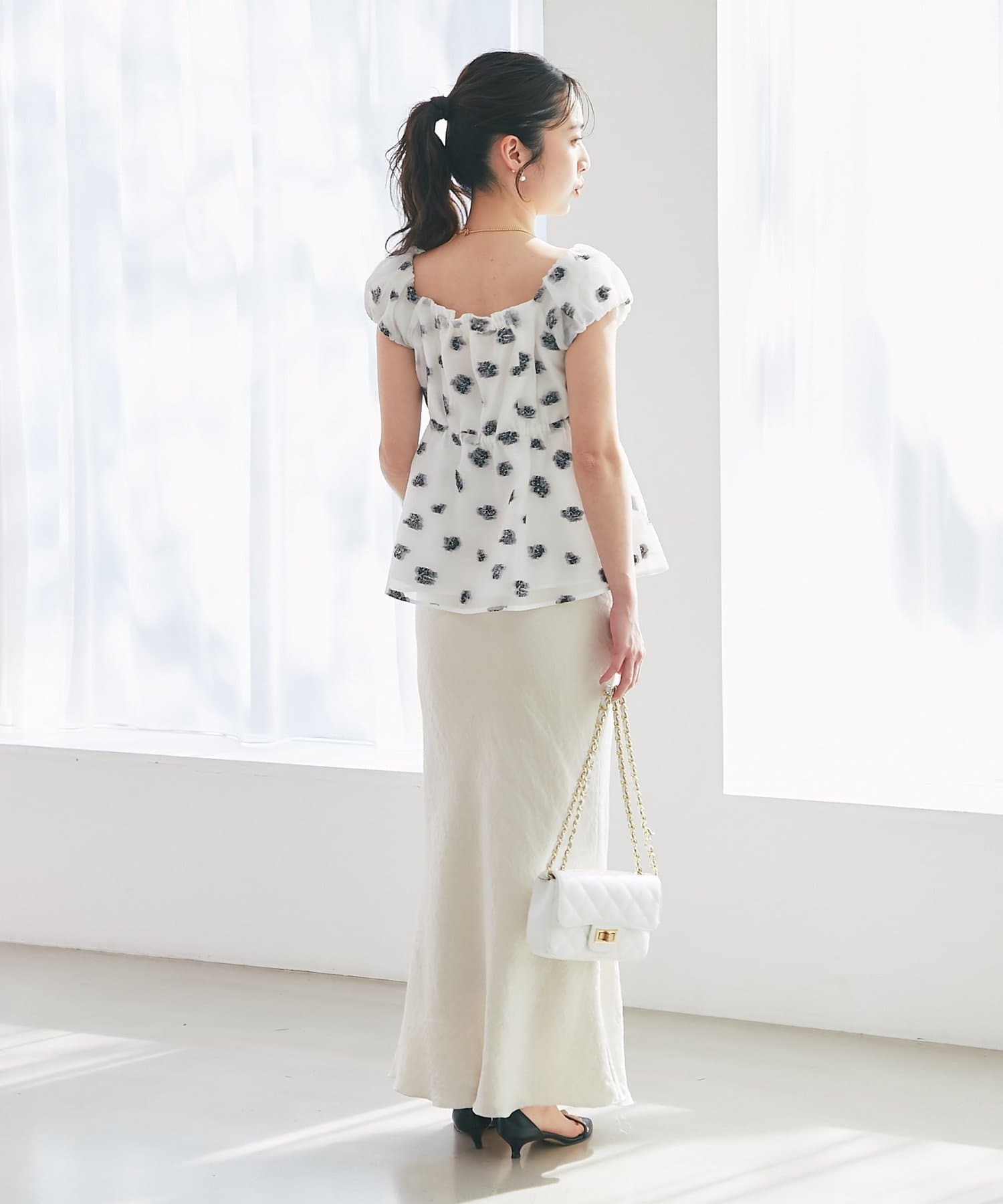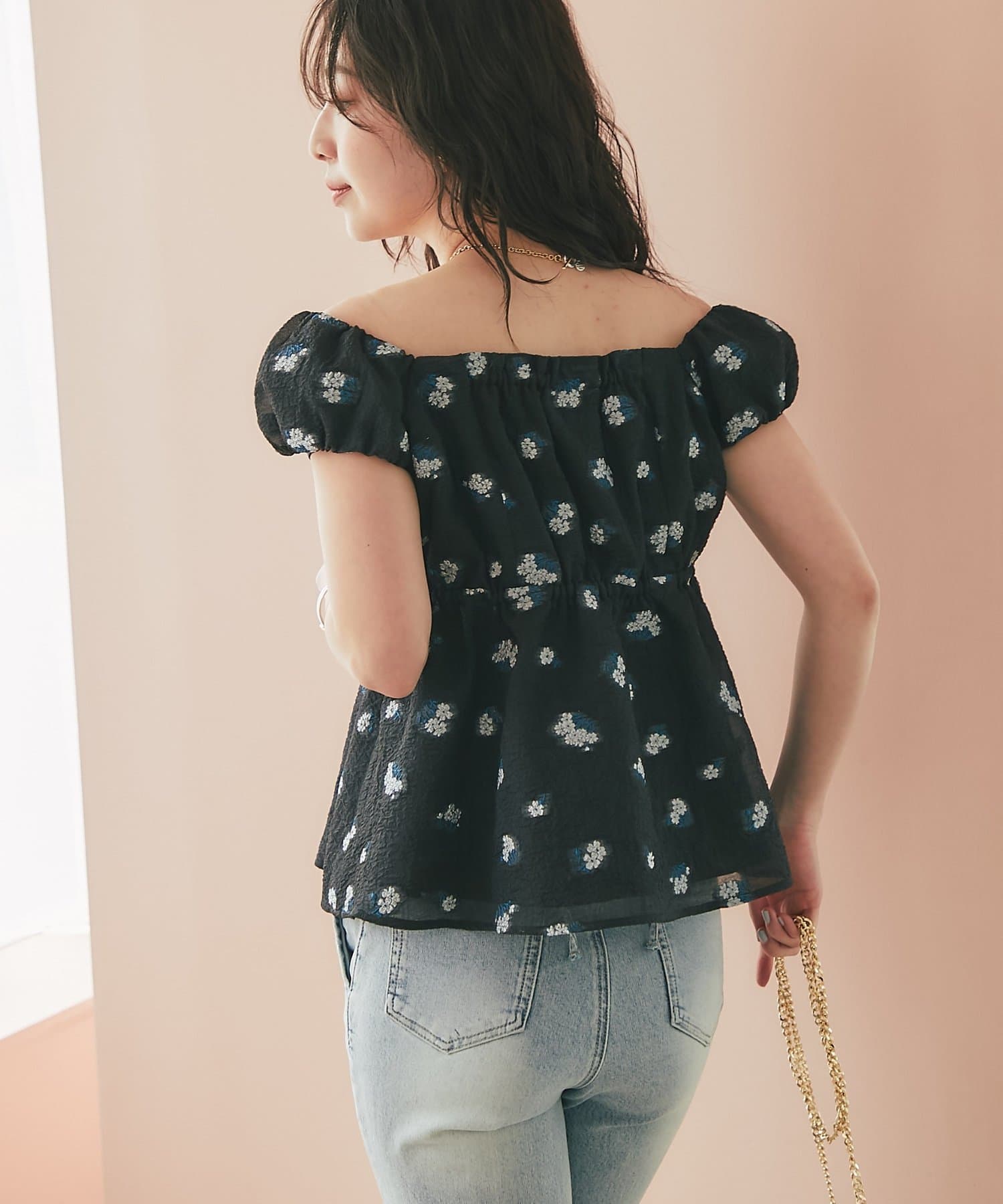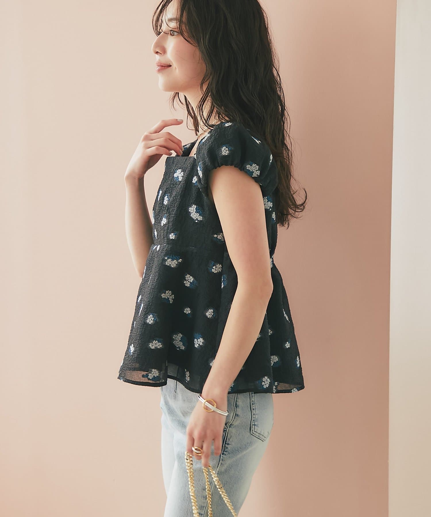 裏付きの仕様なので、透け感も気になりにくいのが嬉しい。 シアーでふくらみのある生地にジャガードの小花が際立つ、繊細でかわいらしい生地を使用。