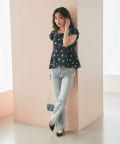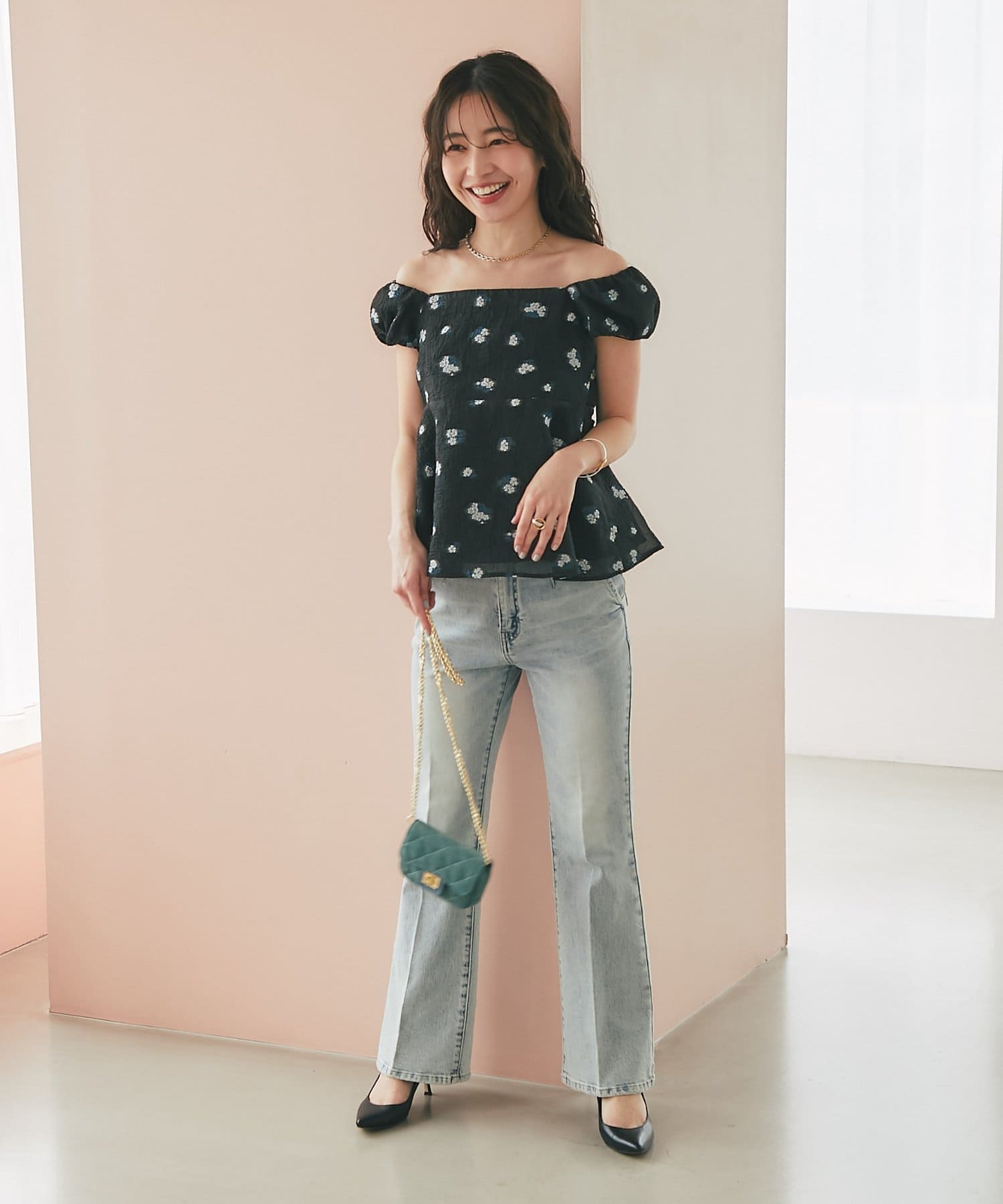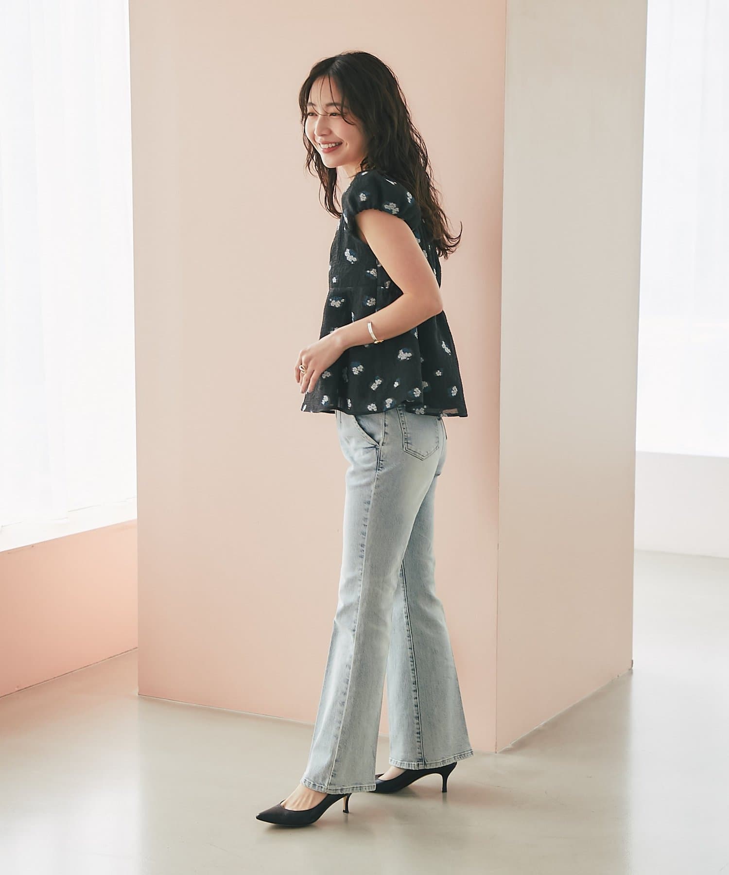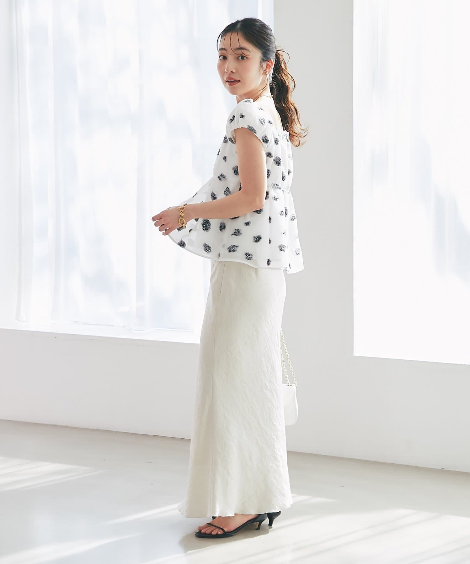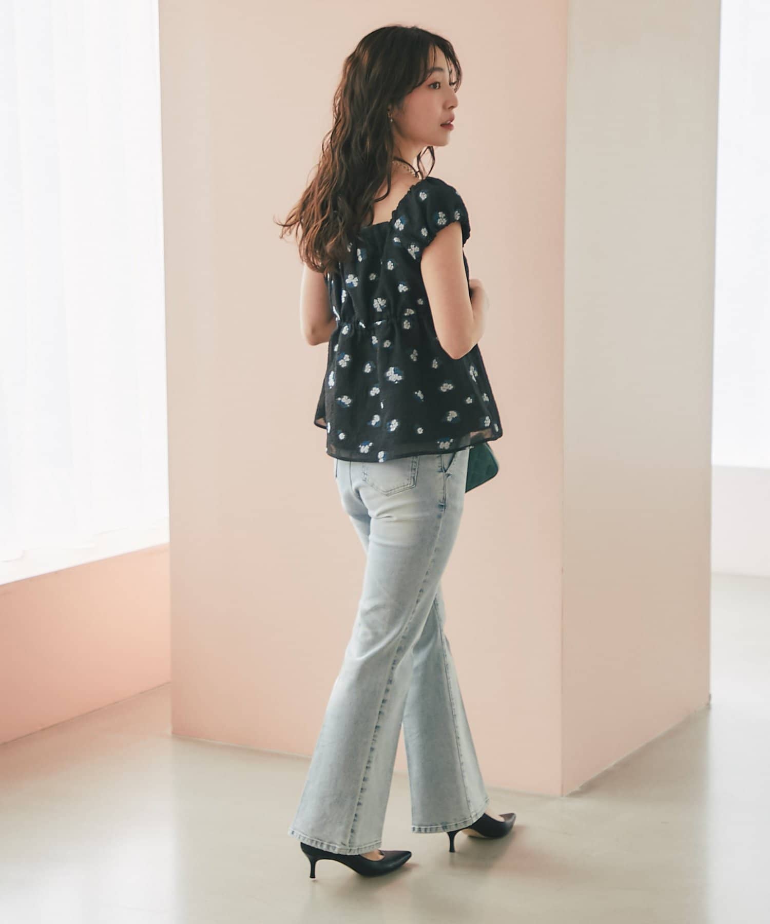 裏付きの仕様なので、透け感も気になりにくいのが嬉しい。 シアーでふくらみのある生地にジャガードの小花が際立つ、繊細でかわいらしい生地を使用。