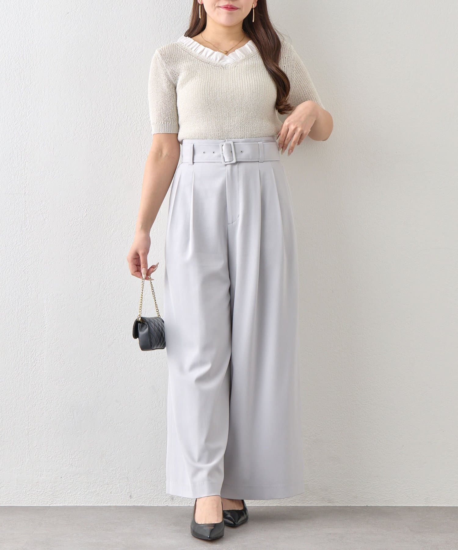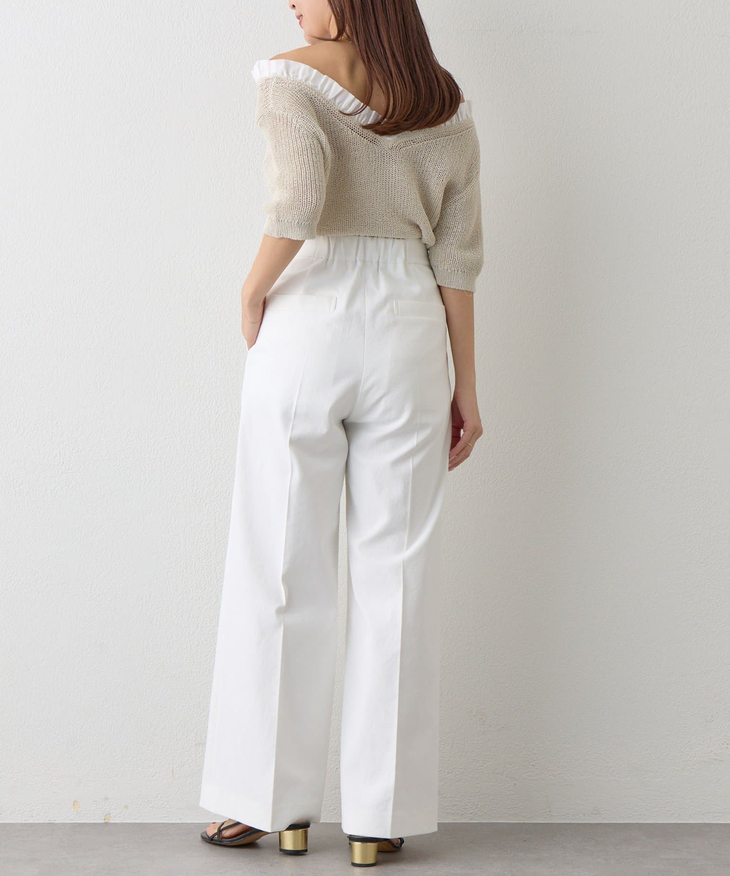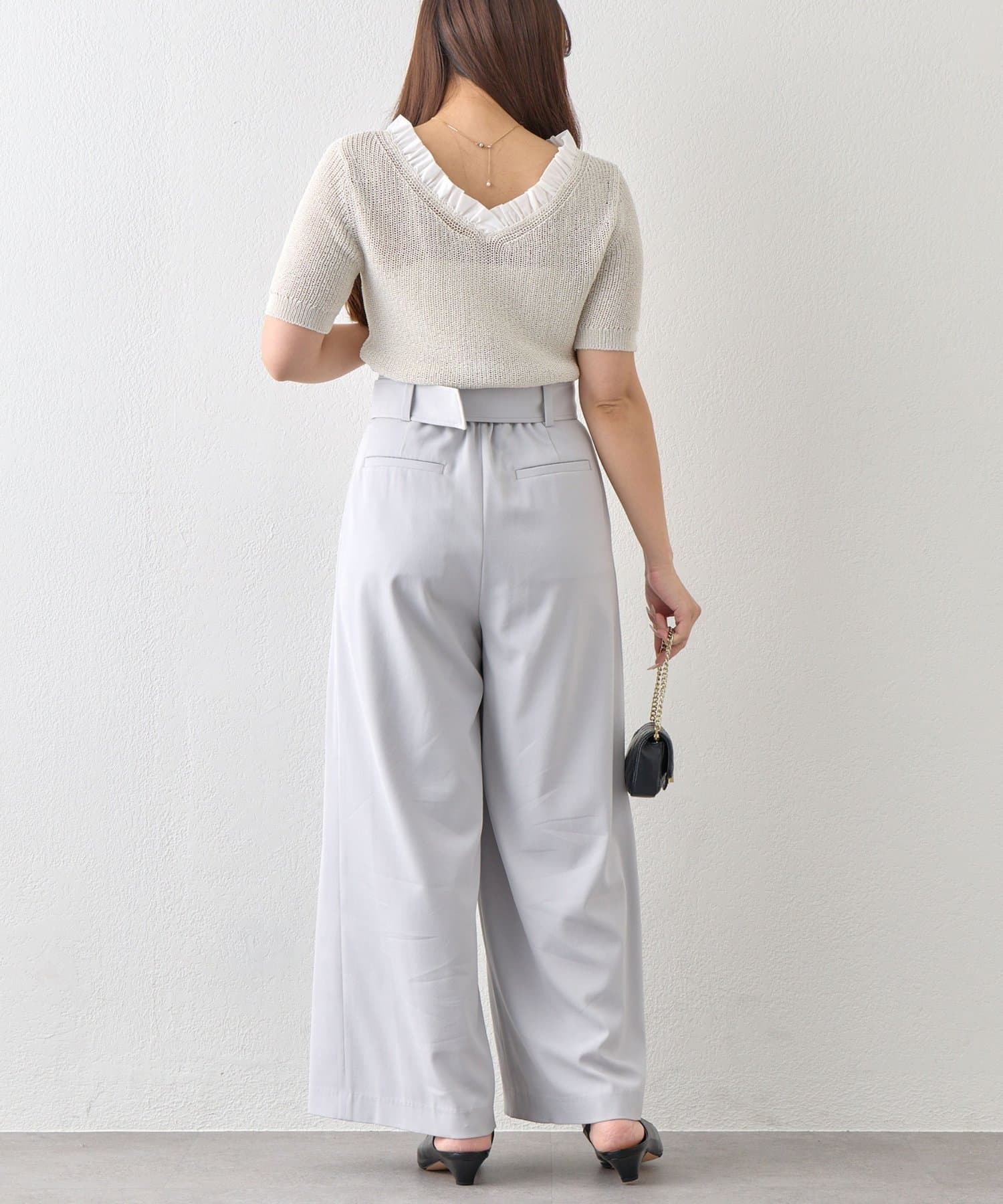 デコルテをすっきりと見せるVネックに、さりげないフリルディテールをプラス。