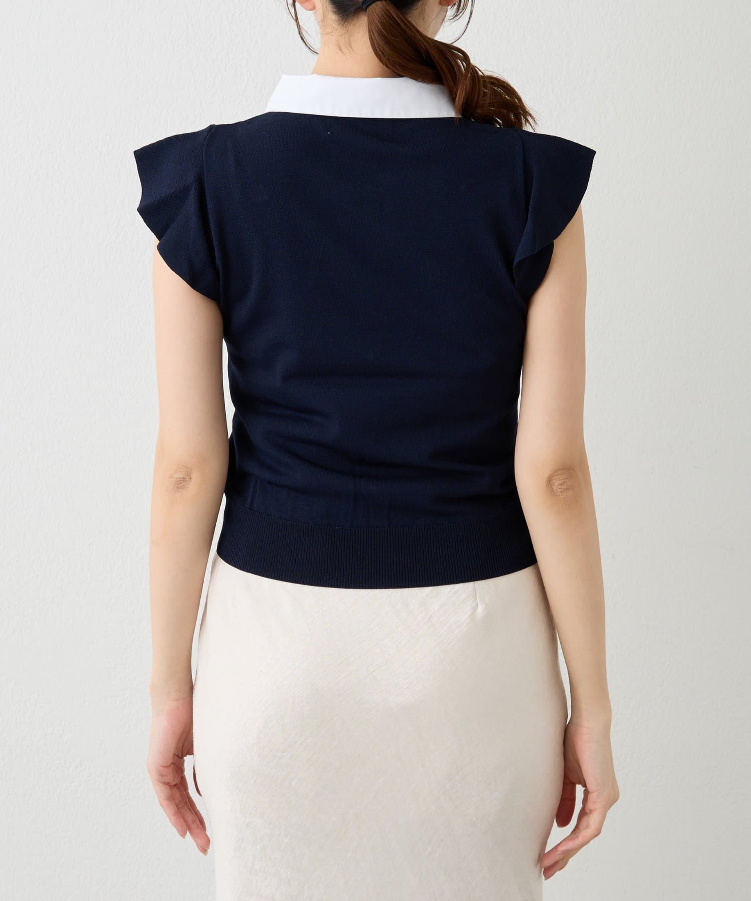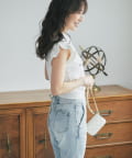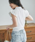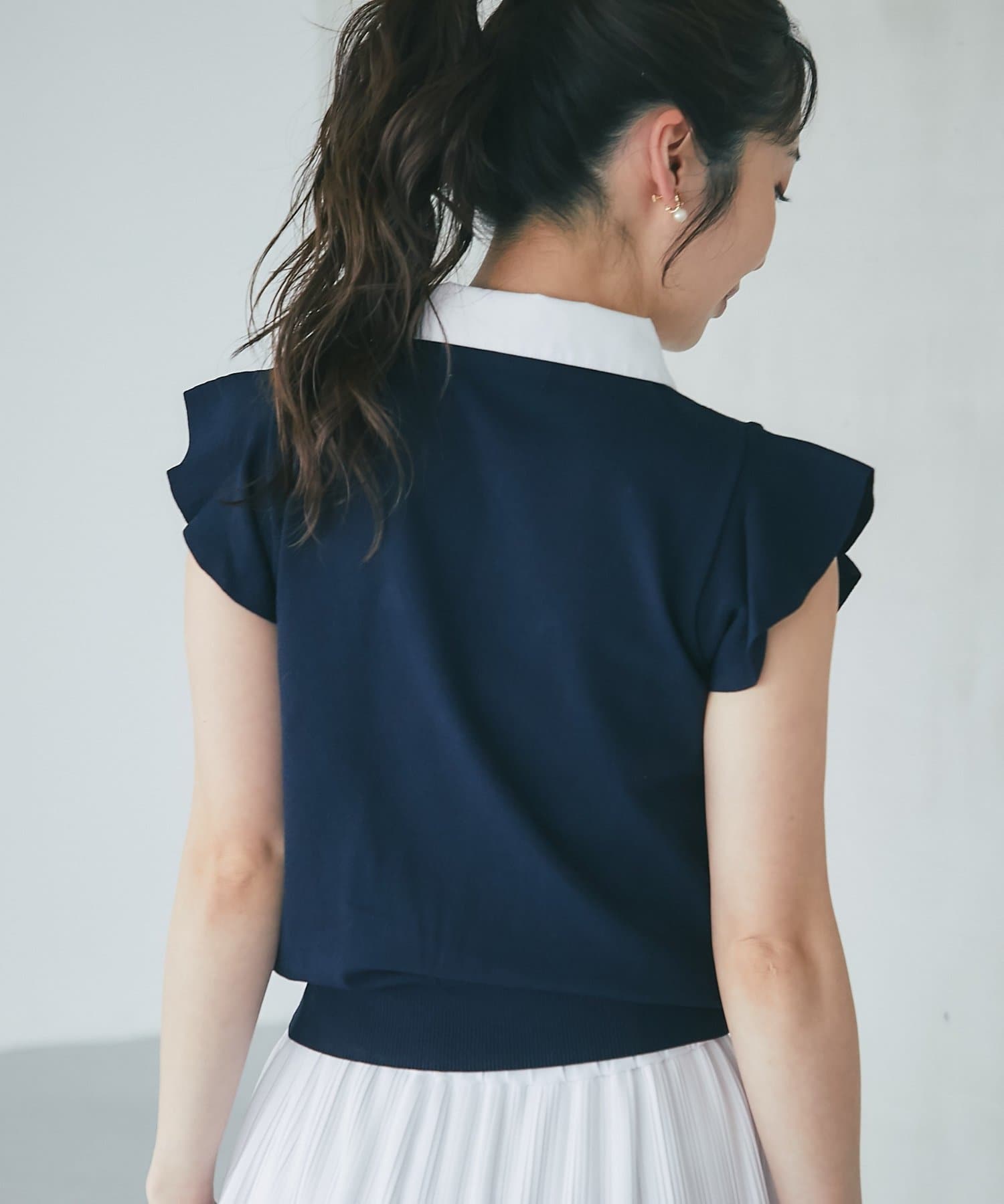 肩まわりのラッフルディテールが可愛く二の腕カバーにも。