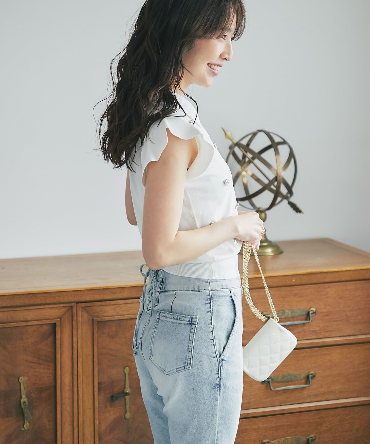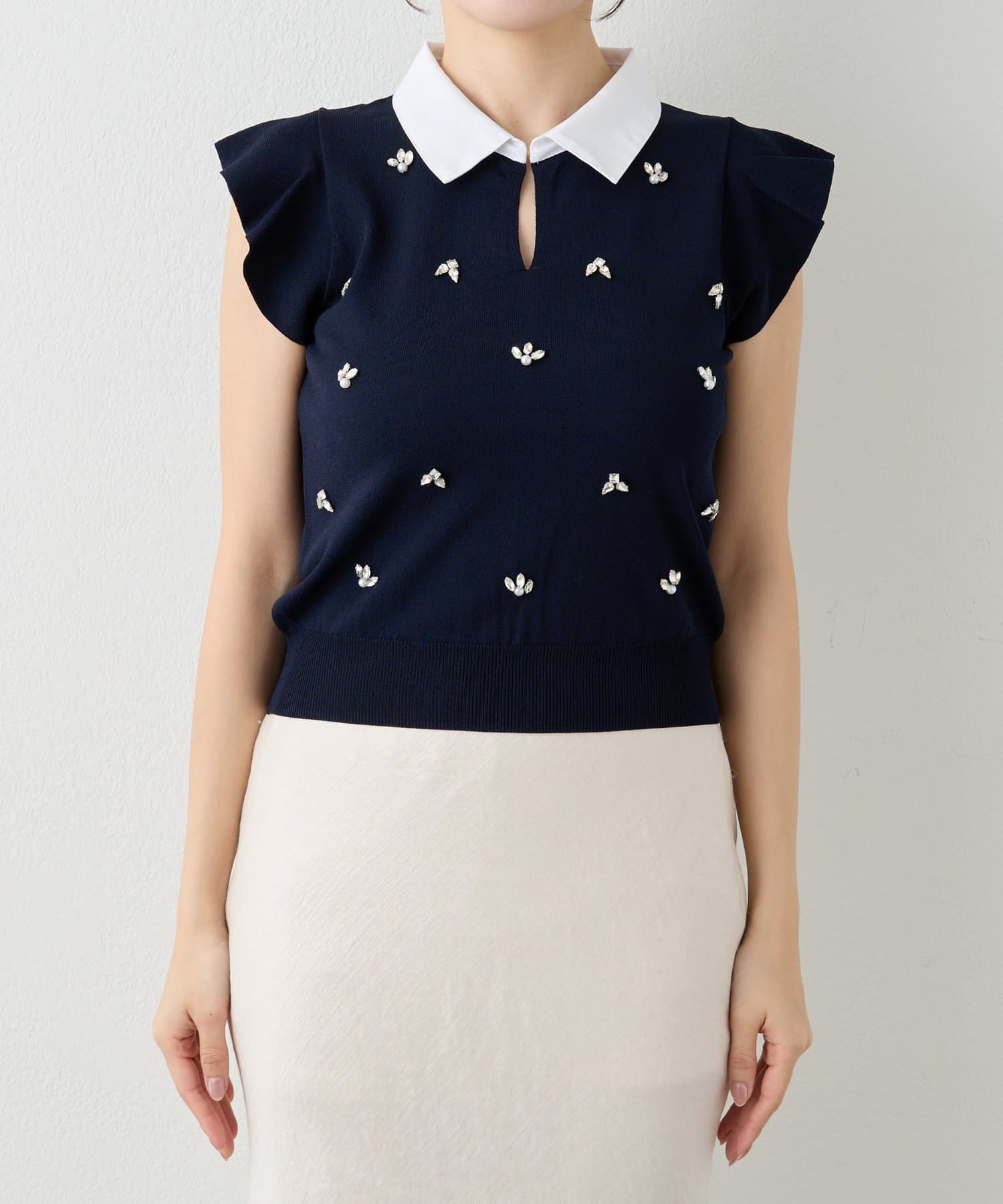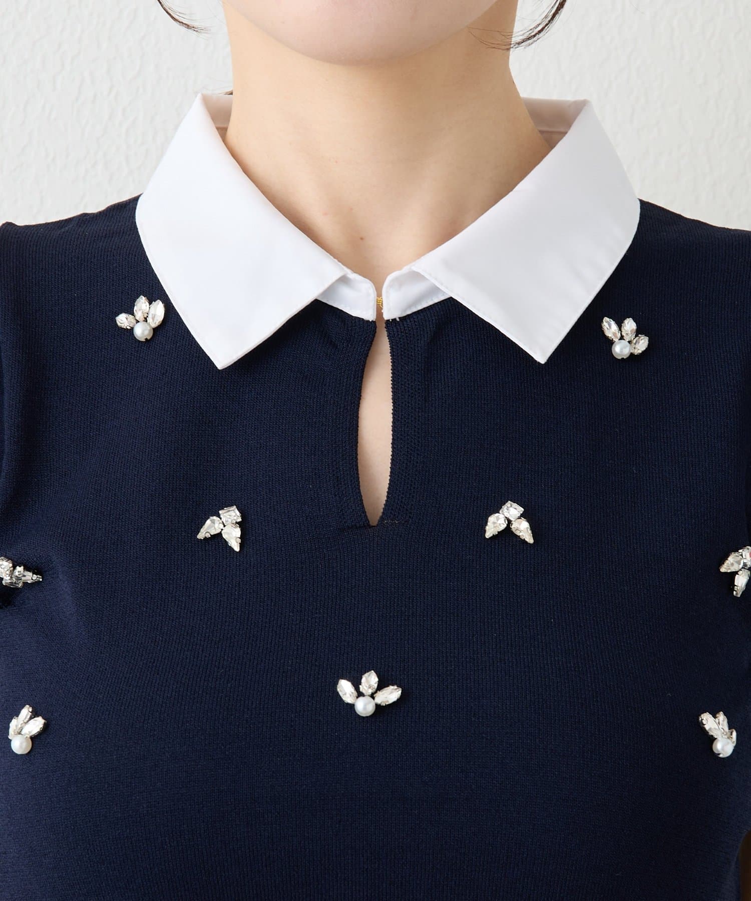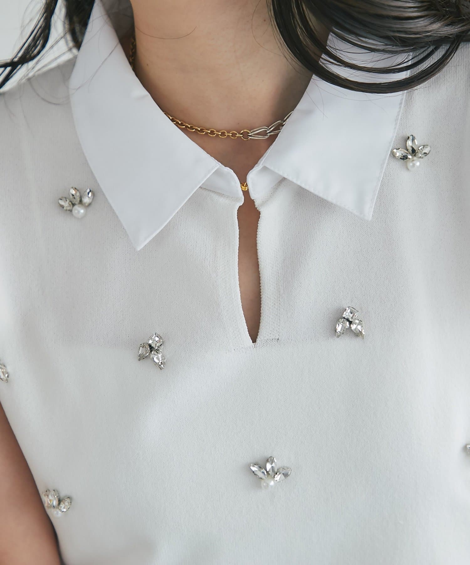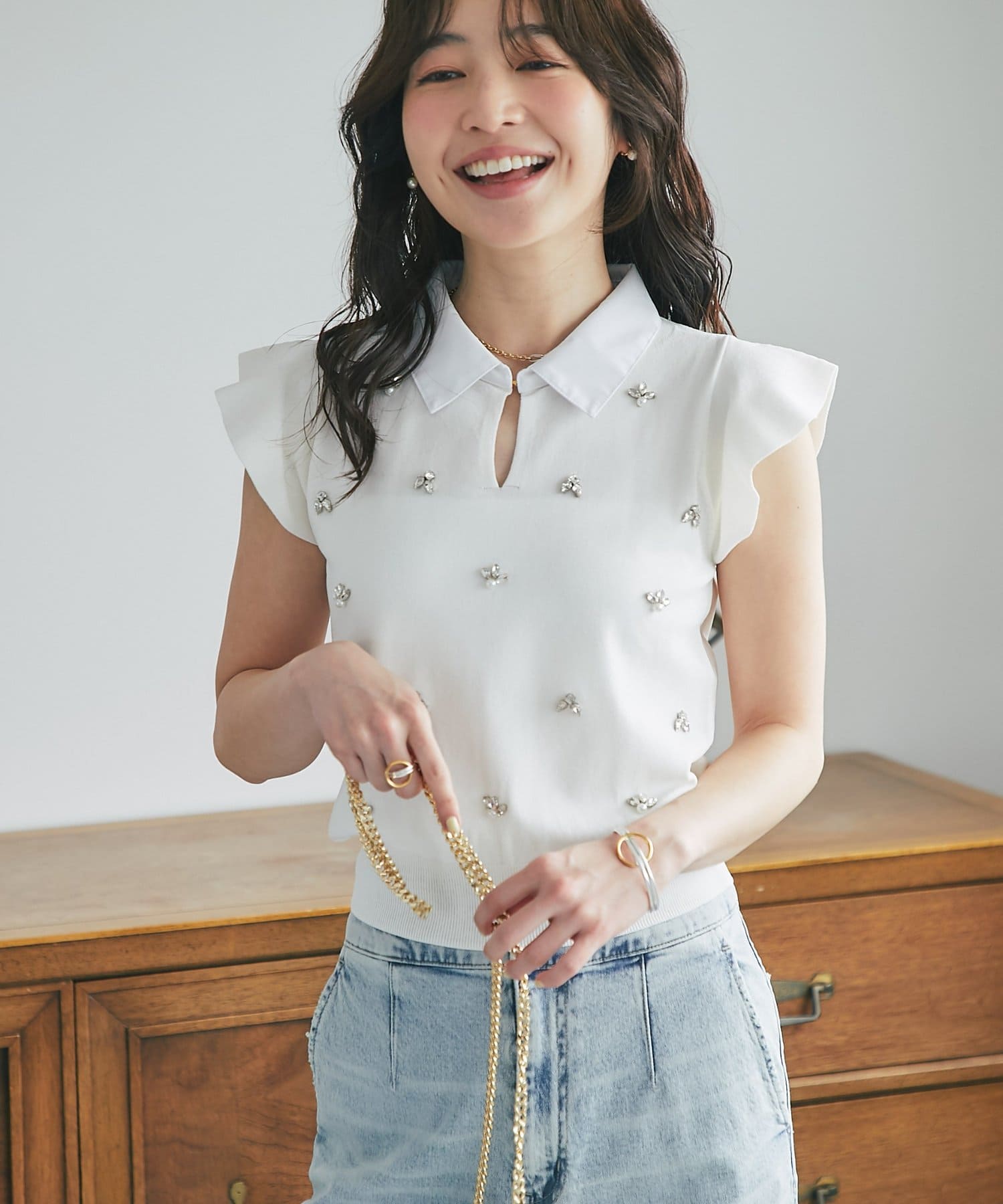 接触冷感×ビジューで叶える。大人の上品フェミニンニット