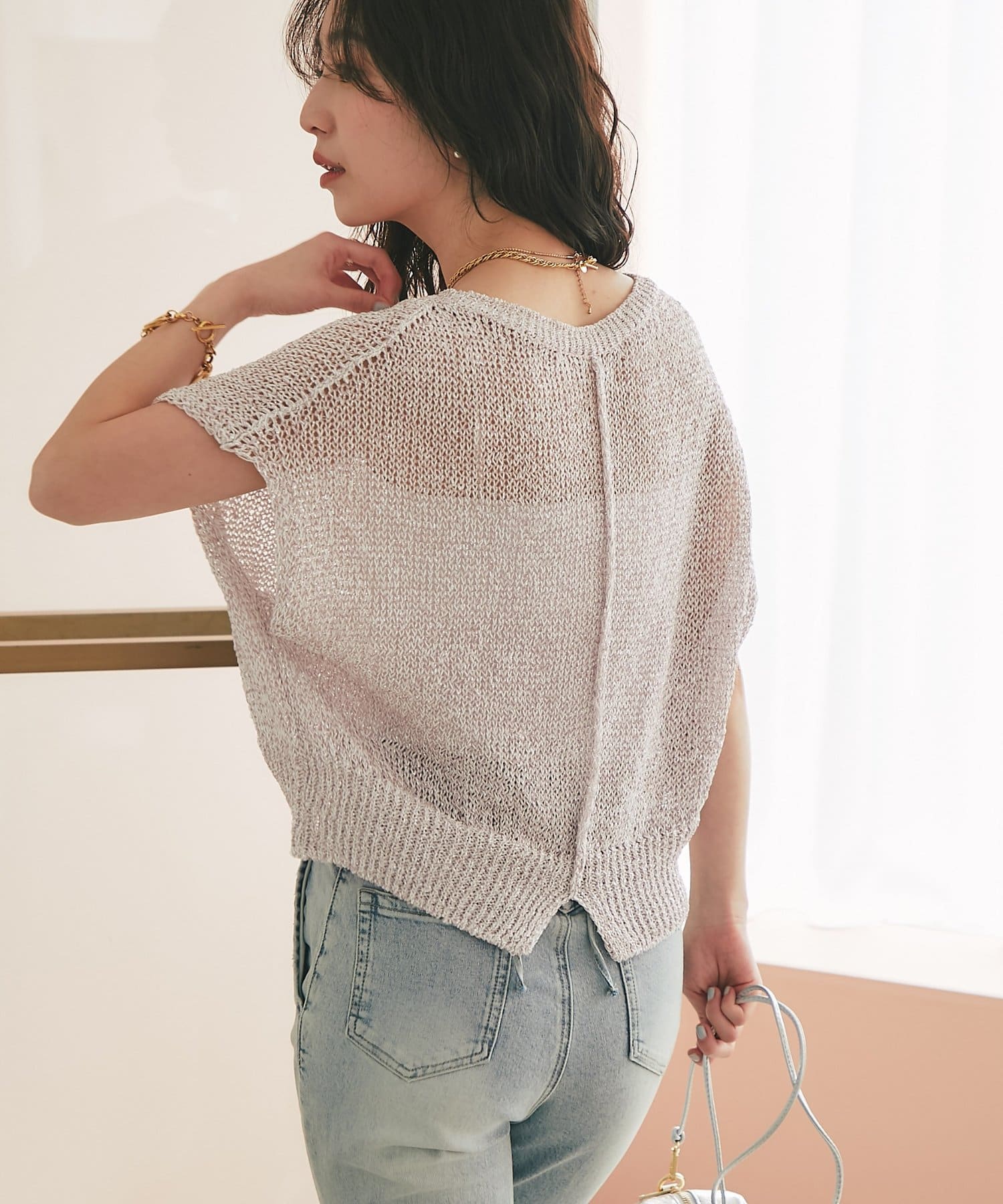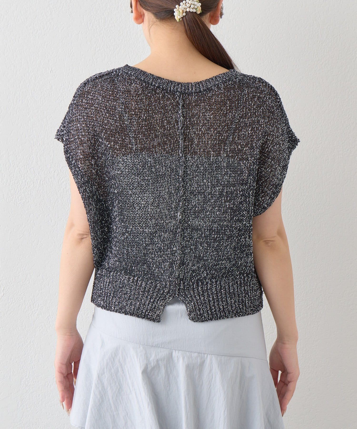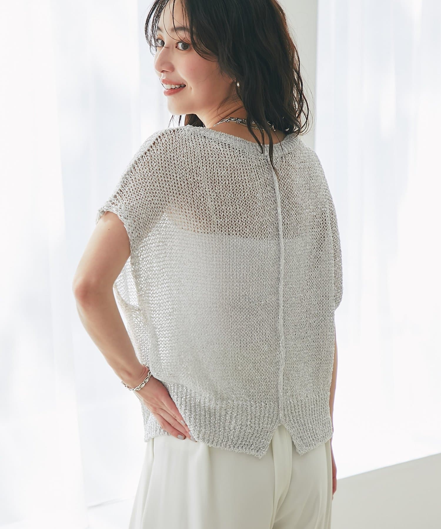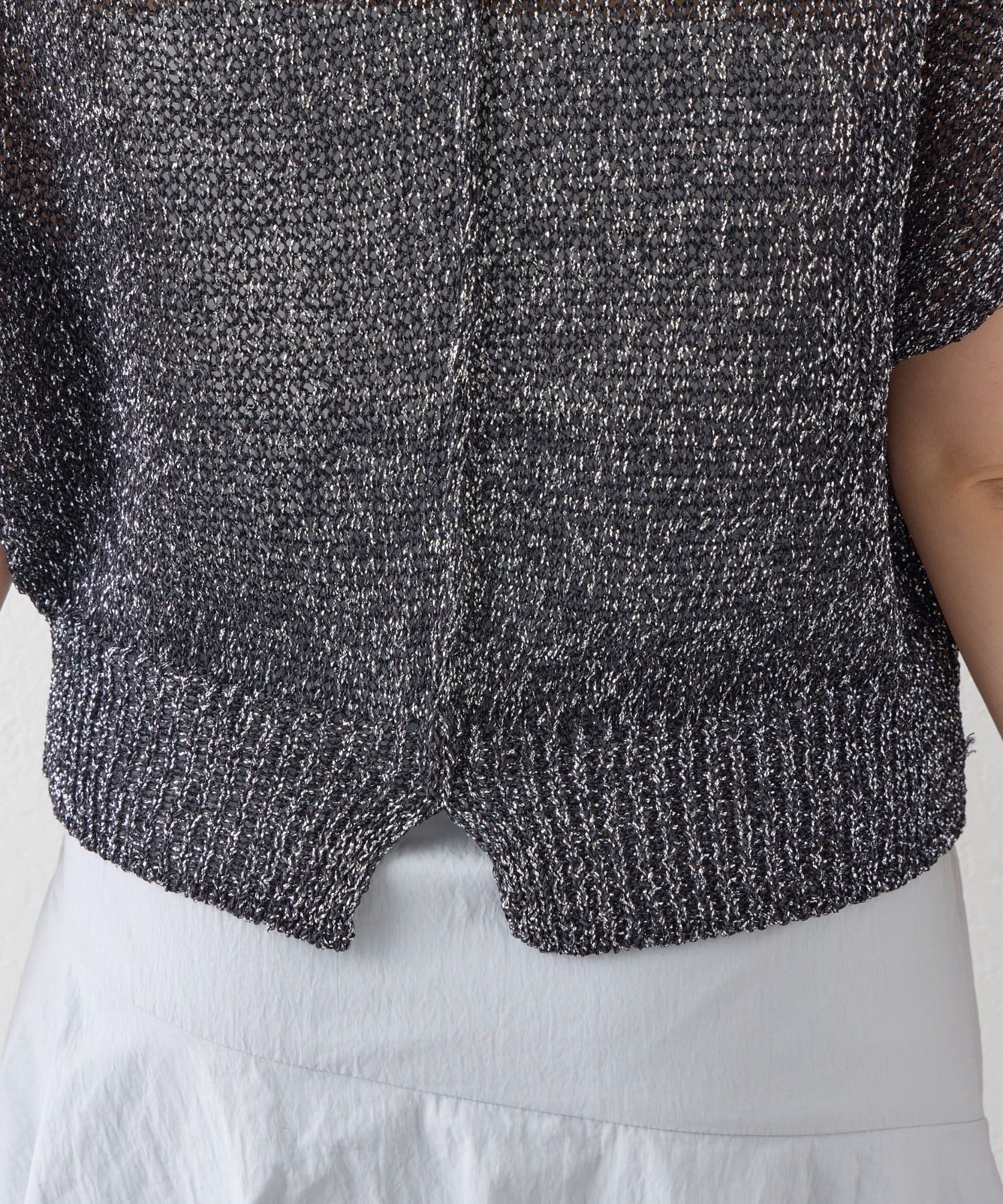 ざっくりとした透け感のある編地に、きらきらラメをプラスした存在感のあるニット。