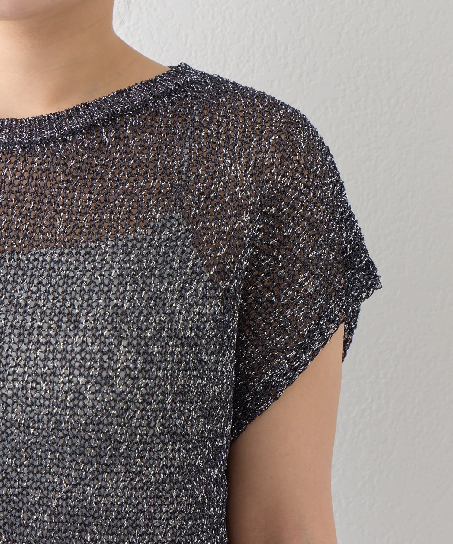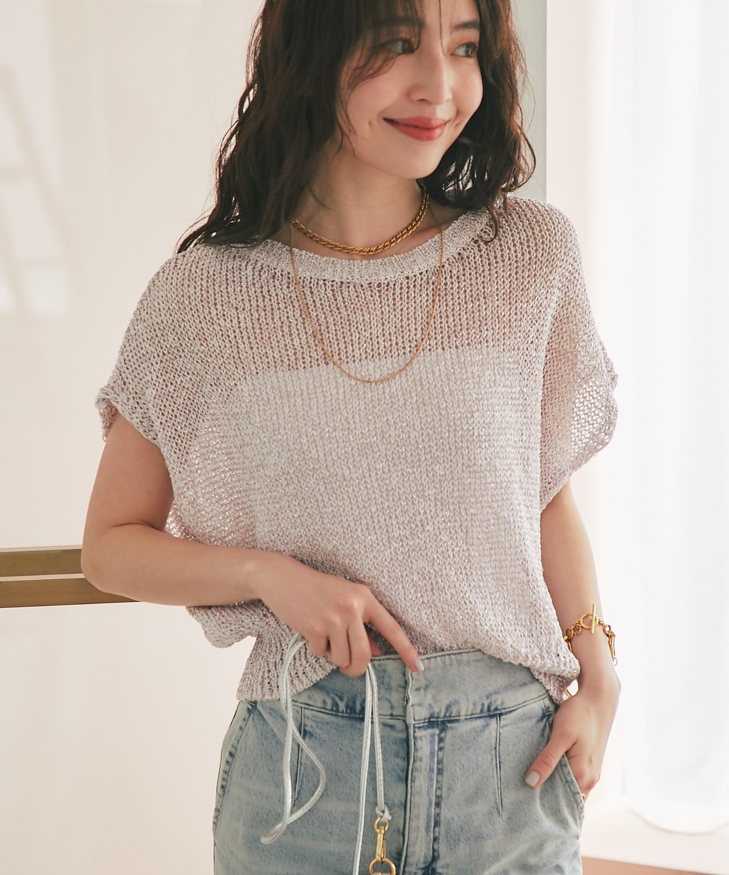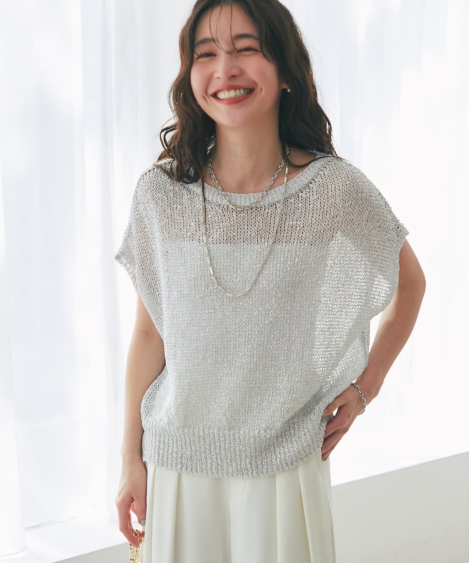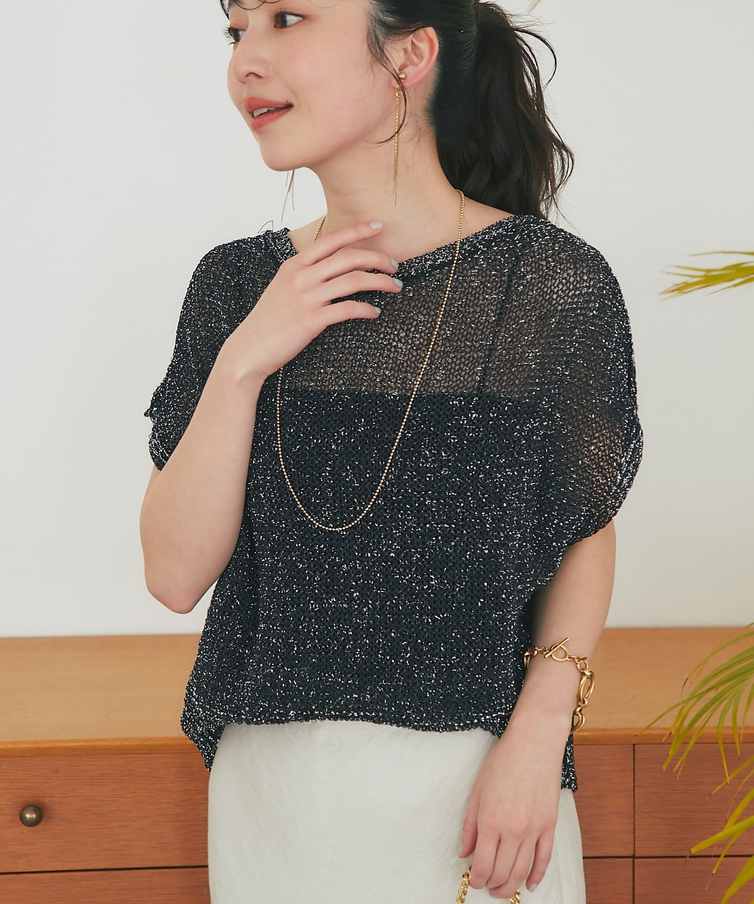 ざっくりとした透け感のある編地に、きらきらラメをプラスした存在感のあるニット。