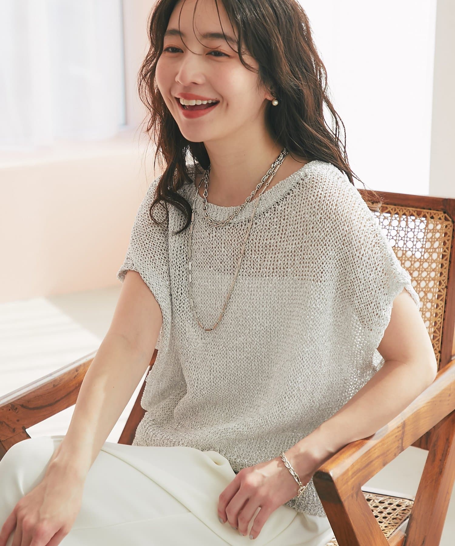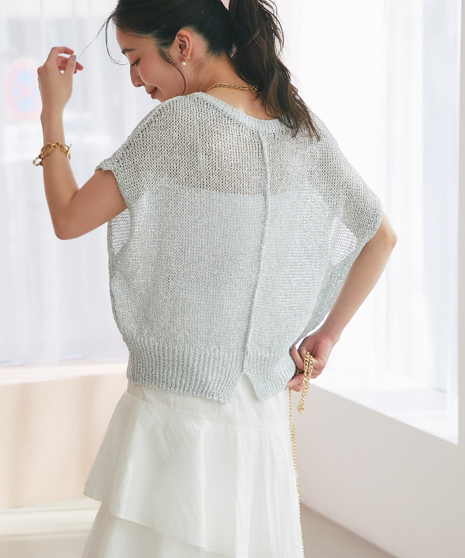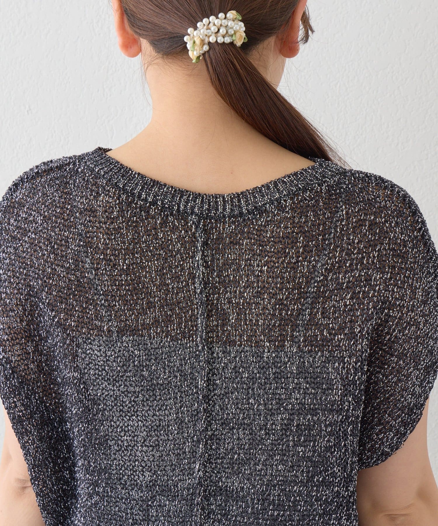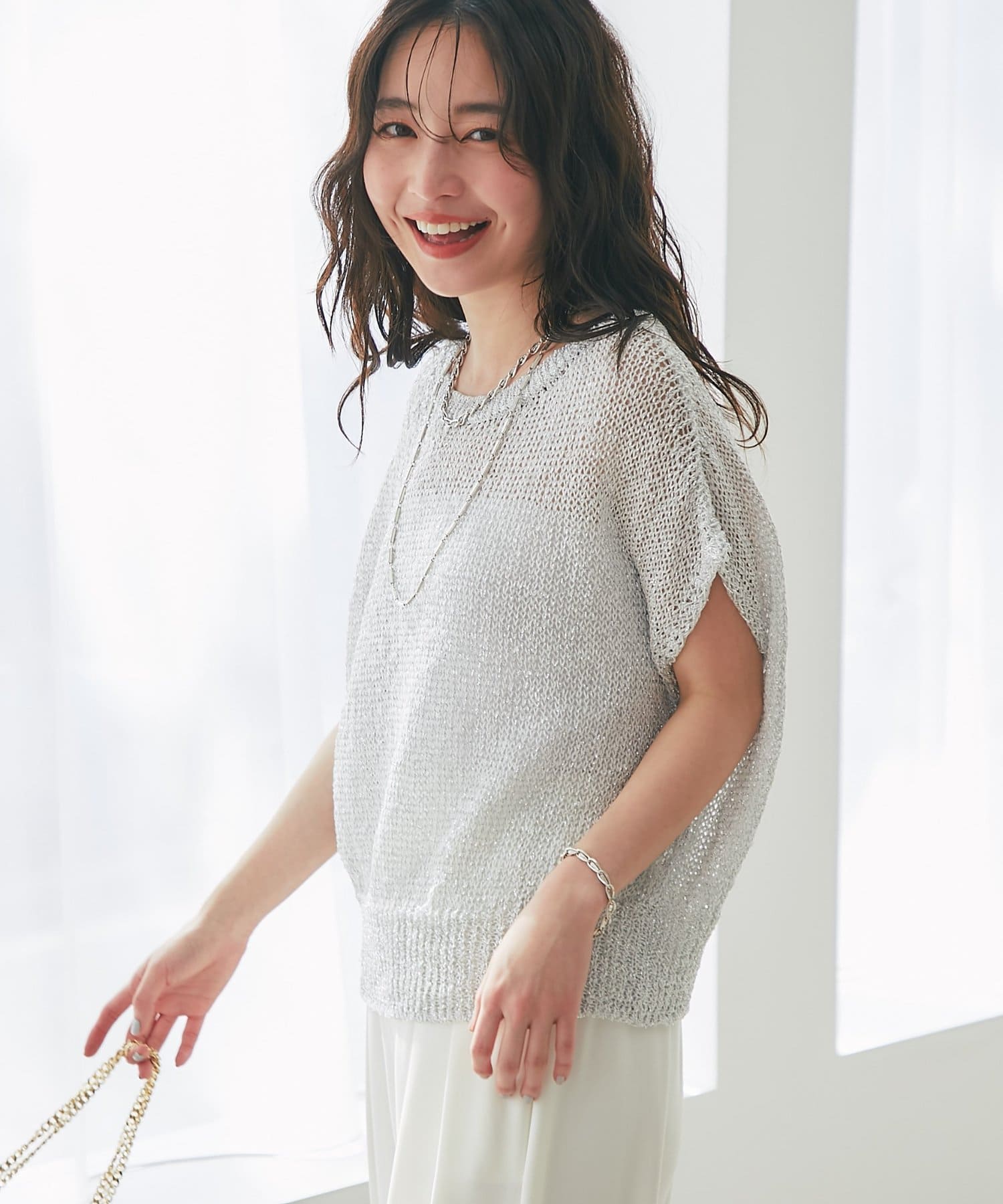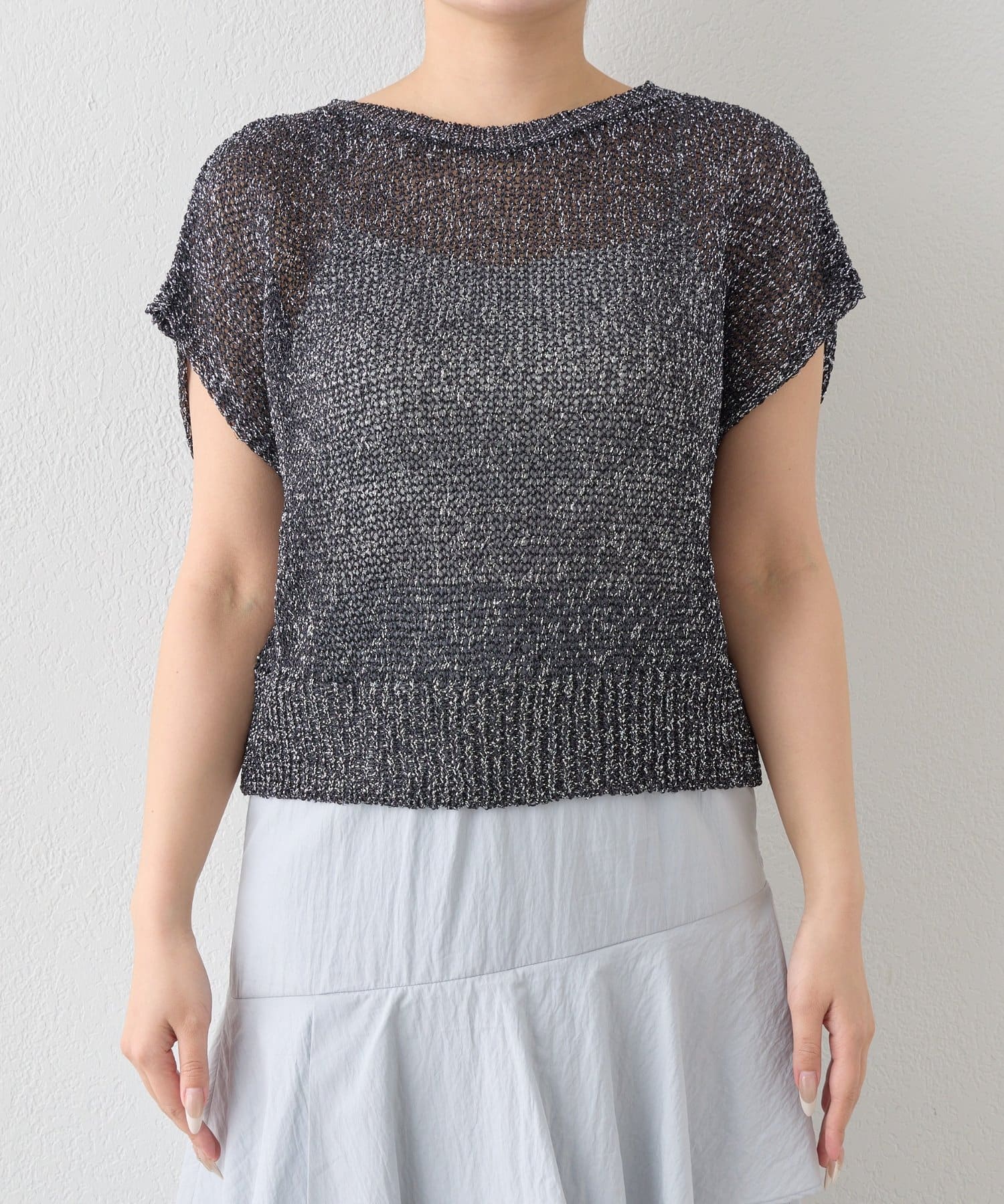 ざっくりとした透け感のある編地に、きらきらラメをプラスした存在感のあるニット。