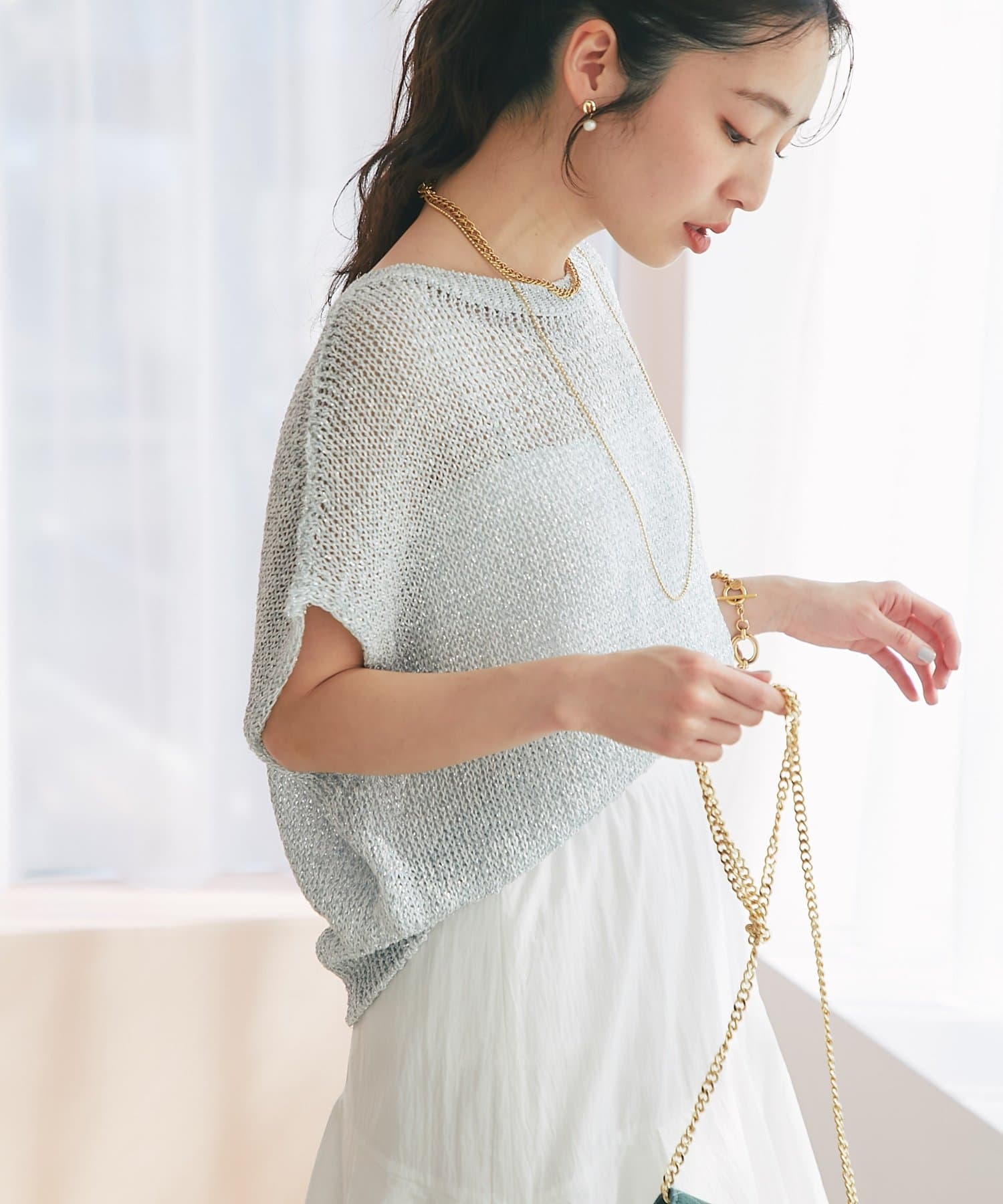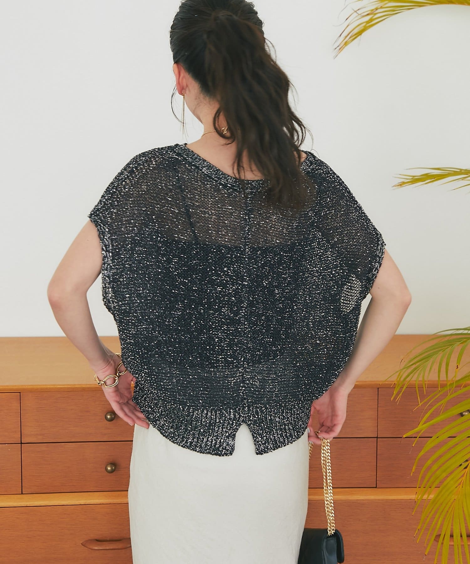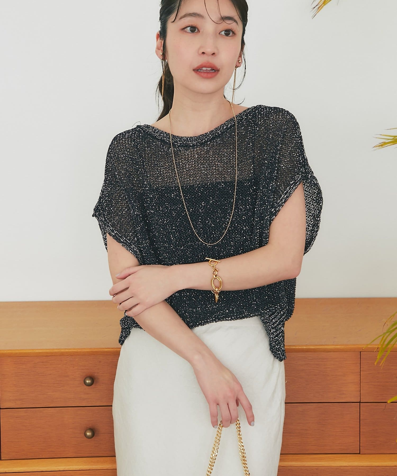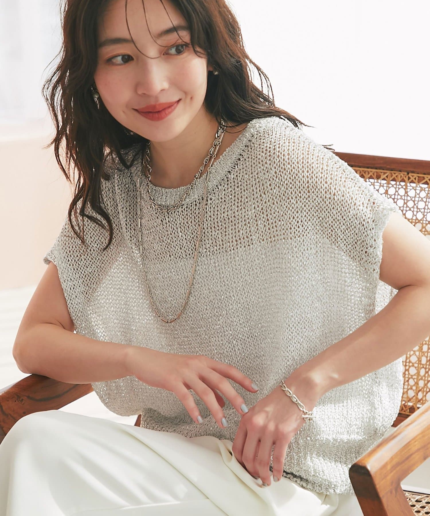 ざっくりとした透け感のある編地に、きらきらラメをプラスした存在感のあるニット。